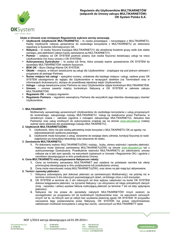 Umowa o świadczenie usług System Polska Regulamin dla UżytkownikówOK MULTIKARNETÓW (załącznik do Umowy zakupu MULTIKARNETÓW) OK System Polska S.A. Użyte w Umowie oraz niniejszym Regulaminie wybrane zwroty oznaczają: Użytkownik (Użytkownik MULTIKARNETU) – to osoba posiadająca i korzystająca z MULTIKARNETU. Każdy Użytkownik nabywa uprawnienia do osobistego korzystania z MULTIKARNETU po dokonaniu rejestracji w Systemie Informatycznym OK. Nabywca – to osoba fizyczna kupująca MULTIKARNET(Y) dla określonej liczebnie grupy osób (lub siebie samego), jest płatnikiem całości kwoty zamówienia za MULTIKARNET(Y). Partner – odrębny od OK SYSTEM podmiot prawny (lub osoba fizyczna) świadczący usługi na rzecz Użytkowników (na mocy umowy z OK SYSTEM). Autoryzowany Dystrybutor – to osoba lub firma, która posiada ważne upoważnienie OK SYSTEM do sprzedaży MULTIKARNETÓW osobom fizycznym. BOK OK – Biuro Obsługi Klienta OK SYSTEM. Obiekt – miejsce, w którym świadczone są usługi dla Użytkowników - znajdujące się pod jednym adresem i przypisane do jednego Partnera. Numer miejsca lub usługi – specjalne numery, unikatowe dla każdego miejsca i usługi, nadane przez OK SYSTEM udostępnione do wglądu dla Użytkowników w recepcjach obiektów (na Terminalach oraz w informacjach drukowanych), służące do prawidłowej rejestracji wejść Użytkowników. Usługa – usługa świadczona przez Partnera na rzecz Użytkowników objęta konkretnym MULTIKARNETEM. Umowa – umowa zawarta między konkretnym Nabywcą a OK SYSTEM w zakresie zakupu MULTIKARNETÓW. Regulamin OK – niniejszy regulamin. Regulamin Partnera – regulamin wewnętrzny Partnera dla wszystkich jego klientów obowiązujący również Użytkowników. 1. MULTIKARNETY: Multikarnety upoważniają uprawnionych Użytkowników do osobistego korzystania z usług przypisanych do konkretnego, zakupionego rodzaju MULTIKARNETU. Usługi są świadczone przez Partnerów, w określonym czasie i zakresie (zgodnie z rodzajem zakupionego MULTIKARNETU). Aktualna lista Partnerów oraz usług możliwych do wykorzystania znajduje się na stronie www.oksystem.pl (należy wybrać dane właściwe dla posiadanego rodzaju MULTIKARNETU). 2. Użytkownik MULTIKARNETU(ÓW): 1. Użytkownik, który nie jest osobą pełnoletnią może korzystać z MULTIKARNETU OK za zgodą i na odpowiedzialność opiekuna prawnego. 2. Użytkownik może korzystać z usług stosownie do swojego stanu zdrowia, kondycji fizycznej (w razie wątpliwości po konsultacji lekarskiej) oraz stosownie do wieku. 3. Zamówienie MULTIKARNETU: 1. Po dokonaniu wyboru MULTIKARNETU(ÓW): rodzaju, liczby, okresu ważności i sposobu płatności, Nabywca może dokonać zamówienia MULTIKARNETU(ÓW) na stronie www.oksystem.pl; lub u autoryzowanego Dystrybutora. Przedłużenie ważności MULTIKARNETU po zakończeniu umowy odbywa się w taki sam sposób, na warunkach (opisanych w Umowie i Regulaminie OK) i zgodnie z cennikiem obowiązującym w dniu przedłużenia Umowy. 4. Cena MULTIKARNETU oraz przyznawane Nabywcom rabaty: 1. Cena za konkretny zamawiany MULTIKARNET jest ustalana na podstawie cennika lub oferty promocyjnej obowiązującej w dniu podpisywania lub przedłużania umowy. 2. Cenę może warunkować rodzaj MULTIKARNETU(ÓW), oraz okres na jaki mają być aktywowane. 5. Termin i sposoby płatności: 1. Nabywca zobowiązany jest dokonać płatności za zamówiony(e) Multikarnet(y), nie później niż w terminie minimum 5 dni roboczych poprzedzających dzień, od którego chce z nich korzystać. 2. OK SYSTEM w terminie do 3 dni roboczych od dnia wpływu należności na konto OK SYSTEM dokona księgowania płatności; na życzenie Nabywcy i po otrzymaniu od niego potrzebnych danych (imię , nazwisko i adres) wystawi fakturę rozliczającą płatność (w terminie 7 dni od daty wpłynięcia płatności). 3. Nabywca nie ma prawa do sprzedaży nabytych MULTIKARNETÓW innym osobom (w szczególności: po przypisaniu ich do konkretnych Użytkowników oraz na warunkach cenowych innych niż te, na których sam je nabył) bez uzyskania pisemnej zgody OK SYSTEM. W przypadku naruszenia tego postanowienia przez Nabywcę, OK SYSTEM ma prawo natychmiastowo zablokować możliwość korzystania z usług bez zwrotu uiszczonych za MULTIKARNETY opłat. NOF 1/2014 wersja obowiązująca od 01-09-2014 r. Umowa o świadczenie usług System Polska Regulamin dla UżytkownikówOK MULTIKARNETÓW (załącznik do Umowy zakupu MULTIKARNETÓW) OK System Polska S.A. 6. Przypisanie osób uprawnionych do korzystania – Użytkowników do zamówionego(ych) MULTIKARNET(ÓW): 1. Korzystanie z opłaconego i zakupionego MULTIKARNETU jest możliwe po przypisaniu do niego Użytkownika. Brak takiego przypisania nie zwalnia Nabywcy z uiszczenia opłat za zamówione MULTIKARNETY, zgodnie z zawartą umową. W tym celu Nabywca może: a. Dokonać przypisania Użytkownika w Systemie Informatycznym OK na stronie www.oksystem.pl podając minimum: imię i nazwisko; prawidłowe (nie zawierające błędów) numery telefonów komórkowych oraz prawidłowe (nie zawierające błędów) adresy e-mail wybranych osób. b. Skorzystać z pomocy BOK (Biura Obsługi Klienta – adres e-mail oraz kontakt telefoniczny dostępny na stronie www.oksystem.pl. 2. Każdy Użytkownik przed udostępnieniem mu możliwości korzystania z MULTIKARNETU musi zaakceptować bez zastrzeżeń Regulamin OK (dostępny również na stronie www.oksystem.pl). Nabywca zobowiązuje się do zapoznania z Regulaminem OK osób, które przypisał w Systemie Informatycznym OK, z pkt. 1 powyżej. Nabywca nie może dokonywać zmian Użytkowników przypisanych do MULTIKARNETÓW w trakcie trwania umowy. Zmiana danych Użytkownika (np. numer telefonu komórkowego) odbywa się wyłącznie poprzez Biuro Obsługi Klienta, na uzasadniony wniosek (zagubienie telefonu, trwała zmiana numeru) przesłany pocztą elektroniczną na adres [email protected] 7. Przekazanie z