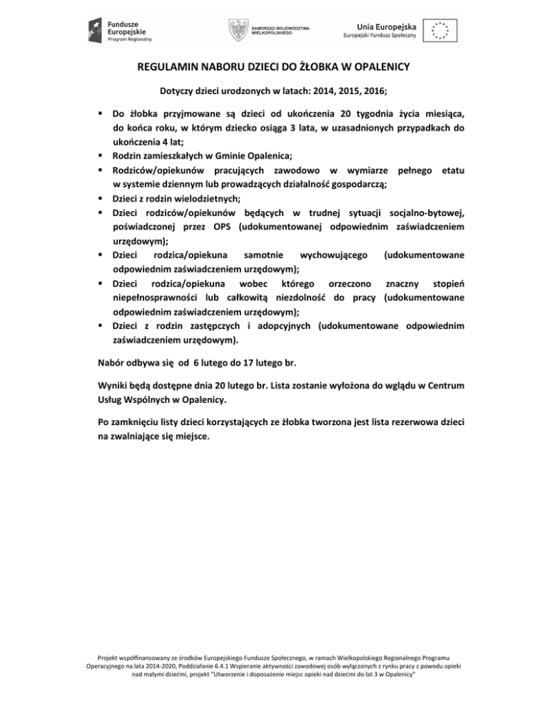 REGULAMIN NABORU DZIECI DO ŻŁOBKA W OPALENICY Dotyczy dzieci urodzonych w latach: 2014, 2015, 2016; Do żłobka przyjmowane są dzieci od ukończenia 20 tygodnia życia miesiąca, do końca roku, w którym dziecko osiąga 3 lata, w uzasadnionych przypadkach do ukończenia 4 lat; Rodzin zamieszkałych w Gminie Opalenica; Rodziców/opiekunów pracujących zawodowo w wymiarze pełnego etatu w systemie dziennym lub prowadzących działalność gospodarczą; Dzieci z rodzin wielodzietnych; Dzieci rodziców/opiekunów będących w trudnej sytuacji socjalno-bytowej, poświadczonej przez OPS (udokumentowanej odpowiednim zaświadczeniem urzędowym); Dzieci rodzica/opiekuna samotnie wychowującego (udokumentowane odpowiednim zaświadczeniem urzędowym); Dzieci rodzica/opiekuna wobec którego orzeczono znaczny stopień niepełnosprawności lub całkowitą niezdolność do pracy (udokumentowane odpowiednim zaświadczeniem urzędowym); Dzieci z rodzin zastępczych i adopcyjnych (udokumentowane odpowiednim zaświadczeniem urzędowym). Nabór odbywa się od 6 lutego do 17 lutego br. Wyniki będą dostępne dnia 20 lutego br. Lista zostanie wyłożona do wglądu w Centrum Usług Wspólnych w Opalenicy. Po zamknięciu listy dzieci korzystających ze żłobka tworzona jest lista rezerwowa dzieci na zwalniające się miejsce. Projekt współfinansowany ze środków Europejskiego Fundusze Społecznego, w ramach Wielkopolskiego Regionalnego Programu Operacyjnego na lata 2014-2020, Poddziałanie 6.4.1 Wspieranie aktywności zawodowej osób wyłączonych z rynku pracy z powodu opieki nad małymi dziećmi, projekt "Utworzenie i doposażenie miejsc opieki nad dziećmi do lat 3 w Opalenicy" Kryteria i punkty kwalifikujące dziecko do przyjęcia do Żłobka w Opalenicy KRYTERIA Wartość punktowa Dziecko na stałe zamieszkałe w Gminie Opalenica 50 Dziecko na stałe zamieszkałe poza Gminą 1 Opalenica 3. Dziecko wychowywane przez samotnego1 rodzica 20 lub opiekuna prawnego pracującego, studiującego, uczącego się 4. Dziecko wychowywane przez samotnego rodzica 1 lub opiekuna prawnego nie pracującego, nie studiującego, nie uczącego się 5. Dziecko, którego rodzice/opiekunowie prawni 18 pracują, studiują, uczą się w trybie dziennym 6. Dziecko, którego jeden z rodziców/opiekunów 9 prawnych pracuje, studiuje, uczy się w trybie dziennym 7. Dziecko, którego rodzice/opiekunowie prawni nie 1 pracują, nie studiują, nie uczą się w trybie dziennym 8. Dziecko rodziców/opiekunów prawnych, którzy 15 oboje mają orzeczony znaczny lub umiarkowany stopień niepełnosprawności, bądź równoważnym stopniem niepełnosprawności2 9. Dziecko, którego jeden z rodziców ma orzeczony 6 znaczny lub umiarkowany stopień niepełnosprawności, bądź równoważny stopień niepełnosprawności 10 Dziecko, które będzie przebywało w żłobku 10 powyżej 5-ciu godzin dziennie i korzystało ze wszystkich posiłków 11. Dziecko które będzie przebywało w żłobku poniżej 1 5-ciu godzin dziennie i nie będzie korzystało ze wszystkich posiłków 12 Dziecko rodzica korzystającego z pomocy OPS 5 13 Dziecko, którego rodzeństwo ma orzeczony znaczny 5 lub umiarkowany stopień niepełnosprawności, zamieszkujące wspólnie na stałe 14. Dziecko, które ma dwoje lub więcej rodzeństwa, 5 zamieszkującego na stałe 1. 2. Projekt współfinansowany ze środków Europejskiego Fundusze Społecznego, w ramach Wielkopolskiego Regionalnego Programu Operacyjnego na lata 2014-2020, Poddziałanie 6.4.1 Wspieranie aktywności zawodowej osób wyłączonych z rynku pracy z powodu opieki nad małymi dziećmi, projekt "Utworzenie i doposażenie miejsc opieki nad dziećmi do lat 3 w Opalenicy" 1 Przez dziecko wychowywane przez samotnego rodzica lub opiekuna prawnego rozumie się dziecko wychowywane przez pannę, kawalera, wdowę ,wdowca lub osobę pozostającą w separacji orzeczonej prawomocnym wyrokiem sądu, osobę rozwiedzioną, chyba, że wychowuje wspólnie co najmniej jedno dziecko jego rodzicem bądź osobę samotną, której powierzono opiekę nad dzieckiem. 2 Równoważność stopni niepełnosprawności: Znaczny stopień niepełnosprawności: 1) Orzeczenie o zaliczeniu do I grupy inwalidów traktowane jest na równi z orzeczeniem o znacznym stopniu niepełnosprawności; 2) Orzeczenie lekarza orzecznika Zakładu Ubezpieczeń Społecznych o: - całkowitej niezdolności do pracy, ustalone na podstawie art. 12 ust.2 i niezdolności do samodzielnej egzystencji, ustalone na podstawie art.13 ust.5 ustawy z dnia 17 grudnia 1998 r. o emeryturach i rentach z Funduszu Ubezpieczeń Społecznych traktowane jest na równi z orzeczeniem o znacznym stopniu niepełnosprawności; - niezdolności do samodzielnej egzystencji, ustalone na podstawie art.13 ust. 5 wyżej wymienionej ustawy, jest traktowane na równi z orzeczeniem o znacznym stopniu niepełnosprawności. Umiarkowany stopień niepełnosprawności: 1) Orzeczenie o zaliczeniu do II grupy inwalidów traktowane jest na równi z orzeczeniem o umiarkowanym stopniu niepełnosprawności; 2) Orzeczenie lekarza orzecznika Zakładu Ubezpieczeń Społecznych o: - całkowitej niezdolności do pracy, ustalone na podstawie art.12 ust.2 wyżej wymienionej ustawy, jest traktowane na równi z orzeczeniem o umiarkowanym stopniu niepełnosprawności. Projekt współfinansowany ze środków Europejskiego Fundusze Społecznego, w ramach Wielkopolskiego Regionalnego Programu Operacyjnego na lata 2014-2020, Poddziałanie 6.4.1 Wspieranie aktywności zawodowej osób wyłączonych z rynku pracy z powodu opieki nad małymi dziećmi, projekt "Utworzenie i doposażenie miejsc opieki nad dziećmi do lat 3 w Opalenicy"