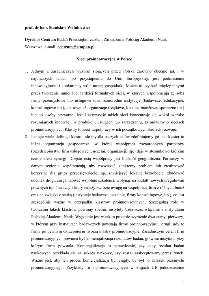 prof. dr hab. Stanisław Walukiewicz Dyrektor Centrum Badań Przedsiębiorczości i Zarządzania Polskiej Akademii Nauk Warszawa, e-mail: [email protected] Sieci proinnowacyjne w Polsce 1. Jednym z zasadniczych wyzwań stojących przed Polską zarówno obecnie jak i w najbliższych latach, po przystąpieniu do Unii Europejskiej, jest podniesienie innowacyjności i konkurencyjności naszej gospodarki. Można to uzyskać między innymi przez tworzenie mniej lub bardziej formalnych sieci, w których współpracują ze sobą firmy przemysłowe lub usługowe oraz różnorodne instytucje (badawcze, edukacyjne, konsultingowe itp.), jak również organizacje (rządowe, lokalne, branżowe, społeczne itp.) lub też osoby prywatne. Jeżeli aktywność takich sieci koncentruje się wokół szeroko rozumianych innowacji w produkcji, usługach lub zarządzaniu, to mówimy o sieciach proinnowacyjnych. Klastry to sieci współpracy w ich początkowych stadiach rozwoju. 2. Istnieje wiele definicji klastra, ale my dla naszych celów zdefiniujemy go tak: klaster to luźna organizacja gospodarcza, w której współpraca różnorodnych partnerów (przedsiębiorstw, firm usługowych, uczelni, organizacji, itp.) daje w stosunkowo krótkim czasie efekt synergii. Często osią współpracy jest bliskość geograficzna. Partnerzy w danym regionie współpracują, aby rozwiązać konkretny problem lub zrealizować korzystne dla grupy przedsięwzięcie, np. zmniejszyć lokalne bezrobocie, zbudować odcinek drogi, zorganizować wspólnie szkolenia, wpłynąć na kształt nowych uregulowań prawnych itp. Tworząc klastry należy zwrócić uwagę na współpracę firm z różnych branż oraz na związki z nauką (instytucje badawcze, uczelnie, firmy konsultingowe, itp.), co jest szczególnie ważne w przypadku klastrów proinnowacyjnych. Szczególną rolę w tworzeniu takich klastrów powinny spełnić instytuty badawcze, włącznie z instytutami Polskiej Akademii Nauk. Wygodnie jest w takim procesie wyróżnić dwa etapy: pierwszy, w którym przy instytutach badawczych powstają firmy proinnowacyjne i drugi, gdy te firmy po pewnym okrzepnięciu tworzą klastry proinnowacyjne. Zasadniczym celem firm proinnowacyjnych powinna być komercjalizacja rezultatów badań, głównie instytutu, przy którym firma powstała. Komercjalizacja to sprawdzenie, czy dany rezultat badań naukowych przekłada się na sukces rynkowy, czy został zaakceptowany przez rynek. Ważne jest, aby ten proces komercjalizacji był ciągły, by był to zalążek przemysłu proinnowacyjnego. Przykłady firm proinnowacyjnych w krajach UE jednoznacznie 1 dowodzą, że taka działalność jest wysoce opłacalna, firmy te szybko zwróciły nakłady, zwykle niewielkie, niezbędne do ich rozruchu i zaczęły zarabiać, wspomagając między innymi instytuty badawcze, przy których są afiliowane. 3. Rekomendacje i wnioski Ostatnie kilkanaście lat jednoznacznie wskazują, że polska gospodarka jest zbyt słaba i zbyt przeregulowana, by sama z siebie mogła stać się gospodarką innowacyjną, odnoszącą sukcesy na światowych rynkach, a na Jednolitym Rynku Unii Europejskiej w szczególności. Zauważmy, że wszystkie państwa, poważni uczestnicy globalnych procesów gospodarczych mają mniej lub bardziej rozbudowane programy wzmocnienia innowacyjności swoich gospodarek. We wszystkich dotychczasowych Programach Ramowych Unii Europejskiej, łącznie z rozpoczynającym się w przyszłym roku 6. Programem Ramowym, zagadnienie innowacyjności unijnej gospodarki jest stawiane na czołowym miejscu. Dzisiaj szeroko rozumiana innowacyjność w produkcji, usługach czy zarządzaniu jest w zasadzie jedynym źródłem przewagi konkurencyjnej i ponadprzeciętnych zysków. Aby polska gospodarka odniosła więcej sukcesów na tej drodze naszym zdaniem należy: a. Wspomagać powstawanie klastrów, szczególnie klastrów proinnowacyjnych. O Polsce często mówi się jako kraju o niebywałej przedsiębiorczości, gdyż na 38 milionów mieszkańców mamy prawie 3 miliony małych i średnich przedsiębiorstw. Niestety znakomita większość z tych firm, to firmy bardzo małe, zatrudniające od 1 do 5 osób, firmy słabe ekonomicznie, które nie są w stanie podjąć się jakichkolwiek innowacji. Co więcej w ostatnim dziesięcioleciu bardzo osłabł proces łączenia się firm małych w większe organizmy zdolne do konkurowania w globalnej gospodarce, na Jednolitym Rynku UE. Klastry, w tym klastry proinnowacyjne, mogą być jednym z możliwych rozwiązań tego problemu. Jest oczywiste, że klaster po osiągnięciu pewnego szczebla rozwoju przekształca się w prawdziwą firmę, zdolną konkurować na globalnym rynku. Zauważmy, że proces ten jest stosunkowo tani i można go rozpocząć bez zbędnych formalności. Proces ten wzmacnia demokrację lokalną i struktury demokratyczne. b. Zrównoważyć gospodarkę. Ostatnie dziesięciolecia jednoznacznie dowodzą, że sukcesy w globalnej konkurencji odnoszą gospodarki, w których rozwijają się zarówno duże przedsiębiorstwa, często ponadnarodowe firmy, jak też małe i średnie przedsiębiorstwa. Inaczej mówiąc gospodarka odnosząca dziś sukcesy w świecie to odpowiednia kompozycja dużych i małych firm. Obecnie w 2 Polsce jest niewiele dużych firm, które przy ogromnym wysiłku z ich strony mogą w najbliższych latach liczyć się w globalnej konkurencji. Oznacza to, że należy wspomagać procesy powstawania dużych silnych gospodarczo firm. Jednym z możliwych rozwiązań tego problemu są klastry, z których mogą powstać najpierw firmy średnie, zorientowane na innowacje i nowocześnie zarządzane, które w krótkim czasie staną się poważnym partnerem w globalnej gospodarce. Firma Benetton jest przykładem, iż można w ciągu kilku lat przejść od rodzinnej firmy robiącej swetry na drutach do światowego potentata w przemyśle odzieżowym. Jeżeli procesy powstawania klastrów wesprze się uwolnieniem g