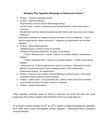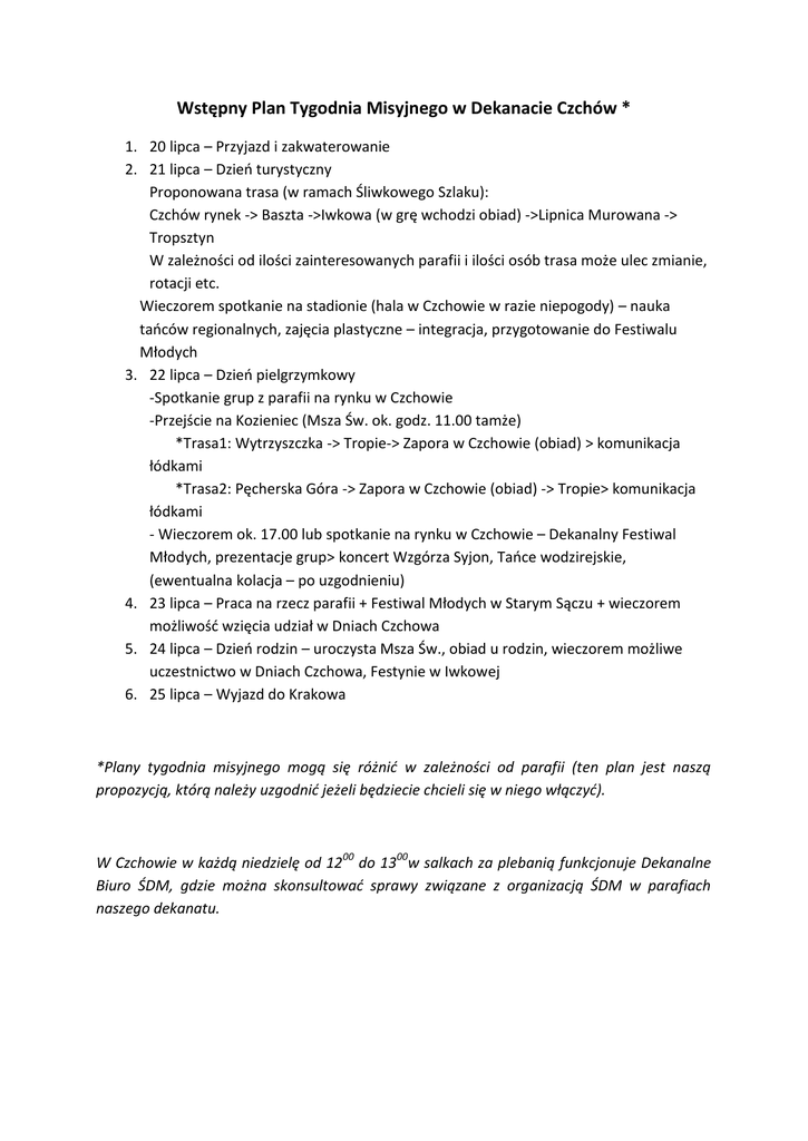 Wstępny Plan Tygodnia Misyjnego w Dekanacie Czchów * 1. 20 lipca – Przyjazd i zakwaterowanie 2. 21 lipca – Dzień turystyczny Proponowana trasa (w ramach Śliwkowego Szlaku): Czchów rynek -> Baszta ->Iwkowa (w grę wchodzi obiad) ->Lipnica Murowana -> Tropsztyn W zależności od ilości zainteresowanych parafii i ilości osób trasa może ulec zmianie, rotacji etc. Wieczorem spotkanie na stadionie (hala w Czchowie w razie niepogody) – nauka tańców regionalnych, zajęcia plastyczne – integracja, przygotowanie do Festiwalu Młodych 3. 22 lipca – Dzień pielgrzymkowy -Spotkanie grup z parafii na rynku w Czchowie -Przejście na Kozieniec (Msza Św. ok. godz. 11.00 tamże) *Trasa1: Wytrzyszczka -> Tropie-> Zapora w Czchowie (obiad) > komunikacja łódkami *Trasa2: Pęcherska Góra -> Zapora w Czchowie (obiad) -> Tropie> komunikacja łódkami - Wieczorem ok. 17.00 lub spotkanie na rynku w Czchowie – Dekanalny Festiwal Młodych, prezentacje grup> koncert Wzgórza Syjon, Tańce wodzirejskie, (ewentualna kolacja – po uzgodnieniu) 4. 23 lipca – Praca na rzecz parafii + Festiwal Młodych w Starym Sączu + wieczorem możliwość wzięcia udział w Dniach Czchowa 5. 24 lipca – Dzień rodzin – uroczysta Msza Św., obiad u rodzin, wieczorem możliwe uczestnictwo w Dniach Czchowa, Festynie w Iwkowej 6. 25 lipca – Wyjazd do Krakowa *Plany tygodnia misyjnego mogą się różnić w zależności od parafii (ten plan jest naszą propozycją, którą należy uzgodnić jeżeli będziecie chcieli się w niego włączyć). W Czchowie w każdą niedzielę od 1200 do 1300w salkach za plebanią funkcjonuje Dekanalne Biuro ŚDM, gdzie można skonsultować sprawy związane z organizacją ŚDM w parafiach naszego dekanatu.