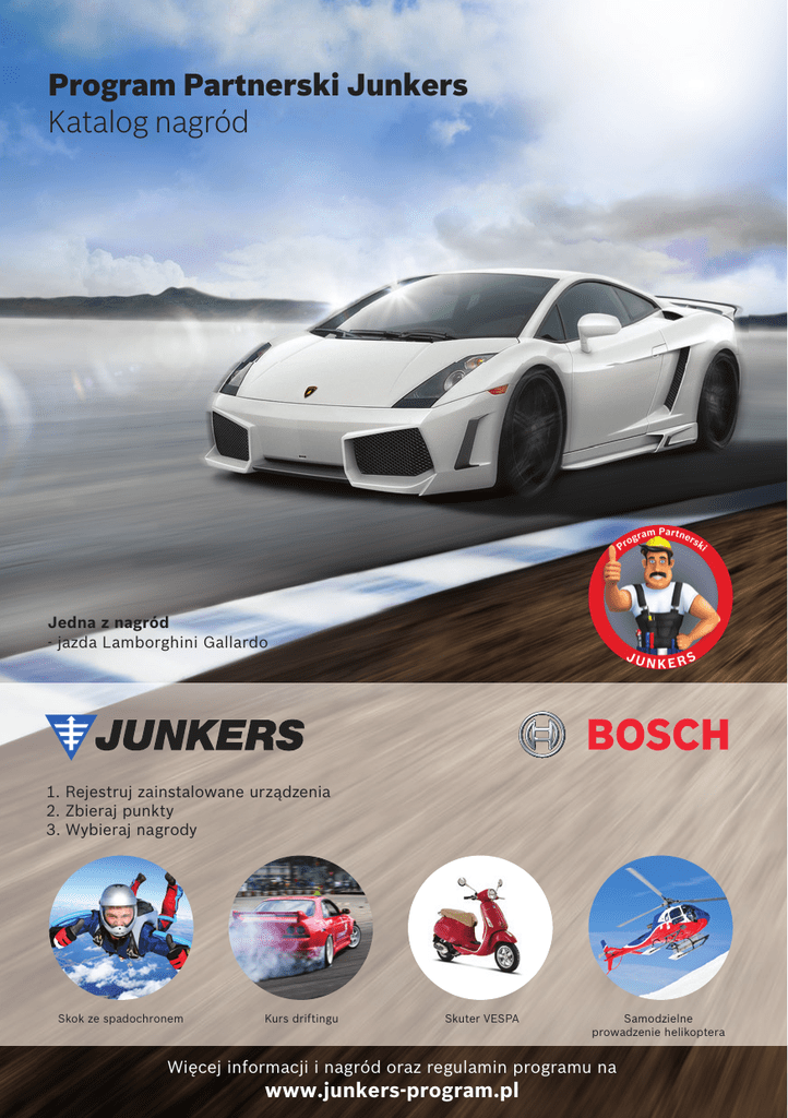 Program Partnerski Junkers Katalog nagród Jedna z nagród - jazda Lamborghini Gallardo 1. Rejestruj zainstalowane urządzenia 2. Zbieraj punkty 3. Wybieraj nagrody Skok ze spadochronem Kurs driftingu Skuter VESPA Samodzielne prowadzenie helikoptera Więcej informacji i nagród oraz regulamin programu na www.junkers-program.pl 2 Katalog nagród Zapraszamy do udziału w Programie Partnerskim Junkers Jest to jedna z form wsparcia i gratyfikacji pracy Instalatorów. Jego uczestnikami mogą być osoby lub firmy zajmujące się zarobkowo instalacją i/lub serwisem urządzeń grzewczych. Najważniejsze informacje: Start: 03.2016 Zakończenie: program długofalowy, bez określonej daty zakończenia Dla kogo: wszyscy Instalatorzy (montujący urządzenia grzewcze Junkers) Logowanie: wszystkie operacje możliwe są na platformie Programu: www.junkers-program.pl Katalog nagród 3 Zasady 1 Zainstaluj urządzenie Junkers Zanotuj lub od razu zeskanuj* numer identyfikacyjny urządzenia. 2 Zbieraj punkty Do poszczególnych typów urządzeń przypisana jest określona ilość punktów. Punkty zbiera się rejestrując urządzenia: ▶na platformie www.junkers-program.pl lub ▶poprzez aplikację mobilną* W Programie mogą być rejestrowane urządzenia z kodem FD ≥ 517 oraz zainstalowane po 01.01.2016. 3 Wymieniaj punkty na atrakcyjne nagrody Punkty są ważne przez 2 lata od daty rejestracji urządzenia. Po tym terminie zostają anulowane i nie jest możliwa ich wymiana na nagrody. * Aplikacja mobilna do skanowania numerów identyfikacyjnych urządzeń będzie dostępna wkrótce. 4 Katalog nagród Nagrody W katalogu znajdują się nagrody o różnej wartości punktów, które przypisane są do kategorii: ▶Extra ▶ Czas wolny ▶Dom ▶Praca W zależności od indywidualnych potrzeb można zdecydować się na nagrodę o niższej wartości punktowej lub konsekwentnie gromadzić punkty na wybraną nagrodę o dużo wyższej wartości. Katalog nagród jest aktualizowany w czasie trwania Programu. Będziemy dokładać wszelkich starań, aby znajdowały się w nim wyłącznie najnowocześniejsze produkty i porywające wydarzenia. Wybór nagród jest tak szeroki, że z pewnością każdy znajdzie coś dla siebie. Zapraszamy do zapoznania się z wybranymi nagrodami w poszczególnych kategoriach. Opisy wszystkich nagród dostępnych w Programie znajdują się na www.junkers-program.pl Katalog nagród EXTRA 5 6 Katalog nagród Jazda Lamborghini Gallardo Miejsce: Tor Poznań Dystans: 8 lub 16 km Podaruj sobie najlepszy prezent motoryzacyjny! Za kierownicą Lamborghini Gallardo poczujesz się jak profesjonalny kierowca wyścigowy. Po zapoznaniu się z samochodem, odbędziesz szkolenie na temat bezpieczeństwa. Wspaniały Lamborghini Gallardo to stosunkowo niewielkie, dwumiejscowe auto. Jego wyjątkowość wynika z wykorzystania klasycznej dla sportowych aut technologii stałego napędu na cztery koła, a ponadto zamontowania silnika o ogromnej mocy. Zastosowany system ESP zapewnia stabilizację na tylnej osi, a na przedniej niesamowitą precyzję podczas wchodzenia w zakręt, co dodatkowo zwiększa sportowy charakter auta i przyjemność kierowania nim. Konstruktorzy marki Lamborghini postawili sobie za cel, aby w Gallardo wszystkie elementy były idealnie dostosowane do jego dynamiki jazdy, m.in. sprężyny, amortyzatory, stabilizatory, a nawet opony. Zadbano także o odpowiednią aerodynamikę, uwzględniając zmiany dopływu mocy. To wszystko sprawia, że jazda tym modelem stanowi niesamowite przeżycie i pozostawia niezapomniane wrażenia. pkt. od 690 Katalog nagród 7 Kurs Bezpiecznej Jazdy Miejsce: Warszawa Czas trwania: kursy jednodniowe Akademia Bezpiecznej Jazdy to miejsce, gdzie każdy kierowca może podnosić swoje kwalifikacje z zakresu bezpieczeństwa i pewności prowadzenia samochodu. Do wyboru kursy nauki kontroli poślizgu o różnym stopniu zaawansowania. pkt. od 290 Jazda 4x4 Miejsce: Centrum Rekreacji Aktywnej w Białym Kościele/ k. Krakowa Czas trwania: 1 godz. 30 min. Jazda w charakterze kierowcy pod czujnym okiem instruktora po specjalnych torach, na których odbywają się rajdy 4x4. Potem można zająć miejsce pilota i podziwiać umiejętności kierowcy rajdowego 4x4. Pasażerowie są mile widziani – możliwość zabrania do 3 osób. pkt. 265 8 Katalog nagród Rajdowa Jazda Subaru Miejsce: Warszawa – lotnisko Bemowo Czas trwania: 90 min (60 min za kierownicą) Szkolenie, w którym doświadczysz prawdziwej sportowej jazdy legendarnym Subaru Impreza na płycie lotniska. Moc ponad 300 KM, napęd na cztery koła, zawrotna prędkość i ryk silnika... No i oczywiście emocje, jakich dawno nie zaznałeś. Przyjdź, sprawdź swoje umiejętności i skorzystaj z rad profesjonalnego kierowcy rajdowego! pkt. Kurs Driftingu Miejsce: Moto Park Ułęż, Nowe Miasto n. Pilicą, Tor Poznań Czas trwania: 40-90 min Ekscytujący kurs driftingu pozwoli na poznanie wielu technik wprowadzania auta w poślizg oraz późniejszej jego kontroli. Dzięki zajęciom prowadzonym w szkole driftingu, poznasz tajniki balansowania autem, czy płynnego przechodzenia w poślizgu z boku na bok. Nauczysz się koordynowania auta tracącego przyczepność od najlepszych i doświadczonych instruktorów. pkt. od 265 410 Katalog nagród 9 Skok ze spadochronem Miejsce: Trójmiasto, Poznań, Kraków, Zielona Góra, Włocławek Czas trwania: ok. 1 godz. Jesteśmy na wysokości kilku tysięcy metrów. Pod nogami niekończąca się przepaść. Stajesz na krawędzi i słyszysz tylko bicie własnego serca. No to hop! Prędkość 200 km/h. Czujesz niesamowity pęd powietrza na skórze, dostajesz gęsiej skórki. Ziemia zaczyna robić się coraz większa. Mrówki budynków w oddali zaczynają przypominać prawdziwe budowle. Szybkie spojrzenie, zdecydowane pociągnięcie taśmy i spadochron wypełnia się powietrzem. To przeżycie, które zostaje w pamięci do końca życia! pkt. Samodzielny lot helikopterem Miejsce: Lotnisko w Modlin