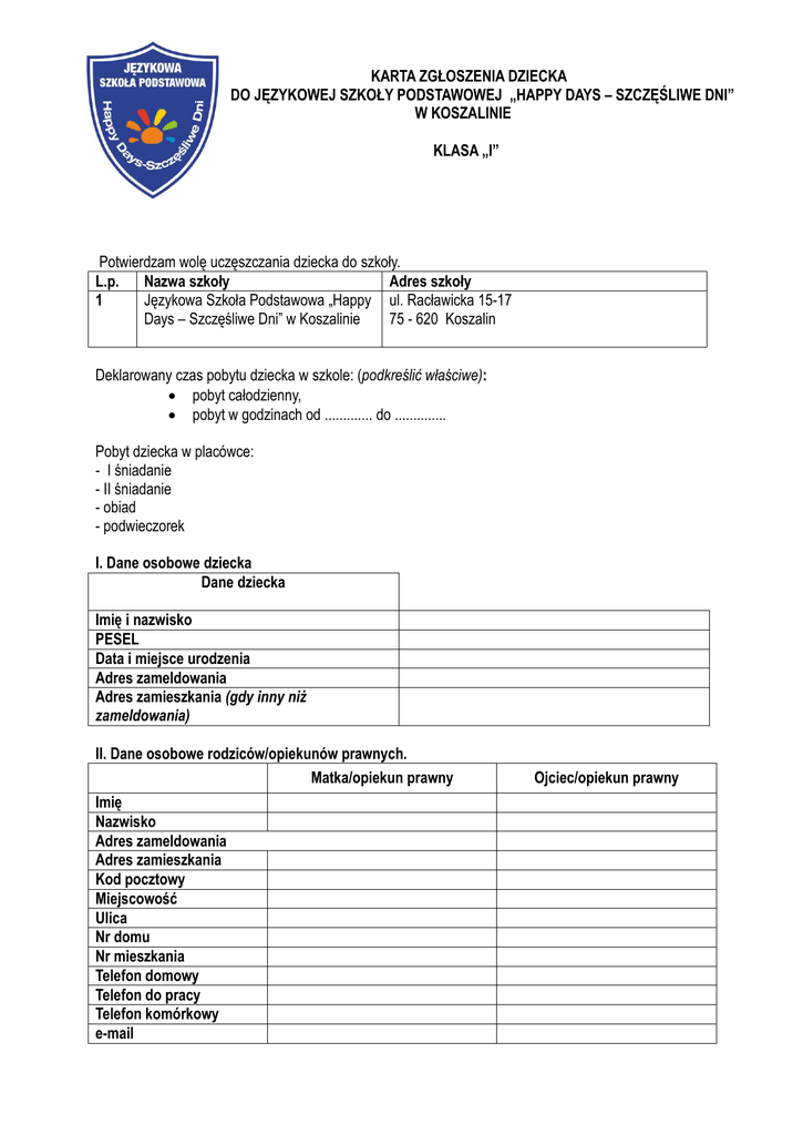 KARTA ZGŁOSZENIA DZIECKA DO JĘZYKOWEJ SZKOŁY PODSTAWOWEJ „HAPPY DAYS – SZCZĘŚLIWE DNI” W KOSZALINIE KLASA „I” Potwierdzam wolę uczęszczania dziecka do szkoły. L.p. Nazwa szkoły Adres szkoły 1 Językowa Szkoła Podstawowa „Happy ul. Racławicka 15-17 Days – Szczęśliwe Dni” w Koszalinie 75 - 620 Koszalin Deklarowany czas pobytu dziecka w szkole: (podkreślić właściwe): pobyt całodzienny, pobyt w godzinach od ............. do .............. Pobyt dziecka w placówce: - I śniadanie - II śniadanie - obiad - podwieczorek I. Dane osobowe dziecka Dane dziecka Imię i nazwisko PESEL Data i miejsce urodzenia Adres zameldowania Adres zamieszkania (gdy inny niż zameldowania) II. Dane osobowe rodziców/opiekunów prawnych. Matka/opiekun prawny Imię Nazwisko Adres zameldowania Adres zamieszkania Kod pocztowy Miejscowość Ulica Nr domu Nr mieszkania Telefon domowy Telefon do pracy Telefon komórkowy e-mail Ojciec/opiekun prawny III. Inne informacje o dziecku: 1) Czy dziecko przebywa pod stałą kontrolą poradni specjalistycznej, jeśli tak to jakiej? ....................................................................................................................................................... 2) Czy dziecko jest wychowywane przez samotnego opiekuna/rodzica (wpisać TAK lub NIE)? ………………………………………………………………………………………………………………………….. 3) Czy dziecko cierpi na jakąś alergię? Jeżeli tak, to wpisać jaką i na jakie czynniki jest uczulone? ....................................................................................................................................................... ....................................................................................................................................................... ....................................................................................................................................................... 4) Czy dziecko cierpi na przewlekłe schorzenia? (cukrzyca, astma, inne, o których powinna wiedzieć szkoła): ....................................................................................................................................................... ....................................................................................................................................................... 5) Informacje o stanie zdrowia dziecka: przebyte choroby, czy dziecko bierze jakieś leki? Wskazania lekarskie np. dieta, alergie pokarmowe, wady rozwojowe, potrzeba snu w ciągu dnia itp.: ....................................................................................................................................................... ....................................................................................................................................................... 6) Inne uwagi o dziecku: ....................................................................................................................................................... ....................................................................................................................................................... IV. Zobowiązujemy się do: · Zapoznania się z regulaminem i statutem szkoły oraz przestrzegania ich postanowień; · Przekazywania do wiadomości szkoły wszelkich zmian w podanych wyżej informacjach; · Regularnego uiszczania opłat za szkołę w wyznaczonym terminie · Przyprowadzania do szkoły tylko dziecka zdrowego; · Przyprowadzania i odbierania dziecka ze szkoły osobiście lub przez inną osobę dorosłą, wskazaną w zał. do niniejszej karty zgłoszeniowej; · Uczestniczenia w zebraniach szkolnych dla rodziców, · Powiadomienia o rezygnacji z usług szkoły w formie pisemnej ze skutkiem na koniec miesiąca. V. Oświadczenie o pobycie dziecka w szkole. Oświadczam/y, że dziecko będzie korzystać z opieki szkoły i będzie/nie będzie korzystało z wyżywienia (I śniadania, II śniadania, obiadu, podwieczorku), od dnia …................... r. Zobowiązujemy się do regularnego uiszczania płatności za szkołę w wyznaczonym terminie. VI. Zobowiązanie do obowiązkowego ubezpieczenia. Oświadczam/y, że w przypadku przyjęcia mojego dziecka do szkoły dołączę pisemne zobowiązanie do pokrycia kosztów obowiązkowego ubezpieczenia od nieszczęśliwych wypadków. VII. Zgłoszenie do innej szkoły Rodzice dzieci już uczęszczających do szkoły powiadamiają Dyrektora Szkoły o tym, że ich dziecko od nowego roku szkolnego będzie zgłoszone do innej szkoły. Pisemne zawiadomienie należy złożyć do 30 czerwca w roku, w którym ma miejsce zgłoszenie do innej szkoły. Koszalin, dnia………………………… r. ..................................................... ....................................................... (podpis matki) (podpis ojca) (lub podpisy opiekunów prawnych) VIII. Oświadczenia dotyczące treści zgłoszenia i ochrony danych osobowych · Niniejszym oświadczamy, że podane powyżej dane są zgodne ze stanem faktycznym. · Przyjmujemy do wiadomości, że w przypadku nie zgłoszenia się dziecka do szkoły w terminie określonym w karcie i braku informacji o przyczynie nieobecności w ciągu 10 dni, dziecko zostaje wykreślone z listy zakwalifikowanych do przyjęcia do szkoły. · Wyrażam/y zgodę na zbieranie, przetwarzanie i wykorzystanie w celach związanych z przyjęciem i pobytem w szkole naszego dziecka, danych osobowych naszych, dziecka oraz upoważnionych do odbioru dziecka osób, przez Organy Szkoły, jego właściciela i inne osoby fizyczne i prawne z nim powiązane, zgodnie z ustawą z dnia 29 sierpnia 1997 r. o ochronie danych osobowych. · Wyrażam/y zgodę na wykorzystanie zdjęć zawierających wizerunek dziecka wykonanych w związku z funkcjonowaniem Szkoły lub udostępnionych dla Szkoły, jak również wszelkich