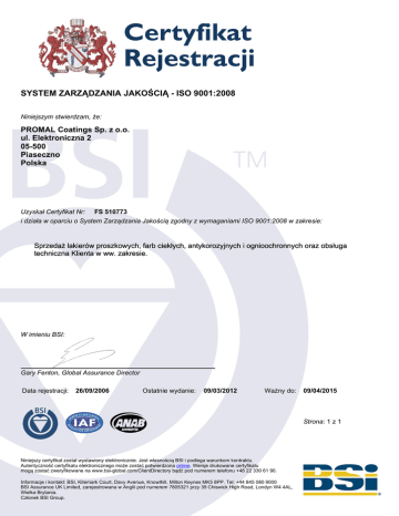 SYSTEM ZARZĄDZANIA JAKOŚCIĄ - ISO 9001:2008 Niniejszym stwierdzam, że: PROMAL Coatings Sp. z o.o. ul. Elektroniczna 2 05-500 Piaseczno Polska Uzyskał Certyfikat Nr: FS 510773 i działa w oparciu o System Zarządzania Jakością zgodny z wymaganiami ISO 9001:2008 w zakresie: Sprzedaż lakierów proszkowych, farb ciekłych, antykorozyjnych i ognioochronnych oraz obsługa techniczna Klienta w ww. zakresie. W imieniu BSI: Gary Fenton, Global Assurance Director Data rejestracji: 26/09/2006 Ostatnie wydanie: 09/03/2012 Ważny do: 09/04/2015 Strona: 1 z 1 Niniejszy certyfikat został wystawiony elektronicznie. Jest własnością BSI i podlega warunkom kontraktu. Autentyczność certyfikatu elektronicznego może zostać potwierdzona online. Wersje drukowane certyfikatu mogą zostać zweryfikowane na www.bsi-global.com/ClientDirectory bądź pod numerem telefonu +48 22 330 61 90. Informacje i kontakt: BSI, Kitemark Court, Davy Avenue, Knowlhill, Milton Keynes MK5 8PP. Tel: +44 845 080 9000 BSI Assurance UK Limited, zarejestrowana w Anglii pod numerem 7805321 przy 39 Chiswick High Road, Londyn W4 4AL, Wielka Brytania. Członek BSI Group.