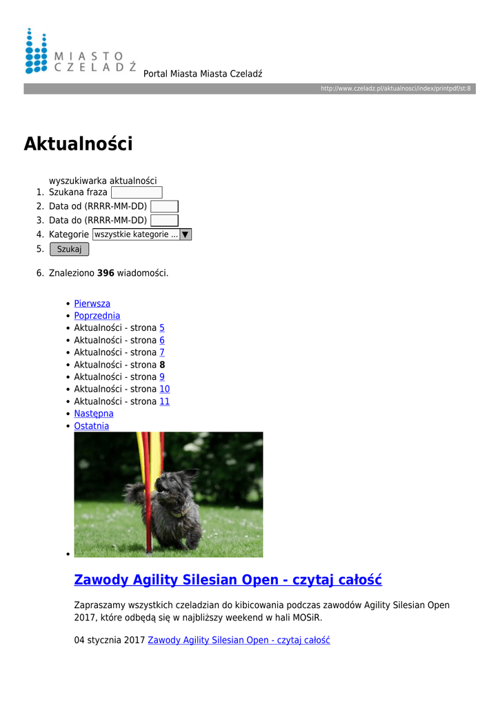 Portal Miasta Miasta Czeladź http://www.czeladz.pl/aktualnosci/index/printpdf/st:8 Aktualności wyszukiwarka aktualności 1. Szukana fraza 2. Data od (RRRR-MM-DD) 3. Data do (RRRR-MM-DD) 4. Kategorie wszystkie kategorie ... ▼ 5. Szukaj 6. Znaleziono 396 wiadomości. Pierwsza Poprzednia Aktualności - strona 5 Aktualności - strona 6 Aktualności - strona 7 Aktualności - strona 8 Aktualności - strona 9 Aktualności - strona 10 Aktualności - strona 11 Następna Ostatnia Zawody Agility Silesian Open - czytaj całość Zapraszamy wszystkich czeladzian do kibicowania podczas zawodów Agility Silesian Open 2017, które odbędą się w najbliższy weekend w hali MOSiR. 04 stycznia 2017 Zawody Agility Silesian Open - czytaj całość Pomóżmy zwierzętom przetrwać zimę - czytaj całość Zwracamy się z apelem do zarządców budynków, administratorów nieruchomości i wszystkich mieszkańców Czeladzi o pomoc wolno żyjącym kotom i ptakom. 04 stycznia 2017 Pomóżmy zwierzętom przetrwać zimę - czytaj całość Orszak Trzech Króli - czytaj całość Galeria Sztuki Współczesnej "Elektrownia" serdecznie zaprasza w piątek, 6 stycznia na Orszak Trzech Króli oraz Przedstawienie Jasełkowe. 03 stycznia 2017 Orszak Trzech Króli - czytaj całość Powitaliśmy rok 2017 - czytaj całość Tegoroczny Sylwester na czeladzkim rynku należy zaliczyć to bardzo udanych. 03 stycznia 2017 Powitaliśmy rok 2017 - czytaj całość Mieszkańcy zdecydowali - czytaj całość Zakończyła się weryfikacja głosów mieszkańców. Trzecia edycja Budżetu Obywatelskiego zaskoczyła rekordową, w porównaniu do lat ubiegłych, frekwencją. 30 grudnia 2016 Mieszkańcy zdecydowali - czytaj całość Rocznica wybuchu w łaźni miejskiej - czytaj całość W czwartek, 29 grudnia o godzinie 12.00 odbędzie się uroczystość upamiętniająca 76. rocznicę wybuchu w łaźni miejskiej. 28 grudnia 2016 Rocznica wybuchu w łaźni miejskiej - czytaj całość Zbiórka przedmiotów na licytacje WOŚP - czytaj całość Ogłaszamy zbiórkę przedmiotów, które będziemy licytować podczas 25. Finału Wielkiej Orkiestry Świątecznej Pomocy. 28 grudnia 2016 Zbiórka przedmiotów na licytacje WOŚP - czytaj całość Sylwester 2016 - czytaj całość Sylwester 2016 na czeladzkim rynku będzie w tym roku wyjątkowo gorący. 28 grudnia 2016 Sylwester 2016 - czytaj całość Konkurs na najpiękniejszą iluminację - czytaj całość Podobnie jak w ubiegłym roku, czekamy na zgłoszenia najpiękniej rozświetlonych posesji i balkonów. 23 grudnia 2016 Konkurs na najpiękniejszą iluminację - czytaj całość „W Czeladzi zagrałem pierwsze dźwięki” - czytaj całość Benefis Henryka Kuźniaka, z okazji 80. Urodzin wybitnego kompozytora muzyki filmowej, był jednym z najważniejszych wydarzeń kulturalnych w Czeladzi 2016 roku. 23 grudnia 2016 „W Czeladzi zagrałem pierwsze dźwięki” - czytaj całość Pierwsza Poprzednia Aktualności - strona 5 Aktualności - strona 6 Aktualności - strona 7 Aktualności - strona 8 Aktualności - strona 9 Aktualności - strona 10 Aktualności - strona 11 Następna Ostatnia
