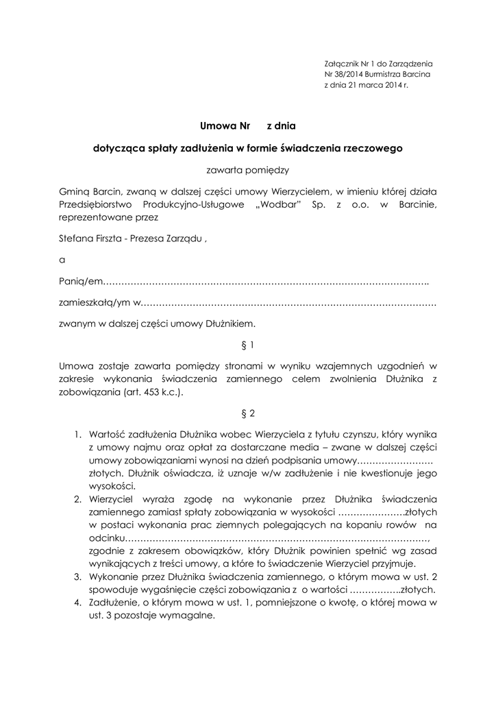 Załącznik Nr 1 do Zarządzenia Nr 38/2014 Burmistrza Barcina z dnia 21 marca 2014 r. Umowa Nr z dnia dotycząca spłaty zadłużenia w formie świadczenia rzeczowego zawarta pomiędzy Gminą Barcin, zwaną w dalszej części umowy Wierzycielem, w imieniu której działa Przedsiębiorstwo Produkcyjno-Usługowe „Wodbar” Sp. z o.o. w Barcinie, reprezentowane przez Stefana Firszta - Prezesa Zarządu , a Panią/em…………………………………………………………………………………………….. zamieszkałą/ym w……………………………………………………………………………………. zwanym w dalszej części umowy Dłużnikiem. §1 Umowa zostaje zawarta pomiędzy stronami w wyniku wzajemnych uzgodnień w zakresie wykonania świadczenia zamiennego celem zwolnienia Dłużnika z zobowiązania (art. 453 k.c.). §2 1. Wartość zadłużenia Dłużnika wobec Wierzyciela z tytułu czynszu, który wynika z umowy najmu oraz opłat za dostarczane media – zwane w dalszej części umowy zobowiązaniami wynosi na dzień podpisania umowy……………………. złotych. Dłużnik oświadcza, iż uznaje w/w zadłużenie i nie kwestionuje jego wysokości. 2. Wierzyciel wyraża zgodę na wykonanie przez Dłużnika świadczenia zamiennego zamiast spłaty zobowiązania w wysokości ………………….złotych w postaci wykonania prac ziemnych polegających na kopaniu rowów na odcinku………………………………………………………………………………………, zgodnie z zakresem obowiązków, który Dłużnik powinien spełnić wg zasad wynikających z treści umowy, a które to świadczenie Wierzyciel przyjmuje. 3. Wykonanie przez Dłużnika świadczenia zamiennego, o którym mowa w ust. 2 spowoduje wygaśnięcie części zobowiązania z o wartości ……………..złotych. 4. Zadłużenie, o którym mowa w ust. 1, pomniejszone o kwotę, o której mowa w ust. 3 pozostaje wymagalne. 5. Chwilą wygaśnięcia zobowiązania zgodnie z zapisami niniejszej umowy jest odbiór przez Wierzyciela świadczenia zamiennego. Zakres świadczenia §3 1. Dłużnik wyraża zgodę i zobowiązuje się do świadczenia zamiennego zgodnie z zatwierdzonym przez Wierzyciela harmonogramem rzeczowo-finansowym, wg wzoru stanowiącego załącznik Nr 4 do zarządzenia Burmistrza Barcina Nr 2. Wykonanie świadczenia zamiennego zostanie zrealizowane w okresie od ……………………………………… do…………………………………………….. i jest równoznaczne z okresem obowiązywania niniejszej umowy. 3. Wierzyciel ma prawo do kontroli sposobu wykonania świadczenia przez Dłużnika. 4. W przypadku nienależytego wykonania świadczenia Dłużnik na pisemne wezwanie Wierzyciela zobowiązany jest usunąć wady wykonania świadczenia zamiennego na zasadach rękojmi według przepisów o rękojmi przy sprzedaży. Odpowiedzialność §4 1. Dłużnik ponosi pełną odpowiedzialność za dobór sprzętu, środków i materiałów do realizacji świadczenia. 2. Dłużnik ponosi wyłączną odpowiedzialność wobec osób trzecich za szkody powstałe w związku z realizacją świadczenia. Obowiązki Dłużnika §5 1. Dłużnik zobowiązuje się do: a. należytego i terminowego wykonania czynności objętych zakresem świadczenia; b. ścisłego przestrzegania zasad bezpieczeństwa i higieny pracy; c. stosowania się do poleceń osób, pod których nadzorem wykonywane będą świadczenia . 2. Dłużnik oświadcza, że: a. stan zdrowia umożliwia mu wykonywanie przedstawionych czynności; b. czynności związane ze świadczeniem zamiennym wykonuje na własną odpowiedzialność i nie będzie dochodzić od Wierzyciela jakichkolwiek roszczeń z tytułu mogących zaistnieć szkód, wypadków czy innych zdarzeń losowych. 3. Dłużnikowi służy prawo powierzenia wykonywania świadczeń zamiennych osobie trzeciej po uprzednim poinformowaniu Wierzyciela. W przypadku powierzenia wykonywania poszczególnych czynności osobie trzeciej, Dłużnik odpowiada za jej działania i zaniechania jak za działania i zaniechania własne. 4. Dłużnik ponosi pełną odpowiedzialność za dobór sprzętu, środków o materiałów do realizacji świadczenia. Kontrola realizacji umowy §6 1. Dłużnik zobowiązany jest poddać się kontroli Wierzyciela, w tym również kontroli przeprowadzonej przez osoby upoważnione przez Wierzyciela w każdym czasie i na każde żądanie. 2. Kontrola obejmuje wykonanie umowy, a w szczególności: a. sposobu wykonywanych prac, b. przestrzegania zapisów harmonogramu rzeczowo-finansowego, c. jakości wykonywanych prac. Rozwiązanie umowy §7 Umowa może być rozwiązana w każdym czasie za porozumieniem Stron, na wniosek jednej ze Stron. §8 Wierzyciel uprawniony jest do rozwiązania umowy w trybie natychmiastowym, gdy Dłużnik: a. nie wypełnia warunków niniejszej umowy pomimo uprzedniego pisemnego wezwania do zaniechania naruszeń i bezskutecznym upływem wyznaczonego terminu, b. został tymczasowo aresztowany przez okres powyżej 1 miesiąca, c. wykonywał świadczenie zamienne w stanie nietrzeźwym. §9 1. Dłużnik może rozwiązać umowę w trybie natychmiastowym w przypadku wystąpienia długotrwałej przeszkody w wykonywaniu świadczenia spowodowanego chorobą. 2. Dłużnik zobowiązuje się do niezwłocznego poinformowania Wierzyciela o zaistnieniu okoliczności, o których mowa w ust. 1. § 10 1. W wypadku rozwiązani umowy na zasadach wskazanych w § 9 Wierzyciel dokona rozliczenia spełnienia świadczenia zamiennego dokonując stosownego obliczenia zakresu wykonania świadczenia przez Dłużnika do zawartej umowy, na co Dłużnik wyraża zgodę. 2. Po dokonaniu rozliczenia Wierzyciel przekaże pisemne oświadczenia Dłużnikowi o kwocie zwolnienia z długu, o którym mowa w § 2 umowy. Integralność umowy § 11 W sprawach nieuregulowanych niniejszą umową mają zastosowanie przepisy Kodeksu cywilnego. § 12 Umowa ninie