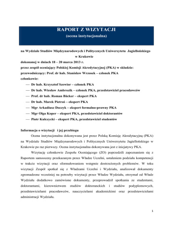 a) RAPORT Z WIZYTACJI (ocena instytucjonalna) na Wydziale Studiów Międzynarodowych i Politycznych Uniwersytetu Jagiellońskiego w Krakowie dokonanej w dniach 18 – 20 marca 2013 r. przez zespół oceniający Polskiej Komisji Akredytacyjnej (PKA) w składzie: przewodniczący: Prof. dr hab. Stanisław Wrzosek – członek PKA członkowie: Dr hab. Krzysztof Szewior – członek PKA Dr hab. Wiesław Ambrozik – członek PKA, przedstawiciel pracodawców Prof. dr hab. Roman Bäcker – ekspert PKA Dr hab. Marek Pietraś – ekspert PKA Mgr Arkadiusz Doczyk – ekspert formalno-prawny PKA Mgr Olga Koper – ekspert PKA, przedstawiciel doktorantów Piotr Kulczycki – ekspert PKA, przedstawiciel studentów Informacja o wizytacji i jej przebiegu Ocena instytucjonalna dokonywana jest przez Polską Komisję Akredytacyjną (PKA) na Wydziale Studiów Międzynarodowych i Politycznych Uniwersytetu Jagiellońskiego w Krakowie po raz pierwszy. Ocena instytucjonalna dokonywana jest z inicjatywy PKA. Wizytację członkowie Zespołu Oceniającego (ZO) poprzedzili zapoznaniem się z Raportem samooceny przekazanym przez Władze Uczelni, ustaleniem podziału kompetencji w trakcie wizytacji oraz sformułowaniem wstępnie dostrzeżonych problemów. W toku wizytacji Zespół spotkał się z Władzami Uczelni i Wydziału, analizował dokumenty zgromadzone wcześniej na potrzeby wizytacji przez Władze Wydziału, otrzymał od Władz Wydziału dodatkowo zamówione dokumenty, przeprowadził spotkania ze studentami, doktorantami, kierownictwem studiów doktoranckich i studiów podyplomowych, przedstawicielami pracodawców, nauczycielami akademickimi oraz przedstawicielami administracji Wydziału. 1 Załącznik nr 1 Podstawa prawna wizytacji Załącznik nr 2 Szczegółowy harmonogram przeprowadzonej wizytacji uwzględniający podział zadań pomiędzy członków zespołu oceniającego. 1. Strategia określona przez jednostkę 1) Strategia rozwoju jednostki jest zbieżna z misją i strategią uczelni oraz uwzględnia politykę zapewniania wysokiej jakości kształcenia Strategia rozwoju Wydziału Studiów Międzynarodowych i Politycznych UJ (dalej w tekście: Wydział) na lata 2013 – 2016, sformułowana w nawiązaniu do planu rozwoju opracowanego w 2011 r., zmieniona jednak w związku z nowymi uregulowaniami prawnymi wprowadzonymi w 2011 r. oraz rozpoczęciem nowej kadencji Władz Uczelni, zakłada podejmowanie działań stanowiących konkretyzację celów i form działania określonych w przyjętym przez Senat UJ w czerwcu 2012 r. Programie rozwoju Uniwersytetu Jagiellońskiego. Strategia ta jest zbieżna z misją UJ, gdyż nawiązuje do wielowiekowych jego doświadczeń i wypracowanych w nim w przeszłości wzorów postaw akademickich oraz świadomości, że powinnością uniwersytetu jest wytyczanie nowych kierunków rozwoju ludzkiej myśli w atmosferze tolerancji i wolności w dziedzinie badań oraz nauczania z poszanowaniem godności człowieka i dla jego dobra. Także Wydział jest przekonany o potrzebie wypracowywania nowych form badania zmieniającej się rzeczywistości społecznej i kulturowej oraz interdyscyplinarnego nauczania o niej. Misja Wydziału eksponuje szczególne znaczenie wartości prawdy, rzetelności naukowej, dialogu (zwłaszcza międzykulturowego), godności człowieka i tolerancji, stanowiąc odzwierciedlenie dewizy UJ: Plus ratio quam vis. Realizacji tych wartości służyć mają cele strategiczne i operacyjne sformułowane w Strategii rozwoju WSMiP UJ na lata 2013 – 2016 eksponujące potrzebę prowadzenia polityki budowy wysokiej jakości kształcenia: cel strategiczny 1.: Wysoka jakość badań naukowych (cele operacyjne: 1.1. Umocnienie pozycji naukowo-badawczej Wydziału; 1.2. Zwiększenie aktywności badawczej; 1.3. Podnoszenie jakości i prestiżu publikacji wydawanych przez Wydział; 1.4. Poszerzenie zakresu uprawnień do nadawania stopni naukowych; 1.5. Uznanie szczególnego znaczenia wyników badań naukowych w ocenach okresowych pracowników i doktorantów; 1.6. Organizacyjne i finansowe wspieranie działalności badawczej pracowników, doktorantów i studentów); cel strategiczny 2: Doskonalenie jakości kształcenia (cele operacyjne: 2.1. Powiązanie prowadzonych badań naukowych z działalnością dydaktyczną; 2.2. Projektowanie nowych kierunków studiów i modyfikowanie już istniejących na podstawie diagnoz zapotrzebowania na nowe formy 2 kształcenia; 2.3. Internacjonalizacja kształcenia; 2.4. Stosowanie i doskonalenie procedur weryfikacji jakości kształcenia; 2.5. Uznanie szczególnego znaczenia ewaluacji pracy dydaktycznej w ocenach okresowych pracowników); cel strategiczny 3: Konsolidacja struktur organizacyjnych i doskonalenie ich funkcjonowania (cele operacyjne: 3.1. Doskonalenia zasad zarządzania jednostką; 3.2. Konsolidacja struktur organizacyjnych Wydziału z uwzględnieniem rozwoju bazy infrastrukturalnej; 3.3. Usprawnienie procesu komunikacji i polityki informacyjnej Wydziału); cel strategiczny 4: Interakcja z otoczeniem społecznym i międzynarodowym (cele operacyjne: 4.1. Intensyfikacja współdziałania z partnerami społecznymi i międzynarodowymi w zakresie jakości kształcenia; 4.2. Intensyfikacja współdziałania z partnerami społecznymi i międzynarodowymi w organizacji wspólnych przedsięwzięć naukowych). Przyjęty dokument zawiera również opis mechanizmu monitorowania realizacji Strategii i harmonogram jej implementacji. Reasumując, w ocenie ZO strategia rozwoju Wydziału jest zbieżna z misją i strategią całego Uniwersytetu. Umożliwia to realizację polityki mającej na celu zapewnienie wysokiego poziomu kształcenia. Władze Wydziału przywiązują dużą wagę do wypracowywania spójnych założeń strategii rozwoju jednostki. 2) Jednostka opracowała koncepcję kształcenia obejmującą studia I i II stopnia, studia doktoranckie i podyplomowe spójną z jej celami strategicznymi Odwołując się do dotychczasowych doświad