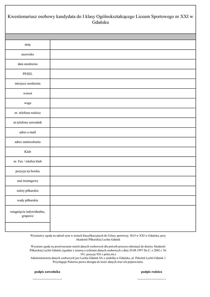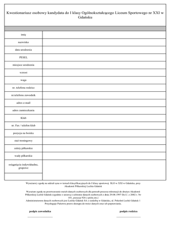 Kwestionariusz osobowy kandydata do I klasy Ogólnokształcącego Liceum Sportowego nr XXI w Gdańsku imię nazwisko data urodzenia PESEL miesjsce urodzenia wzrost waga nr. telefonu rodzice nr.telefonu zawodnik adres e-mail adres zamieszkania Klub nr. Fax / telefon klub pozycja na boisku staż treningowy zalety piłkarskie wady piłkarskie osiągnięcia indywidualne, grupowe Wyrażam/y zgodę na udział syna w testach klasyfikacyjnych do I klasy sportowej SLO w XXI w Gdańsku, przy Akademii Piłkarskiej Lechia Gdańsk Wyrażam zgodę na przetwarzanie moich danych osobowych dla potrzeb procesu rekrutacji do drużyn Akademii Piłkarskiej Lechii Gdańsk (zgodnie z ustawą o ochronie danych osobowych z dnia 29.08.1997 Dz.U. z 2002 r. Nr 101, pozycja 926 z późn.zm.) Administratorem danych osobowych jest Lechia Gdańsk SA z siedzibą w Gdańsku, ul. Pokoleń Lechii Gdańsk 1 Przysługuje Państwu prawo dostępu do treści danych oraz ich poprawiania. podpis zawodnika podpis rodzica ......................... ........................