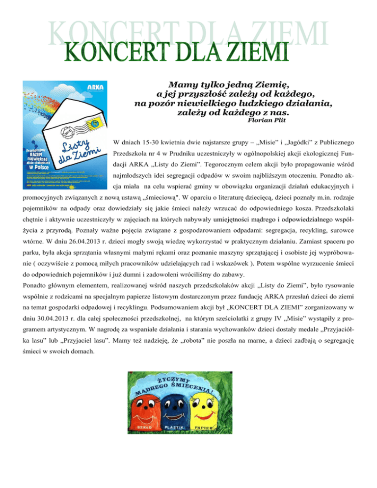 Mamy tylko jedną Ziemię, a jej przyszłość zależy od każdego, na pozór niewielkiego ludzkiego działania, zależy od każdego z nas. Florian Plit W dniach 15-30 kwietnia dwie najstarsze grupy – „Misie” i „Jagódki” z Publicznego Przedszkola nr 4 w Prudniku uczestniczyły w ogólnopolskiej akcji ekologicznej Fundacji ARKA „Listy do Ziemi”. Tegorocznym celem akcji było propagowanie wśród najmłodszych idei segregacji odpadów w swoim najbliższym otoczeniu. Ponadto akcja miała na celu wspierać gminy w obowiązku organizacji działań edukacyjnych i promocyjnych związanych z nową ustawą „śmieciową". W oparciu o literaturę dziecięcą, dzieci poznały m.in. rodzaje pojemników na odpady oraz dowiedziały się jakie śmieci należy wrzucać do odpowiedniego kosza. Przedszkolaki chętnie i aktywnie uczestniczyły w zajęciach na których nabywały umiejętności mądrego i odpowiedzialnego współżycia z przyrodą. Poznały ważne pojęcia związane z gospodarowaniem odpadami: segregacja, recykling, surowce wtórne. W dniu 26.04.2013 r. dzieci mogły swoją wiedzę wykorzystać w praktycznym działaniu. Zamiast spaceru po parku, była akcja sprzątania własnymi małymi rękami oraz poznanie maszyny sprzątającej i osobiste jej wypróbowanie ( oczywiście z pomocą miłych pracowników udzielających rad i wskazówek ). Potem wspólne wyrzucenie śmieci do odpowiednich pojemników i już dumni i zadowoleni wróciliśmy do zabawy. Ponadto głównym elementem, realizowanej wśród naszych przedszkolaków akcji „Listy do Ziemi”, było rysowanie wspólnie z rodzicami na specjalnym papierze listowym dostarczonym przez fundację ARKA przesłań dzieci do ziemi na temat gospodarki odpadowej i recyklingu. Podsumowaniem akcji był „KONCERT DLA ZIEMI” zorganizowany w dniu 30.04.2013 r. dla całej społeczności przedszkolnej, na którym sześciolatki z grupy IV „Misie” wystąpiły z programem artystycznym. W nagrodę za wspaniałe działania i starania wychowanków dzieci dostały medale „Przyjaciółka lasu” lub „Przyjaciel lasu”. Mamy też nadzieję, że „robota” nie poszła na marne, a dzieci zadbają o segregację śmieci w swoich domach.