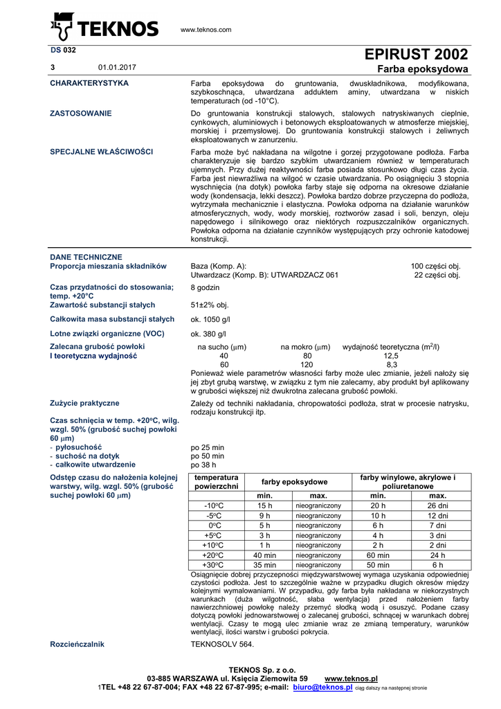 www.teknos.com DS 032 3 EPIRUST 2002 01.01.2017 Farba epoksydowa CHARAKTERYSTYKA Farba epoksydowa do gruntowania, szybkoschnąca, utwardzana adduktem temperaturach (od -10°C). ZASTOSOWANIE Do gruntowania konstrukcji stalowych, stalowych natryskiwanych cieplnie, cynkowych, aluminiowych i betonowych eksploatowanych w atmosferze miejskiej, morskiej i przemysłowej. Do gruntowania konstrukcji stalowych i żeliwnych eksploatowanych w zanurzeniu. SPECJALNE WŁAŚCIWOŚCI Farba może być nakładana na wilgotne i gorzej przygotowane podłoża. Farba charakteryzuje się bardzo szybkim utwardzaniem również w temperaturach ujemnych. Przy dużej reaktywności farba posiada stosunkowo długi czas życia. Farba jest niewrażliwa na wilgoć w czasie utwardzania. Po osiągnięciu 3 stopnia wyschnięcia (na dotyk) powłoka farby staje się odporna na okresowe działanie wody (kondensacja, lekki deszcz). Powłoka bardzo dobrze przyczepna do podłoża, wytrzymała mechanicznie i elastyczna. Powłoka odporna na działanie warunków atmosferycznych, wody, wody morskiej, roztworów zasad i soli, benzyn, oleju napędowego i silnikowego oraz niektórych rozpuszczalników organicznych. Powłoka odporna na działanie czynników występujących przy ochronie katodowej konstrukcji. DANE TECHNICZNE Proporcja mieszania składników Baza (Komp. A): Utwardzacz (Komp. B): UTWARDZACZ 061 dwuskładnikowa, modyfikowana, aminy, utwardzana w niskich 100 części obj. 22 części obj. Czas przydatności do stosowania; temp. +20°C Zawartość substancji stałych 8 godzin Całkowita masa substancji stałych ok. 1050 g/l Lotne związki organiczne (VOC) ok. 380 g/l Zalecana grubość powłoki I teoretyczna wydajność na sucho (µm) na mokro (µm) wydajność teoretyczna (m2/l) 40 80 12,5 60 120 8,3 Ponieważ wiele parametrów własności farby może ulec zmianie, jeżeli nałoży się jej zbyt grubą warstwę, w związku z tym nie zalecamy, aby produkt był aplikowany w grubości większej niż dwukrotna zalecana grubość powłoki. Zużycie praktyczne Zależy od techniki nakładania, chropowatości podłoża, strat w procesie natrysku, rodzaju konstrukcji itp. Czas schnięcia w temp. +20oC, wilg. wzgl. 50% (grubość suchej powłoki 60 µm) - pyłosuchość - suchość na dotyk - całkowite utwardzenie Odstęp czasu do nałożenia kolejnej warstwy, wilg. wzgl. 50% (grubość suchej powłoki 60 µm) 51±2% obj. po 25 min po 50 min po 38 h temperatura powierzchni -10oC -5oC 0 oC +5oC +10oC +20oC +30oC farby epoksydowe min. 15 h 9h 5h 3h 1h 40 min 35 min max. nieograniczony nieograniczony nieograniczony nieograniczony nieograniczony nieograniczony nieograniczony farby winylowe, akrylowe i poliuretanowe min. max. 20 h 26 dni 10 h 12 dni 6h 7 dni 4h 3 dni 2h 2 dni 60 min 24 h 50 min 6h Osiągnięcie dobrej przyczepności międzywarstwowej wymaga uzyskania odpowiedniej czystości podłoża. Jest to szczególnie ważne w przypadku długich okresów między kolejnymi wymalowaniami. W przypadku, gdy farba była nakładana w niekorzystnych warunkach (duża wilgotność, słaba wentylacja) przed nałożeniem farby nawierzchniowej powłokę należy przemyć słodką wodą i osuszyć. Podane czasy dotyczą powłoki jednowarstwowej o zalecanej grubości, schnącej w warunkach dobrej wentylacji. Czasy te mogą ulec zmianie wraz ze zmianą temperatury, warunków wentylacji, ilości warstw i grubości pokrycia. Rozcieńczalnik TEKNOSOLV 564. TEKNOS Sp. z o.o. 03-885 WARSZAWA ul. Księcia Ziemowita 59 www.teknos.pl 1TEL +48 22 67-87-004; FAX +48 22 67-87-995; e-mail: [email protected] ciąg dalszy na następnej stronie EPIRUST 2002 Rozcieńczalnik do mycia TEKNOSOLV 564 Wygląd powłoki Mat Kolor 250 czerwony tlenkowy OZNAKOWANIE BEZPIECZEŃSTWA Patrz Karta Charakterystyki SPOSÓB STOSOWANIA Przygotowanie podłoża DS 032 - 3 strona 2 840 szary srebrzysty Zaleca się, przed czyszczeniem zmycie powierzchni wodą z dodatkiem OLICLEAN 123, a następnie spłukanie czystą wodą. Powierzchnia stalowa sucha, pozbawiona tłuszczu i soli, oczyszczona do stopnia czystości wg PN-ISO 8501-1, co najmniej Sa2 dla konstrukcji eksploatowanych w zanurzeniu oraz w warunkach atmosfery agresywnej, gdy wymagane jest długotrwałe zabezpieczenie konstrukcji; co najmniej St3 dla konstrukcji eksploatowanych w atmosferze przemysłowej, St2 dla konstrukcji eksploatowanych w warunkach atmosferycznych i dla powierzchni wewnętrznych. Powierzchnia sucha, pozbawiona soli, tłuszczu, kurzu i innych zanieczyszczeń oraz luźno związanych cząstek rdzy. Dopuszcza się stosowanie farby na wilgotne podłoża. Powierzchnia stalowa uprzednio zagruntowana odpowiednią farbą do czasowej ochrony sucha i pozbawiona zanieczyszczeń. Miejsca przekorodowań, uszkodzeń mechanicznych i termicznych oraz miejsca, w których powłoka wykazuje wady lub objawy destrukcji oczyszczone do stopnia czystości wg PN-ISO 8501-1 Sa2 dla powierzchni zanurzonych, St3 dla powierzchni eksploatowanych w warunkach atmosferycznych. Dla powierzchni wewnętrznych dopuszcza się oczyszczenie tych miejsc do stopnia czystości co najmniej St2. Nieuszkodzona powłoka farby EPIWELD CZERWONY lekko omieciona ścierniwem (dla powierzchni zanurzonych) lub zszorstkowana mechanicznie (dla konstrukcji eksploatowanych w warunkach atmosferycznych). Niesezonowane powierzchnie stali ocynkowanej zanurzeniowo i powierzchnie aluminiowe suche, korzystnie zmatowione np. za pomocą omiatania ścierniwem niemetalowym. Zanieczyszczenia niesezonowanych powierzchni ocynkowanych zanurzeniowo, np. smar, olej, pozostały topnik lub materiały służące do znakowania powinny zostać usunięte. Powierzchnie ocynkowane powinny być wolne od wszelkich zanieczyszczeń. Sezonowane powierzchnie ocynkowane zanurzeniowo należy przygotować poprzez usunięcie produktów korozji cynku (biała rdza) i gromadzących się zanieczyszczeń. Do usuwania zanieczyszczeń stosować czyszczenie gorącą wodą, wodą pod ciśnieniem, parą, omiatanie