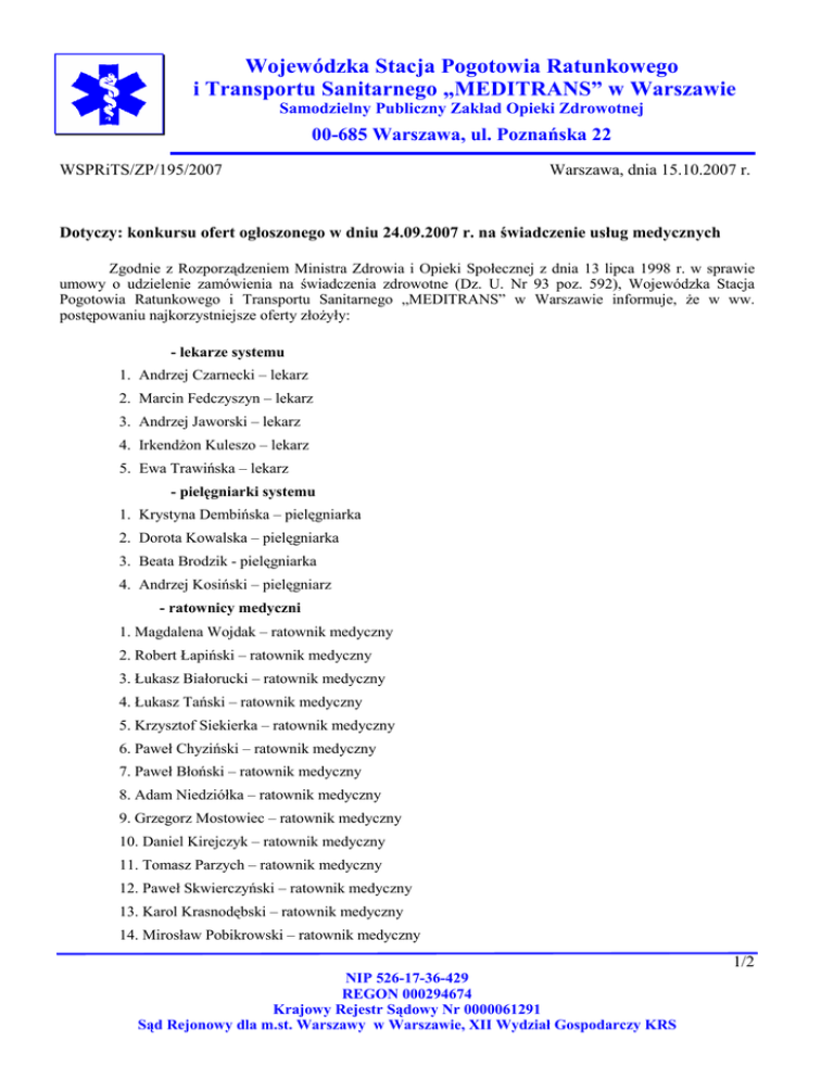 Wojewódzka Stacja Pogotowia Ratunkowego i Transportu Sanitarnego „MEDITRANS” w Warszawie Samodzielny Publiczny Zakład Opieki Zdrowotnej 00-685 Warszawa, ul. Poznańska 22 WSPRiTS/ZP/195/2007 Warszawa, dnia 15.10.2007 r. Dotyczy: konkursu ofert ogłoszonego w dniu 24.09.2007 r. na świadczenie usług medycznych Zgodnie z Rozporządzeniem Ministra Zdrowia i Opieki Społecznej z dnia 13 lipca 1998 r. w sprawie umowy o udzielenie zamówienia na świadczenia zdrowotne (Dz. U. Nr 93 poz. 592), Wojewódzka Stacja Pogotowia Ratunkowego i Transportu Sanitarnego „MEDITRANS” w Warszawie informuje, Ŝe w ww. postępowaniu najkorzystniejsze oferty złoŜyły: - lekarze systemu 1. Andrzej Czarnecki – lekarz 2. Marcin Fedczyszyn – lekarz 3. Andrzej Jaworski – lekarz 4. IrkendŜon Kuleszo – lekarz 5. Ewa Trawińska – lekarz - pielęgniarki systemu 1. Krystyna Dembińska – pielęgniarka 2. Dorota Kowalska – pielęgniarka 3. Beata Brodzik - pielęgniarka 4. Andrzej Kosiński – pielęgniarz - ratownicy medyczni 1. Magdalena Wojdak – ratownik medyczny 2. Robert Łapiński – ratownik medyczny 3. Łukasz Białorucki – ratownik medyczny 4. Łukasz Tański – ratownik medyczny 5. Krzysztof Siekierka – ratownik medyczny 6. Paweł Chyziński – ratownik medyczny 7. Paweł Błoński – ratownik medyczny 8. Adam Niedziółka – ratownik medyczny 9. Grzegorz Mostowiec – ratownik medyczny 10. Daniel Kirejczyk – ratownik medyczny 11. Tomasz Parzych – ratownik medyczny 12. Paweł Skwierczyński – ratownik medyczny 13. Karol Krasnodębski – ratownik medyczny 14. Mirosław Pobikrowski – ratownik medyczny 1/2 NIP 526-17-36-429 REGON 000294674 Krajowy Rejestr Sądowy Nr 0000061291 Sąd Rejonowy dla m.st. Warszawy w Warszawie, XII Wydział Gospodarczy KRS Wojewódzka Stacja Pogotowia Ratunkowego i Transportu Sanitarnego „MEDITRANS” w Warszawie Samodzielny Publiczny Zakład Opieki Zdrowotnej 00-685 Warszawa, ul. Poznańska 22 15. Wojciech Filipek – ratownik medyczny 16. Grzegorz Hołody – ratownik medyczny 17. Artur Karpiarz – ratownik medyczny 18. Sławomir Jenczewski – ratownik medyczny 19. Jacek Grądzik – ratownik medyczny 20. Marcin Serwach – ratownik medyczny 21. Konrad Grasewicz – ratownik medyczny 22. Piotr Ćwikliński – ratownik medyczny 23. Marcin Nogal – ratownik medyczny 24. Łukasz Rosa – ratownik medyczny Oferty, które zostały wybrane są najkorzystniejsze pod względem kryteriów przedstawionych w rozdz. IV Szczegółowych Warunków Konkursu, a takŜe odpowiadają wszystkim wymaganiom przedstawionym w SWK. Podstawą do zawarcia umowy jest wypełnienie przez oferenta, który złoŜył najkorzystniejszą ofertę, projektu umowy. W przypadku braku protestów, odwołań i skarg oferent, który złoŜył najkorzystniejszą ofertę obowiązany jest podpisać umowę, zgodnie ze stawkami przedstawionymi w ofercie. 2/2 NIP 526-17-36-429 REGON 000294674 Krajowy Rejestr Sądowy Nr 0000061291 Sąd Rejonowy dla m.st. Warszawy w Warszawie, XII Wydział Gospodarczy KRS