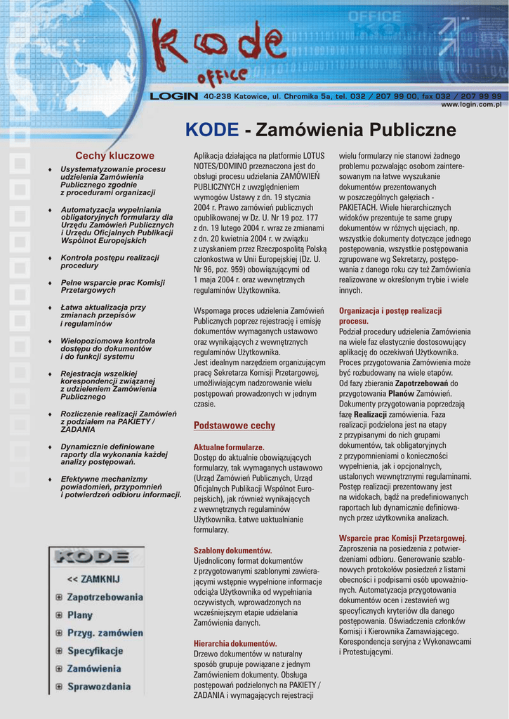 KODE - Zamówienia Publiczne Cechy kluczowe 6 Usystematyzowanie procesu udzielenia Zamówienia Publicznego zgodnie z procedurami organizacji 6 Automatyzacja wypełniania obligatoryjnych formularzy dla Urzędu Zamówień Publicznych i Urzędu Oficjalnych Publikacji Wspólnot Europejskich 6 Kontrola postępu realizacji procedury 6 Pełne wsparcie prac Komisji Przetargowych 6 Łatwa aktualizacja przy zmianach przepisów i regulaminów 6 Wielopoziomowa kontrola dostępu do dokumentów i do funkcji systemu 6 Rejestracja wszelkiej korespondencji związanej z udzieleniem Zamówienia Publicznego 6 Rozliczenie realizacji Zamówień z podziałem na PAKIETY / ZADANIA 6 Dynamicznie definiowane raporty dla wykonania każdej analizy postępowań. 6 Efektywne mechanizmy powiadomień, przypomnień i potwierdzeń odbioru informacji. Aplikacja działająca na platformie LOTUS NOTES/DOMINO przeznaczona jest do obsługi procesu udzielania ZAMÓWIEŃ PUBLICZNYCH z uwzględnieniem wymogów Ustawy z dn. 19 stycznia 2004 r. Prawo zamówień publicznych opublikowanej w Dz. U. Nr 19 poz. 177 z dn. 19 lutego 2004 r. wraz ze zmianami z dn. 20 kwietnia 2004 r. w związku z uzyskaniem przez Rzeczpospolitą Polską członkostwa w Unii Europejskiej (Dz. U. Nr 96, poz. 959) obowiązującymi od 1 maja 2004 r. oraz wewnętrznych regulaminów Użytkownika. wielu formularzy nie stanowi żadnego problemu pozwalając osobom zainteresowanym na łatwe wyszukanie dokumentów prezentowanych w poszczególnych gałęziach PAKIETACH. Wiele hierarchicznych widoków prezentuje te same grupy dokumentów w różnych ujęciach, np. wszystkie dokumenty dotyczące jednego postępowania, wszystkie postępowania zgrupowane wg Sekretarzy, postępowania z danego roku czy też Zamówienia realizowane w określonym trybie i wiele innych. Wspomaga proces udzielenia Zamówień Publicznych poprzez rejestrację i emisję dokumentów wymaganych ustawowo oraz wynikających z wewnętrznych regulaminów Użytkownika. Jest idealnym narzędziem organizującym pracę Sekretarza Komisji Przetargowej, umożliwiającym nadzorowanie wielu postępowań prowadzonych w jednym czasie. Organizacja i postęp realizacji procesu. Podział procedury udzielenia Zamówienia na wiele faz elastycznie dostosowujący aplikację do oczekiwań Użytkownika. Proces przygotowania Zamówienia może być rozbudowany na wiele etapów. Od fazy zbierania Zapotrzebowań do przygotowania Planów Zamówień. Dokumenty przygotowania poprzedzają fazę Realizacji zamówienia. Faza realizacji podzielona jest na etapy z przypisanymi do nich grupami dokumentów, tak obligatoryjnych z przypomnieniami o konieczności wypełnienia, jak i opcjonalnych, ustalonych wewnętrznymi regulaminami. Postęp realizacji prezentowany jest na widokach, bądź na predefiniowanych raportach lub dynamicznie definiowanych przez użytkownika analizach. Podstawowe cechy Aktualne formularze. Dostęp do aktualnie obowiązujących formularzy, tak wymaganych ustawowo (Urząd Zamówień Publicznych, Urząd Oficjalnych Publikacji Wspólnot Europejskich), jak również wynikających z wewnętrznych regulaminów Użytkownika. Łatwe uaktualnianie formularzy. Szablony dokumentów. Ujednolicony format dokumentów z przygotowanymi szablonymi zawierającymi wstępnie wypełnione informacje odciąża Użytkownika od wypełniania oczywistych, wprowadzonych na wcześniejszym etapie udzielania Zamówienia danych. Hierarchia dokumentów. Drzewo dokumentów w naturalny sposób grupuje powiązane z jednym Zamówieniem dokumenty. Obsługa postępowań podzielonych na PAKIETY / ZADANIA i wymagających rejestracji Wsparcie prac Komisji Przetargowej. Zaproszenia na posiedzenia z potwierdzeniami odbioru. Generowanie szablonowych protokołów posiedzeń z listami obecności i podpisami osób upoważnionych. Automatyzacja przygotowania dokumentów ocen i zestawień wg specyficznych kryteriów dla danego postępowania. Oświadczenia członków Komisji i Kierownika Zamawiającego. Korespondencja seryjna z Wykonawcami i Protestującymi. Praca z Zamówieniem przy podziale na wiele etapów pozwala w łatwy sposób śledzić postęp udzielania Zamówienia, aż do podpisania Umowy będącej wynikiem rozstrzygnięcia postępowania - dokumenty Zamówień mogą zostać powiązane z aplikacją KODE - Rejestr Umów. Śledzenie postępu realizacji procedur może się odbywać na dedykowanych widokach, gdzie prezentowany jest obecny etap realizacji wraz z informacją o stanie ewentualnych protestów /odwołań/ skarg. Informacje na widokach prezentowane są zawsze selektywnie, przez co są czytelne dla użytkowników aplikacji. Selektywnie podpowiadane dokumenty. Rozbudowane regulaminy wewnętrzne w połączeniu z obligatoryjnymi dokumentami mogą wymagać rejestracji dużej liczby dokumentów, konieczność alternatywnego wyboru jednego z wielu formularzy właściwych dla danego trybu postępowania, adekwatnych do wartości itp. Selektywnie przypisane dokumenty do danego etapu realizacji pozwalają na łatwe wyszukanie potrzebnego dokumentu. Dla dokumentów, których rejestracja uwarunkowana jest np. sprecyzowanymi w ustawie kryteriami, przygotowane zostały pomocne funkcje tworzące automatycznie wymagany rodzaj dokumentu. Wspomaganie Komisji Przetargowej. Wymagane ustawowo Protokoły Prac Komisji Przetargowej tworzone są w aplikacji niejako przy okazji rejestracji postępowania. Właściwa dla danego trybu Zamówienia część szczegółowa Protokołu jest selektywnie podpowiadana przez aplikację. Informacje niezbędne do wypełnienia formularza Protokołu są pobierane z dokumentów rejestrowanych dla danego Zamówienia i automatycznie wstawiane do odpowiednich rubryk. Formularze te są przygotowane zgodnie z aktualnie obowiązującymi wymogami i bezpośrednio z aplikacji mogą być emitowane np. do Urzędu Zamówień Publicznych. Członkowie Komisji mają łatwy dostęp do wszystkich dokumentów postępowania. Dzięki prostym w użyciu funkcjom s