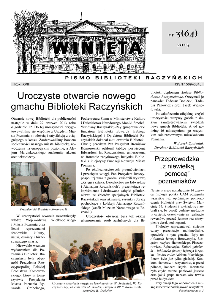 nr 3(64) 2013 P I S M O B I B L I O T E K I Rok XVII ISSN 1509–6343 Uroczyste otwarcie nowego gmachu Biblioteki Raczyńskich Otwarcie nowej Biblioteki dla publiczności nastąpiło w dniu 29 czerwca 2013 roku o godzinie 12. Do tej uroczystości przygotowywaliśmy się wspólnie z Urzędem Miasta Poznania z radością i satysfakcją z osiągniętego sukcesu. Zaoferowaliśmy bowiem społeczności naszego miasta bibliotekę nowoczesną na europejskim poziomie, a Alejom Marcinkowskiego znakomity akcent architektoniczny. Prezydent RP Bronisław Komorowski R A C Z Y Ń S K I C H Podsekretarz Stanu w Ministerstwie Kultury i Dziedzictwa Narodowego Moniki Smoleń, Wiridiany Raczyńskiej-Rey (praprawnuczki fundatora Biblioteki Edwarda hrabiego Raczyńskiego) i Dyrektora Biblioteki Raczyńskich dokonał aktu otwarcia Biblioteki. Chwilę przedtem Pan Prezydent Bronisław Komorowski odsłonił tablicę poświęconą Edwardowi hr. Raczyńskiemu umieszczoną na frontonie zabytkowego budynku Biblioteki z inicjatywy Fundacji Rozwoju Miasta Poznania. Po okolicznościowych przemówieniach i przecięciu wstęgi, Pan Prezydent Rzeczypospolitej wraz z gośćmi zwiedzili wystawę „Księgi i sztuka. Dziedzictwo po Edwardzie i Atanazym Raczyńskich”, prezentującą rękopiśmienne i drukowane zabytki piśmiennictwa ze zbiorów specjalnych Biblioteki Raczyńskich oraz akwarele, rysunki i obrazy pochodzące z kolekcji Atanazego Raczyńskiego (zasób Muzeum Narodowego w Poznaniu). Uroczystość otwarcia była też okazją uhonorowania osób zasłużonych dla Bi- W uroczystości otwarcia uczestniczyły władze Województwa Wielkopolskiego i Miasta Poznania oraz liczni reprezentanci środowiska kultury, nauki, oświaty i biznesu naszego miasta. Niezwykle ważnym wydarzeniem dla Poznania i Biblioteki Raczyńskich była obecność Prezydenta Rzeczypospolitej Polskiej Bronisława Komorowskiego, który w towarzystwie Prezydenta Uroczyste przecięcia wstęgi: od lewej dyrektor W. Spaleniak, W. RaMiasta Poznania Ryczyńska-Rey, wiceminister M. Smoleń, Prezydent RP B. Komorowski, szarda Grobelnego, prezydent R. Grobelny blioteki dyplomem Amicus Bibliothecae Raczynscianae. Otrzymali je panowie: Tadeusz Boniecki, Tadeusz Panowicz i prof. Jacek Wiesiołowski. Po zakończeniu oficjalnej części uroczystości wszyscy goście z dużym zainteresowaniem zwiedzili nowy gmach Biblioteki. A od godziny 16 udostępniono go wszystkim zainteresowanym mieszkańcom Poznania. Wojciech Spaleniak Dyrektor Biblioteki Raczyńskich Przeprowadzka „z niewielką pomocą” poznaniaków Najpierw nieco nostalgicznie 14 czerwca filologia polska UAM pożegnała wszystkie już opróżnione pomieszczenia biblioteki przy Świętym Marcinie 65. Studenci i wykładowcy zebrali się, by uczcić godziny spędzone w czytelni, oczekiwanie na realizację rewersów, poczuć jeszcze raz skrzypienie desek pod nogami. Filolodzy zaprezentowali świetne cztery prezentacje multimedialne, opowieści o tym gmachu. Były to: Atlantyda Jerzego Borowczyka, Leksykon miejsca Hamerskiego, Piszczorowicza, Rybarczyka, Śmierć galaktyki – biblioteka (muza) Jędrzeja Krystka i Umbra et lux Adriana Pilarskiego. Potem było już tylko głośniej. Konkurs slamerów i recytatorów, a przed północą koncert Bajzla. Rozstanie było chyba trudne, ponieważ jeszcze czas jakiś grupa uczestników trwała przed budynkiem. Przy okazji tego wspomnienia muszę serdecznie podziękować wszystkim dokończenie na s. 3 Głosy w czytelni da”). Materiały przygotowali pracownicy i studenci z Instytutu Filologii Polskiej (ci bowiem ukochali to miejsce szczególnie). Młodzież zwiedzała gmach pod przewodnictwem wspaniałych bibliotekarzy – każdy zakamarek został skomentowany, przy każdym nasuwała się jakaś anegdota, pojawiało się wspomnienie. W krótkim czasie przestrzeń wypełniła się opowieściami, cieniami dziwnych czytelników (tych ze wspomnień), a także prawdziwymi miłośnikami miejsca, którzy postanowili jeszcze raz odwiedzić ten sędziwy budynek. Potem przyszedł czas na warsztaty studenckie – recytatorskie i slamerskie. To połączenie miało zagwarantować silne brzmienie głosów w czytelni. Recytatorzy przygotowywali utwory wybranych przez siebie autorów, a slamerzy – własne teksty (warsztaty prowadzili: Marcin Bosak, Włodzimierz Ignasiński, Dawid Koteja i Łukasz Podczas „Głosów w czytelni” wystąpił Bajzel Gamrot). Głosy się buw tu i teraz, w jakąś tam osobność – choć dziły, ustawiały, zaczynały oswajać przeprzecież wyrastającą nierzadko z miejsc strzeń, w której niby zawsze były obecne, powszechnych. Warto doceniać pamięć. ale jednak w innej roli. Ktoś zauważył, że Dlatego właśnie 14 czerwca grupa studentów mogło być więcej, że nie dopiwiernych czytelników, którzy przez wiele sali. Ktoś inny jednak ripostował, że pożelat bywali w czytelni przy ul. Święty Mar- gnanie celebrują raczej nieco starsi, a więc cin (w Raczkach), postanowiła pożegnać też ci, którzy w piątek pracują, albo nie gmach biblioteki. Plan nie był może skom- dowiedzieli się o tych wydarzeniach. Pożeplikowany, ale emocje – silne. Przekonanie gnanie bowiem miało (mimo mediów) chao tym, że należy jeszcze pospacerować po rakter półprywatny, zindywidualizowany. piętrach, zajrzeć tam, gdzie nie było dotąd Studenci zorganizowali również aukcję okazji (bo przepisy, bo nieodłączna tajemprzedmiotów charakterystycznych. Chętni nica wszelkich bibliotek, bo wreszcie re- kupowali zwłaszcza słynne trzeszczące spekt), że trzeba usiąść przy stole z meta- klepki czytelnianego parkietu, a także szulową lampką i zobaczyć się w tych prze- fladki katalogowe, dziwne – już metafostrzeniach retrospektywnie, było determi- ryczne przedmioty, które potrafią wywołynujące i pobudzające fantazję. wać ducha. Są bezcenne, a jednak pozwoWobec tego zrodził się pomysł podsta- liły na zebranie pieniędzy. Ba