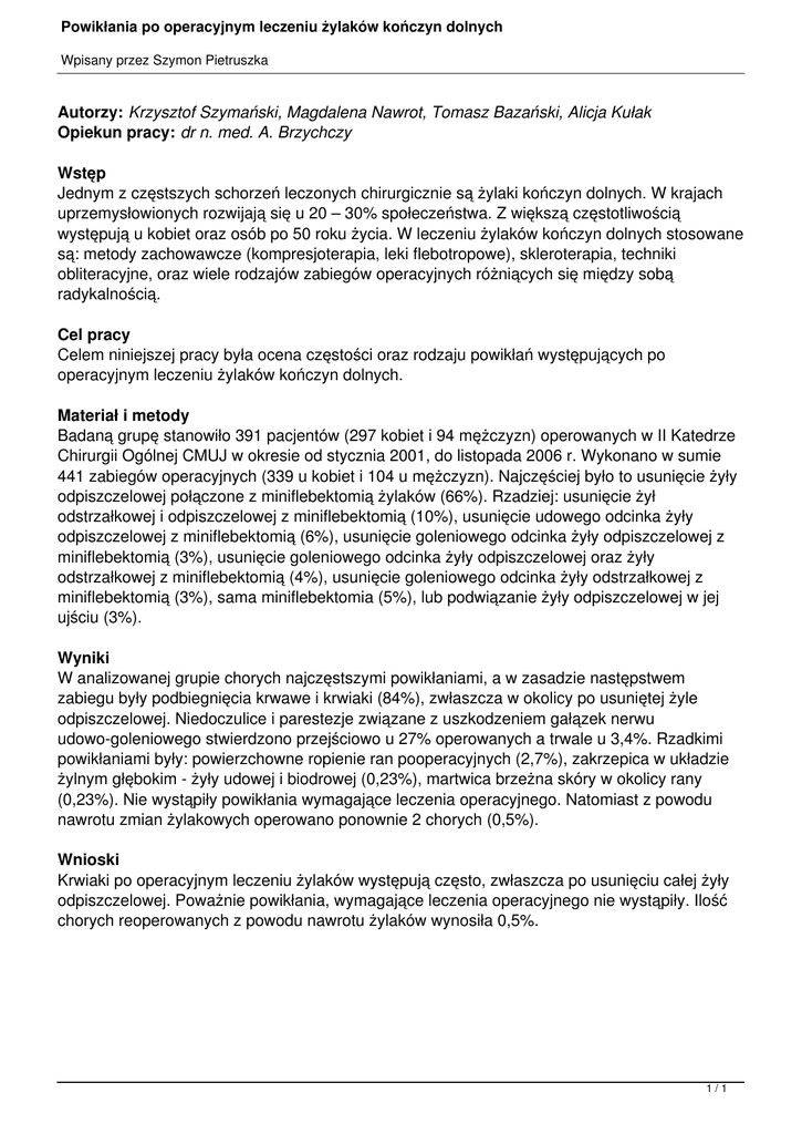 Powikłania po operacyjnym leczeniu żylaków kończyn dolnych Wpisany przez Szymon Pietruszka Autorzy: Krzysztof Szymański, Magdalena Nawrot, Tomasz Bazański, Alicja Kułak Opiekun pracy: dr n. med. A. Brzychczy Wstęp Jednym z częstszych schorzeń leczonych chirurgicznie są żylaki kończyn dolnych. W krajach uprzemysłowionych rozwijają się u 20 – 30% społeczeństwa. Z większą częstotliwością występują u kobiet oraz osób po 50 roku życia. W leczeniu żylaków kończyn dolnych stosowane są: metody zachowawcze (kompresjoterapia, leki flebotropowe), skleroterapia, techniki obliteracyjne, oraz wiele rodzajów zabiegów operacyjnych różniących się między sobą radykalnością. Cel pracy Celem niniejszej pracy była ocena częstości oraz rodzaju powikłań występujących po operacyjnym leczeniu żylaków kończyn dolnych. Materiał i metody Badaną grupę stanowiło 391 pacjentów (297 kobiet i 94 mężczyzn) operowanych w II Katedrze Chirurgii Ogólnej CMUJ w okresie od stycznia 2001, do listopada 2006 r. Wykonano w sumie 441 zabiegów operacyjnych (339 u kobiet i 104 u mężczyzn). Najczęściej było to usunięcie żyły odpiszczelowej połączone z miniflebektomią żylaków (66%). Rzadziej: usunięcie żył odstrzałkowej i odpiszczelowej z miniflebektomią (10%), usunięcie udowego odcinka żyły odpiszczelowej z miniflebektomią (6%), usunięcie goleniowego odcinka żyły odpiszczelowej z miniflebektomią (3%), usunięcie goleniowego odcinka żyły odpiszczelowej oraz żyły odstrzałkowej z miniflebektomią (4%), usunięcie goleniowego odcinka żyły odstrzałkowej z miniflebektomią (3%), sama miniflebektomia (5%), lub podwiązanie żyły odpiszczelowej w jej ujściu (3%). Wyniki W analizowanej grupie chorych najczęstszymi powikłaniami, a w zasadzie następstwem zabiegu były podbiegnięcia krwawe i krwiaki (84%), zwłaszcza w okolicy po usuniętej żyle odpiszczelowej. Niedoczulice i parestezje związane z uszkodzeniem gałązek nerwu udowo-goleniowego stwierdzono przejściowo u 27% operowanych a trwale u 3,4%. Rzadkimi powikłaniami były: powierzchowne ropienie ran pooperacyjnych (2,7%), zakrzepica w układzie żylnym głębokim - żyły udowej i biodrowej (0,23%), martwica brzeżna skóry w okolicy rany (0,23%). Nie wystąpiły powikłania wymagające leczenia operacyjnego. Natomiast z powodu nawrotu zmian żylakowych operowano ponownie 2 chorych (0,5%). Wnioski Krwiaki po operacyjnym leczeniu żylaków występują często, zwłaszcza po usunięciu całej żyły odpiszczelowej. Poważnie powikłania, wymagające leczenia operacyjnego nie wystąpiły. Ilość chorych reoperowanych z powodu nawrotu żylaków wynosiła 0,5%. 1/1