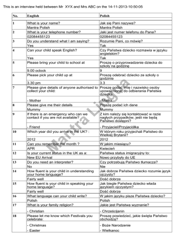 This is an interview held between Mr XYX and Mrs ABC on the 14-11-2013-10:50:05 No. English 1 What is your name? Mantra Polish What is your telephone number? 02084455123 Do you understand what I am saying? Yes Can your child speak English? 5 6 7 8 - Mother Please give me their details Mummy If there is an emergency who can we contact if you are not available? a 9 ua 4 ng 3 Jak się Pani nazywa? Mantra Polish Jaki jest numer telefonu do Pana? 02084455123 Rozumie Pani, co mówię? Tak Czy Państwa dziecko rozmawia w języku angielskim? Yes Tak Please bring your child to school at Proszę o przyprowadzenie dziecka do szkoły na godzinę 9.00 oclock 9 Please pick your child up at Proszę odebrać dziecko ze szkoły o godzinie 3.30 pm 3.3 Please give details of anyone authorised to Proszę podać imię i nazwisko osoby collect your child: upoważnionej do odbierania Państwa dziecka. 12 13 14 15 16 17 18 - Christian Please let me know which Festivals you celebrate: - Chrześcijanin Proszę powiedzieć, jakie święta Państwo obchodzą? - Christmas - Easter - Boże Narodzenie - Wielkanoc tr 2012 Can you remember the month ? APR Is your current status in the UK as a: New EU Arrival Do you need an interpreter? No How fluent is your child in understanding your home language? Fairly well How fluent is your child in speaking your home language? Fairly well What language can your child write? Polish What is your family religion? - Przyjaciel/Przyjaciółka W którym roku przyjechali Państwo do Wielkiej Brytanii? 2012 W jakim miesiącu? Kwiecień Państwa status imigracyjny to: Nowo przybyły do UE Czy potrzebują Państwo tłumacza? Nie Jak dobrze Państwa dziecko rozumie język ojczysty? Dość dobrze Jak biegle Państwa dziecko włada językiem ojczystym? Dość dobrze W jakim języku pisze Państwa dziecko? Polish Jakie jest Państwa wyznanie? an 11 - Friend Which year did you arrive in the UK? : M 10 - Matka Proszę podać ich dane Mummy Z kim należy się kontaktować w razie nagłych przypadków, jeśli nie będą Państwo dostępni? Li 2 Polish No. 19 20 21 22 23 24 ng 30 Li 29 a 28 tr 27 an 26 Polish Czy Państwa dziecko otrzymało przypominającą dawkę szczepień ochronnych przed rozpoczęcięm szkoły? Yes Tak Were the vaccinations for Diphtheria, Czy były to szczepienia przeciwko błonicy, tetanus, whooping cough and Polio? tężcowi, krztuścowi i chorobie Heinego Medina (Polio)? Yes Tak Were the vaccinaions for measles, mumps Czy Państwa dziecko było szczepione and rebella? przeciwko odrze, śwince i różyczce? Yes Tak Does your child need or require any regular Czy Państwa dziecku regularnie podaje się medication during the day? jakieś lekarstwa? No Nie Does your child wear glasses? Czy Państwa dziecko nosi okulary? No Nie Has their hearing been tested? Czy Państwa dziecko miało badanie słuchu? No Nie What is the date of the last test? Jaka jest data ostatniego badania? none none Has your child had any operations? Czy Państwa dziecko poddane było jakimś operacjom? Yes Tak For Ears ? Na uszy? No Nie Tonsillitis ? Migdałki? No Nie Do you have any other medical concerns? Czy niepokoją Państwa inne problemy zdrowotne dziecka? No Nie Does your child have any regular dietary Czy Państwa dziecko przestrzega needs? specjalnej diety? M 25 English Has your child had the pre-school Vaccinations? ua 31 - Vegan Does your child have any food intolerances? 32 - Pineapple - Ananas Does your child have any other allergies or Czy Państwa dziecko ma alergię lub sensitivities or intolerances? nietolerancję pokarmową? 33 - Fur Is your child toilet trained? 34 No Can your child dress themselves? 35 36 - dieta wegańska Czy Państwa dziecko ma nietolerancję pokarmową? - sierść Czy Państwa dziecko potrafi samo pojść do toalety? Nie Czy Państwa dziecko potrafi samo się ubrać? Nie Czy Państwa dziecko śpi w ciągu dnia? No Does your child have a sleep during the day? Yes Tak Does your child attend a weekend school Czy Państwa dziecko uczęszcza w or club where the First Language is taught? weekend do szkoły, w której odbywają się lekcje w języku ojczystym? No Nie 40 English Has your child had any previous experience at: Pre-school What age did they start? 4 Where was it? Dagenham How long was your child there? 41 2 years What subjects has your child studied? 43 44 45 - Matka dziecka - Ojciec dziecka - Bracia - Siostry Ilu? Too many Czy w domu mieszkają jeszcze jacyś inni dorośli? No Nie Please give details of your child’s likes and Proszę napisać, co Państwa dziecko lubi a interests: czego nie lubi? tr 46 - Child’s Mother - Child’s Father - Brothers - Sisters How Many? Too many Are there any other adults living at home? 49 50 51 52 53 54 - Bieganie Hobby: prosimy o dokładny opis Brick laying Proszę napisać, czego nie lubi lub boi się Państwa dziecko? - Cricket What is your child’s favourite toy? - Gra w krykieta Jaka jest ulubiona zabawka Państwa dziecka? - Lego (construction) What else does he like playing with? Custard What else does she like playing with? ? Does your child have any pets at home? - Klocki lego Czym jeszcze lubi się bawić? Custard Czym jeszcze lubi się bawić? ? Czy Państwa dziecko ma swoje zwierzątko w domu? - birds What is the name of the pet? Emu Are you eligible to claim free school meals? - Ptaszki Jak nazywa się to zwierzątko? Emu Czy mogą Państwo korzystać z darmowych posiłków? Tak an 48 - Running Hobbies: please specify Brick laying Please give details of your child’s dislikes and fears: M 47 ua 42 Brick laying Have they used a computer? Yes Who else lives at home? ng 39 Przedszkola W jakim wieku zaczęło? 4 Gdzie to miało miejsce? Dagenham Jak długo Państwa dziecko uczęszczało do tej placówki? 2 lata Jakich przedmiotów uczyło się Państwa dziecko? Brick laying Czy korzystało z komputera? Tak Kto jeszcze mieszka z Państwem w domu? Li 38 Polish Czy Państwa dziecko chodziło do: a No. 37 Yes No. 55 