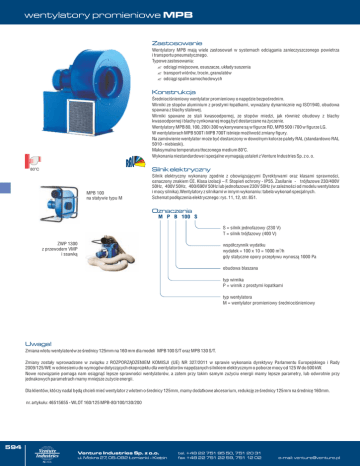 wentylatory promieniowe MPB Zastosowanie Wentylatory MPB mają wiele zastosowań w systemach odciągania zanieczyszczonego powietrza i transportu pneumatycznego. Typowe zastosowania: ? odciągi miejscowe, osuszacze, układy suszenia ? transport wiórów, trocin, granulatów ? odciągi spalin samochodowych Konstrukcja Średniociśnieniowy wentylator promieniowy o napędzie bezpośrednim. Wirniki ze stopów aluminium z prostymi łopatkami, wyważany dynamicznie wg ISO1940, obudowa spawana z blachy stalowej. Wirniki spawane ze stali kwasoodpornej, ze stopów miedzi, jak również obudowy z blachy kwasoodpornej i blachy cynkowanej mogą być dostarczane na życzenie. Wentylatory MPB 80, 100, 200 i 300 wykonywane są w figurze RD, MPB 500 i 700 w figurze LG. W wentylatorach MPB 500T i MPB 700T istnieje możliwość zmiany figury. Na zamówienie wentylator może być dostarczony w dowolnym kolorze palety RAL (standardowo RAL 5010 - niebieski). Maksymalna temperatura tłoczonego medium 80oC. Wykonania niestandardowe i specjalne wymagają ustaleń z Venture Industries Sp. z o. o. Silnik elektryczny 80oC MPB 100 na statywie typu M Silnik elektryczny wykonany zgodnie z obowiązującymi Dyrektywami oraz klasami sprawności, oznaczony znakiem CE. Klasa izolacji – F. Stopień ochrony - IP55. Zasilanie - trójfazowe 230/400V 50Hz, 400V 50Hz, 400/690V 50Hz lub jednofazowe 230V 50Hz (w zależności od modelu wentylatora i mocy silnika).Wentylatory z silnikami w innym wykonaniu: tabela wykonań specjalnych. Schemat podłączenia elektrycznego: rys. 11, 12, str. 851. Oznaczenia M P B 100 S S = silnik jednofazowy (230 V) T = silnik trójfazowy (400 V) ZWP 1300 z przewodem VMP i ssawką współczynnik wydatku wydatek = 100 x 10 = 1000 m3/h gdy statyczne opory przepływu wynoszą 1000 Pa obudowa blaszana typ wirnika P = wirnik z prostymi łopatkami typ wentylatora M = wentylator promieniowy średniociśnieniowy Uwaga! Zmiana wlotu wentylatorów ze średnicy 125mm na 160 mm dla modeli MPB 100 S/T oraz MPB 130 S/T. Zmiany zostały wprowadzone w związku z ROZPORZĄDZENIEM KOMISJI (UE) NR 327/2011 w sprawie wykonania dyrektywy Parlamentu Europejskiego i Rady 2009/125/WE w odniesieniu do wymogów dotyczących ekoprojektu dla wentylatorów napędzanych silnikiem elektrycznym o poborze mocy od 125 W do 500 kW. Nowe rozwiązanie pomaga nam osiągnąć lepsze sprawności wentylatorów, a zatem przy takim samym zużyciu energii mamy lepsze parametry, lub odwrotnie przy jednakowych parametrach mamy mniejsze zużycie energii. Dla klientów, którzy nadal będą chcieli mieć wentylator z wlotem o średnicy 125mm, mamy dodatkowe akcesorium, redukcję ze średnicy 125mm na średnicę 160mm. nr. artykułu: 46515655 - WLOT 160/125 MPB-80/100/130/200 594 wentylatory promieniowe MPB Dane techniczne moc silnika [kW] prędkość obrotowa [obr./min] natężenie znam. [A] napięcie kondensator [V] MPB 60S 0,37 2800 3,00 230 MPB 60T 0,37 2800 1,00 400 Y Typ MPB 80S 0,37 2800 3,00 230 MPB 80T 0,37 2800 1,00 400 Y MPB 100S 0,55 2800 4,00 230 MPB 100T 0,55 2800 1,35 400 Y MPB 130S 0,75 2820 5,10 230 MPB 130T 0,75 2820 1,90 400 Y MPB 200S 1,10 2820 7,90 230 MPB 200T 1,10 2820 2,50 400 Y masa [µF] wydajność max. [m3/h] 12 810 13,5 45511004 810 13,5 45511005 12 18 25 30 nr artykułu [kg] 950 15,5 45511006 950 13,5 45511008 1100 14,5 45511010 1100 14,0 45511030 1500 20,0 45511050 1500 17,5 45511060 2200 25,0 45511070 2200 22,0 45511080 MPB 300T 2,20 2820 4,60 400 Y 3200 35,5 45511090 MPB 500T 4,00 2900 7,50 400 D 6100 56,0 45511100 MPB 700T 7,50 2800 14,00 400 D 8000 82,5 45511110 MPB 900T 15,00 2930 26,70 400 D 7000 280,0 45511117 MPB 1200T 15,00 2930 26,70 400 D 12750 200,0 45511120 MPB 1500 22kW 22,00 2930 42,5 400 D 4800 350,0 45511125 MPB 1500 30kW 30,00 2960 55,0 400 D 8200 440,0 45511126 MPB 1500 37kW 37,00 2960 67,0 400 D 10200 470,0 45511127 Charakterystyki pracy Wymiary [mm] MPB 60 S, MPB 60 T Ciśnienie całkowite [Pa] 3 Wydajność [m /h] MPB 80 S, MPB 80 T Ciśnienie całkowite [Pa] 0,37 kW Wydajność 3 [m /h] www.venture.pl 595 wentylatory promieniowe MPB Charakterystyki pracy Wymiary [mm] MPB 100 S, MPB 100 T Ciśnienie całkowite [Pa] Wydajność [m3/h] MPB 130 S, MPB 130 T Ciśnienie całkowite [Pa] Wydajność 3 [m /h] MPB 200 S, MPB 200 T Ciśnienie całkowite [Pa] Wydajność 3 [m /h] 596 Venture Industries Sp. z o.o. ul. Mokra 27, 05-092 Łomianki - Kiełpin tel. +48 22 751 95 50, 751 20 31 fax +48 22 751 22 59, 751 12 02 e-mail: [email protected] wentylatory promieniowe MPB Charakterystyki pracy Wymiary [mm] MPB 300 T Ciśnienie całkowite [Pa] Wydajność 3 [m /h] MPB 500 T Ciśnienie całkowite [Pa] Wydajność 3 [m /h] MPB 700 T Ciśnienie całkowite [Pa] Wydajność 3 [m /h] www.venture.pl 597 wentylatory promieniowe MPB Charakterystyki pracy Wymiary [mm] MPB 900 Ciśnienie całkowite 7000 6000 15 kW 5000 4000 3000 2000 1000 0 0 1000 2000 3000 4000 5000 6000 7000 8000 [m3/h] Wydajność MPB 1200 [Pa] 5000 Ciśnienie całkowite 4500 (100) 4000 (102) 3500 3000 (98) 2500 15kW (99) 2000 1500 1000 500 0 0 2000 6000 4000 8000 10000 12000 14000 3 Wydajność [m /h] MPB 1500 [Pa] 22 kW 30 kW 8000 37 kW Ciśnienie całkowite 7000 6000 5000 4000 3000 2000 1000 0 -1000 0 2000 4000 6000 8000 10000 Wydajność 12000 14000 16000 3 [m /h] 598 Venture Industries Sp. z o.o. ul. Mokra 27, 05-092 Łomianki - Kiełpin tel. +48 22 751 95 50, 751 20 31 fax +48 22 751 22 59, 751 12 02 e-mail: [email protected]