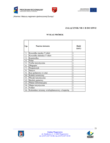 „Warmia i Mazury regionem zjednoczonej Europy” ZAŁĄCZNIK NR 1 B DO SIWZ WYKAZ PRÓBEK Lp. 1. 2. 3. 4. 5. 6. 7. 8. 9. 10. 11. 12. 13. 14. 15. 16. Nazwa towaru Koszulka męska T-shirt Koszulka damska T-shirt Kamizelka Polar Torba turystyczna Długopis Proporczyk Smycz Koc polarowy w etui Kubek termiczny Plecak turystyczny Brelok gumowy Plakat informacyjny Mapa turystyczna Folder Kalendarz ścienny wieloplanszowy z kopertą Ilość (szt.) 1 1 1 1 1 1 1 1 1 1 1 1 1 1 1 1 _______________________________________________________________________________________ 21 Gmina Węgorzewo ul. Zamkowa 3, 11-600 Węgorzewo tel. (0 87) 427 54 00, fax (0 87) 427 54 01