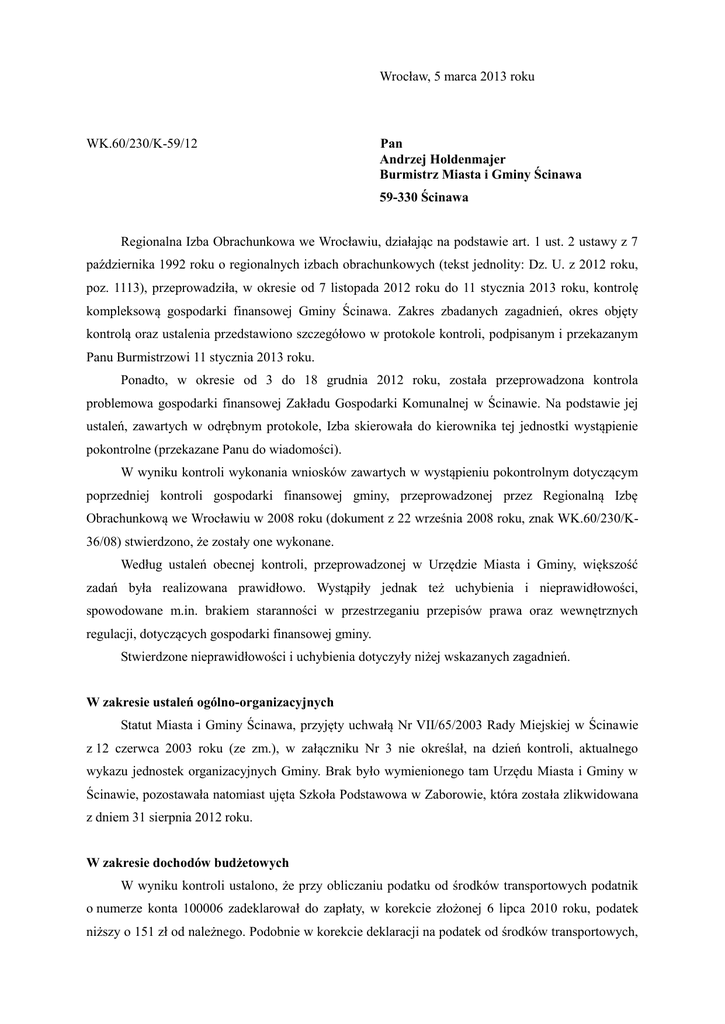 Wrocław, 5 marca 2013 roku WK.60/230/K-59/12 Pan Andrzej Holdenmajer Burmistrz Miasta i Gminy Ścinawa 59-330 Ścinawa Regionalna Izba Obrachunkowa we Wrocławiu, działając na podstawie art. 1 ust. 2 ustawy z 7 października 1992 roku o regionalnych izbach obrachunkowych (tekst jednolity: Dz. U. z 2012 roku, poz. 1113), przeprowadziła, w okresie od 7 listopada 2012 roku do 11 stycznia 2013 roku, kontrolę kompleksową gospodarki finansowej Gminy Ścinawa. Zakres zbadanych zagadnień, okres objęty kontrolą oraz ustalenia przedstawiono szczegółowo w protokole kontroli, podpisanym i przekazanym Panu Burmistrzowi 11 stycznia 2013 roku. Ponadto, w okresie od 3 do 18 grudnia 2012 roku, została przeprowadzona kontrola problemowa gospodarki finansowej Zakładu Gospodarki Komunalnej w Ścinawie. Na podstawie jej ustaleń, zawartych w odrębnym protokole, Izba skierowała do kierownika tej jednostki wystąpienie pokontrolne (przekazane Panu do wiadomości). W wyniku kontroli wykonania wniosków zawartych w wystąpieniu pokontrolnym dotyczącym poprzedniej kontroli gospodarki finansowej gminy, przeprowadzonej przez Regionalną Izbę Obrachunkową we Wrocławiu w 2008 roku (dokument z 22 września 2008 roku, znak WK.60/230/K36/08) stwierdzono, że zostały one wykonane. Według ustaleń obecnej kontroli, przeprowadzonej w Urzędzie Miasta i Gminy, większość zadań była realizowana prawidłowo. Wystąpiły jednak też uchybienia i nieprawidłowości, spowodowane m.in. brakiem staranności w przestrzeganiu przepisów prawa oraz wewnętrznych regulacji, dotyczących gospodarki finansowej gminy. Stwierdzone nieprawidłowości i uchybienia dotyczyły niżej wskazanych zagadnień. W zakresie ustaleń ogólno-organizacyjnych Statut Miasta i Gminy Ścinawa, przyjęty uchwałą Nr VII/65/2003 Rady Miejskiej w Ścinawie z 12 czerwca 2003 roku (ze zm.), w załączniku Nr 3 nie określał, na dzień kontroli, aktualnego wykazu jednostek organizacyjnych Gminy. Brak było wymienionego tam Urzędu Miasta i Gminy w Ścinawie, pozostawała natomiast ujęta Szkoła Podstawowa w Zaborowie, która została zlikwidowana z dniem 31 sierpnia 2012 roku. W zakresie dochodów budżetowych W wyniku kontroli ustalono, że przy obliczaniu podatku od środków transportowych podatnik o numerze konta 100006 zadeklarował do zapłaty, w korekcie złożonej 6 lipca 2010 roku, podatek niższy o 151 zł od należnego. Podobnie w korekcie deklaracji na podatek od środków transportowych, 2 złożonej 14 września 2009 roku, podatnik konta nr 100006 obliczył, a następnie zapłacił podatek wyższy o 38 zł od należnego. Organ podatkowy nie korzystał z uprawnienia przysługującego mu na podstawie art. 274 a § 2 ustawy z dnia 29 sierpnia 1997 r. Ordynacja podatkowa (tekst jednolity: Dz. U. z 2012 nr 749 ze zm.) i nie wzywał podatników do udzielenia wyjaśnień w wyznaczonym terminie. Czynności sprawdzające, o których mowa w art. 272 pkt 3 powołanej ustawy mające na celu sprawdzenie stanu faktycznego, przeprowadzono w trakcie kontroli i wezwano podatników do złożenia wyjaśnień i korekt deklaracji. Odpisu podatku od środków transportowych na koncie podatnika o numerze 100014, z tytułu sprzedanego 31 marca 2009 roku pojazdu, od którego podatek za cały rok wyniósł 1.749 zł, dokonano w nieprawidłowej wysokości 1.166 zł (niższej o 146 zł od prawidłowej). Powyższe było niezgodne z art. 11 ust. 3 ustawy z 12 stycznia 1991 roku o podatkach i opłatach lokalnych (tekst jednolity: Dz. U. z 2010 roku nr 95, poz. 613 ze zm.), wskazującego że jeżeli obowiązek podatkowy powstał lub wygasł w trakcie roku, podatek za ten rok ustala się proporcjonalnie do liczby miesięcy, w których istniał obowiązek. Podatek za miesiące styczeń- marzec wyniósł 437 zł, a odpis powinien wynieść 1.312 zł. Do podatnika konta 230103, zalegającego z zapłatą podatku za okres II rata za 2006 r. - I rata za 2009 r. w łącznej wysokości 164.770 zł, wysyłano upomnienia w większości ze znacznym opóźnieniem w stosunku do terminów, określonych w określonych w § 2 rozporządzenia Ministra Finansów z 22 listopada 2001 roku w sprawie wykonania niektórych przepisów o postępowaniu egzekucyjnym w administracji (Dz. U. Nr 137, poz. 1541 ze zm.), zobowiązującego wierzyciela do systematycznej kontroli terminowości zapłaty zobowiązań pieniężnych oraz z uchybieniem w stosunku do § 20 ust. 4 Instrukcji ewidencji i poboru podatków i opłat w Urzędzie Miasta i Gminy Ścinawa, wprowadzonej zarządzeniem Nr U/81/2006 z 28 grudnia 2006 roku, według której upomnienia sporządzane są nie później niż 35 dni po upływie terminu płatności należności. Tytuły wykonawcze w stosunku do trzech podatników o numerach kont 30115 (na zaległości z tytułu rat od I do IV za 2011 rok, łącznie w wysokości 3.828 zł); 210109 (na zaległości z tytułu rat III- 1.980 zł i IV- 1.982 zł za 2011 rok); 230103 (na zaległości z tytułu rat I- 14.056 zł i II- 14.056 zł za 2007 rok oraz III- 17.930 zł i IV- 17.930 zł raty za 2008 rok) skierowano do organu egzekucyjnego kolejno 4 grudnia 2012 roku, 27 czerwca 2012 roku, 22 stycznia 2008 roku oraz w trakcie kontroli 11 grudnia 2012 roku, ze znacznym opóźnieniem w stosunku do § 5 ust. 1 powołanego rozporządzenia, według którego po bezskutecznym upływie terminu określonego w upomnieniu wierzyciel wystawia tytuł wykonawczy. W zakresie wydatków budżetowych z uwzględnieniem przepisów o zamówieniach publicznych Wybór banku do prowadzenia „Kompleksowej obsługi bankowej budżetu Gminy Ścinawa i jednostek organizacyjnych w okresie od 1 stycznia 2011 roku do 31 grudnia 2013 roku” został dokonany w oparciu o art. 4 pkt 8 ustawy z 29 stycznia 2004 roku Prawo zamówień publicznych (tekst jednolity: Dz. U z 2010 r. nr 113, poz. 759 ze zm.), tj. bez stosowania przepisów tej ustawy. W powyższym przypadku kontrola wykazała, że Zamawiający nie dołoż