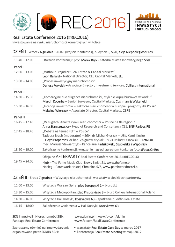 Real Estate Conference 2016 (#REC2016) Inwestowanie na rynku nieruchomości komercyjnych w Polsce DZIEŃ I - Wtorek 6 grudnia – Aula I (wejście z antresoli), budynek C, SGH, aleja Niepodległości 128 11.40 – 12.00 Panel I 12.00 – 13.00 13.00 – 14.00 Panel II 14.30 – 15.30 15.30 – 16.30 Panel III 16.45 – 17.45 17.45 – 18.45 18.50 – 19.00 Otwarcie konferencji: prof. Marek Bryx - Katedra Miasta Innowacyjnego SGH „Without Prejudice: Real Estate & Capital Markets” Leon Ballard – National Director, CEE Capital Markets, JLL „Proces inwestycyjny nieruchomości” Dariusz Forysiak – Associate Director, Investment Services, Colliers International „Komercyjne due diligence nieruchomości, czyli nie kupuj biurowca w worku” Marcin Kocerba – Senior Surveyor, Capital Markets, Cushman & Wakefield „Intencje inwestorów w sektorze nieruchomości w Europie i prognozy dla Polski” Malwina Wierczuk – Associate Director, Capital Markets, CBRE „W cuglach. Analiza rynku nieruchomości w Polsce na tle regionu” Anna Staniszewska – Head of Research and Consultancy CEE, BNP Paribas RE „Debata na temat REIT w Polsce” Tadeusz Brach (moderator) – SGH, dr Michał Głuszak – UEK, Kamil Kosior – Lloyd Properties, dr hab. Zbigniew Krysiak – SGH, Miłosz Olszewski – Activum, mec. Mariusz Stawiarczyk – Kancelaria Radzikowski, Szubielska i Wspólnicy Zakończenie konferencji, wręczenie nagród laureatom konkursu foto #FocusOnRec Oficjalne AFTERPARTY Real Estate Conference 2016 (#REC2016) 19.45 – 24.00 Klub – The Fame Music Club, Nowy Świat 21, www.thefame.pl Nocleg – Patchwork Hostel, Chmielna 5/7, www.patchworkhostel.pl DZIEŃ II - Środa 7 grudnia – Wizytacje nieruchomości i warsztaty w siedzibach partnerów 11.00 – 13.00 Wizytacja Warsaw Spire, plac Europejski 1 – biuro JLL 13.30 – 15.00 Wizytacja Metropolitan, plac Piłsudskiego 3 – biuro Colliers International Poland 14.30 – 16.00 Wizytacja Hali Koszyki, Koszykowa 63 – spotkanie z Griffin Real Estate 16:15 – 18:00 Zakończenie wydarzenia w Hali Koszyki, Koszykowa 63 SKN Inwestycji i Nieruchomości SGH: Fanpage Real Estate Conference: www.skniin.pl | www.fb.com/skniin www.fb.com/RealEstateConference Zapraszamy również na inne wydarzenia organizowane przez SKNIiN SGH: warsztaty Real Estate Case Day w marcu 2017 konferencja Real Estate Meeting w maju 2017 PATRONAT HONOROWY PARTNERZY PLATYNOWI PARTNERZY PARTNERZY AFTERPARTY PARTNER NOCLEGOWY STRATEGICZNY PARTNER MEDIALNY PATRONI MEDIALNI PARTNER MIKOŁAJKOWY STRATEGICZNY PARTNER MULTIMEDIALNY