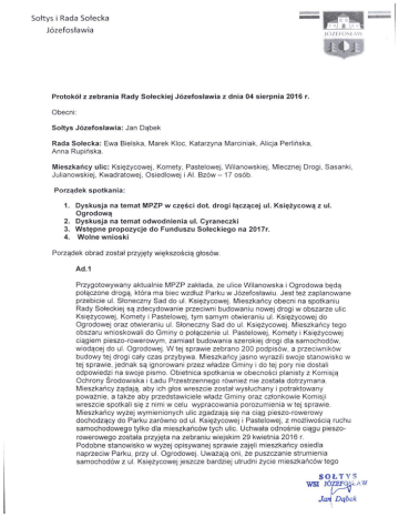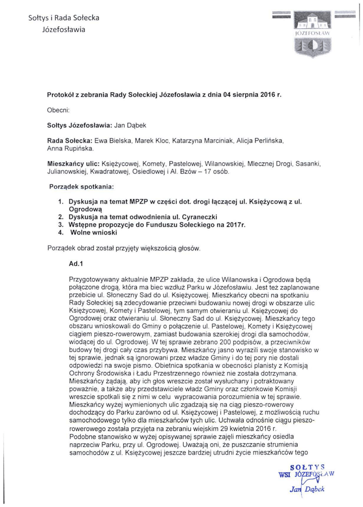 Sottys i R a d a Sołecka Józefosławia Protokół z zebrania Rady Soleckiej Józefosławia z dnia 04 sierpnia 2016 r. Obecni: Sołtys Józefosławia: J a n Dąbek Rada Sołecka: E w a Bielska, Marek Kloc, Katarzyna Marciniak, Alicja Perlinska, Anna Rupińska. Mieszkańcy ulic: Księżycowej, Komety, Pastelowej, Wilanowskiej, Mlecznej Drogi, Sasanki. Julianowskiej, Kwadratowej, Osiedlowej i Al. Bzów - 17 osób. Porządek spotkania: 1. Dyskusja na temat MPZP w części dot. drogi łączącej ul. Księżycową z ul. Ogrodową 2. Dyskusja na temat odwodnienia ul. Cyraneczki 3. Wstępne propozycje do Funduszu Soleckiego na 2017r. 4. Wolne wnioski Porządek obrad został przyjęty większością głosów. Ad.1 Przygotowywany aktualnie MPZP zakłada, że ulice Wilanowska i Ogrodowa będą połączone drogą, która ma biec wzdłuż Parku w Józefosławiu. Jest też zaplanowane przebicie ul. Słoneczny S a d do ul. Księżycowej. Mieszkańcy obecni na spotkaniu Rady Sołeckiej są zdecydowanie przeciwni budowaniu nowej drogi w obszarze ulic Księżycowej, Komety i Pastelowej, tym samym otwieraniu ul. Księżycowej do Ogrodowej oraz otwieraniu ul. Słoneczny S a d do ul. Księżycowej. Mieszkańcy tego obszaru wnioskowali do Gminy o połączenie ul. Pastelowej, Komety i Księżycowej ciągiem pieszo-rowerowym, zamiast budowania szerokiej drogi dla samochodów, wiodącej do ul. Ogrodowej. W tej sprawie zebrano 200 podpisów, a przeciwników budowy tej drogi cały czas przybywa. Mieszkańcy jasno wyrazili swoje stanowisko w tej sprawie, jednak są ignorowani przez władze Gminy i do tej pory nie dostali odpowiedzi na swoje pismo. Obietnica spotkania w obecności planisty z Komisją Ochrony Środowiska i Ładu Przestrzennego również nie została dotrzymana. Mieszkańcy żądają, aby ich głos wreszcie został wysłuchany i potraktowany poważnie, a także aby przedstawiciele władz Gminy oraz członkowie Komisji wreszcie spotkali się z nimi w celu wypracowania porozumienia w tej sprawie. Mieszkańcy wyżej wymienionych ulic zgadzają się na ciąg pieszo-rowerowy dochodzący do Parku zarówno od ul. Księżycowej i Pastelowej, z możliwością ruchu samochodowego tylko dla mieszkańców tych ulic. Uchwała odnośnie ciągu pieszorowerowego została przyjęta na zebraniu wiejskim 29 kwietnia 2016 r. Podobne stanowisko w wyżej opisywanej sprawie zajęli mieszkańcy osiedla naprzeciw Parku, przy ul. Ogrodowej. Uważają oni, że puszczanie strumienia samochodów z ul. Księżycowej jeszcze bardziej utrudni życie mieszkańców tego Wa SOŁTYS JÓZEFOjii.AW Jan Dąbek osiedla. Użytkownicy Parku i ludzie przyjeżdżający do kościoła znacznie zaburzają spokój mieszkariców, szczególnie w niedzielę. W związku z tym nawet w dzień wolny od pracy mieszkańcy osiedla nie mogą odpocząć. Obecni na spotkaniu mieszkańcy Józefosławia uważają, że pobliska ul. Cyraneczki wystarczy do rozwiązania problemów komunikacyjnych Józefosławia, a planowana droga przy Parku nie jest potrzebna. Ponadto droga ta i planowane pobliskie osiedle wiąże się z wycinką starych drzew, co jeszcze bardziej zmniejsza powierzchnie terenów zielonych, tak bardzo potrzebnych naszej miejscowości. Ad. 2 Sołtys poinformował, że można zgłaszać swoje pomysły na wykorzystanie Funduszu Sołeckiego na rok 2017. Wnioski prosimy kierować poprzez wysłanie pisma lub maila na adres Rady Sołeckiej. Ad.3 Po ostatnich intensywnych opadach deszczu na forach internetowych związanych z Józefosławiem rozgorzała dyskusja na temat odwodnienia ulic, min. ul. Cyraneczki. Na dzisiejsze spotkanie Rady Sołeckiej został zaproszony Piotr Kandyba, który miał wiele pytań odnośnie kwestii odwodnienia, jednak nie stawił się na zebraniu. Ogromnym problemem jest brak właściwego odwodnienia a w szczególności zbiorników retencyjnych,o które zabiega od lat sołtys wraz z radą sołecką. Nie ma w tej sprawie reakcji ze strony władz Gminy. Sołtys i Rada Sołecka będą interweniować , aby w nowym planie MPZP były zaznaczone zbiorniki retencyjne i kanalizację dla wód deszczowych oraz o to aby wykonano odwodnienie zapewniające bezpieczeństwo naszych mieszkańców. Ad.4 Wnioski mieszkańców Józefosławia: a. Wniosek mieszkańców osiedla przy ul. X X I wieku, aby zaintenweniować w sprawie psa nieustannie ujadającego i utrudniającego życie okolicznych mieszkańców - posesja przy ul. Wilanowskiej 4. b. Wniosek Pani Pauliny Fulneczek o wymalowanie pasów na ul. Wilanowskiej wraz z załączonym zdjęciem, gdzie te pasy powinny się znaleźć: „...na wysokości ulicy Komety i drugie na wysokości ulicy Księżycowej. Codziennie idąc z dzieckiem na spacer muszę przebiegać Wilanowską. Dodatkowo zdarza się, że kierowcy cticą mi ustąpić pierwszeństwa, zatrzymują się, a pojazd za nimi nie wie o co chodzi i zaczyna wyprzedzać. To bardzo niebezpieczne. Codziennie Wilanowską przechodzi bez pasów kilkadziesiąt osób, w tym mnóstwo dzieci. Chyba nie chcemy czekać na jakąś tragedię, żeby wreszcie ktoś zrobił nam przejścia... ,. Rada Solecka przekaże sprawę do Gminy, c. Prośba mieszkańców ul. Komety o wymalowanie znaków poziomych i oznaczenie spowalniaczy w całym Józefosławiu, zwłaszcza na ul. Wilanowskiej, oraz poprawienie przekrzywionych luster. d. Dwa wnioski mieszkańców osiedla Gueens Garden, ul. Enklawy przy Biedronce: SOŁTYS WSI JÓZEFOSŁA • Jc Sołtys i R a d a Sołecka Józefosławia \t.)/-tfOSt\\\ Cytaty z wypowiedzi mieszkańców - "Rok temu, po nawałnicach, zgłaszałam do straży miejskiej, że na parkingu przy Biedronce (Geodetów/Juiianowska) jest złamane drzewo. Po pół roku w połowie je obcięli, pozostawiając złamany pień. Po co? sama nie wiem... przecież zwalając się na człowieka nawet z tak niewielkiej wysokości (ok. 1,5-2m) i tak może zabić... Może nasi radni coś pomogą (czy to gminni, czy sołeccy)? Codziennie spacerują tamtędy ludzie, także 