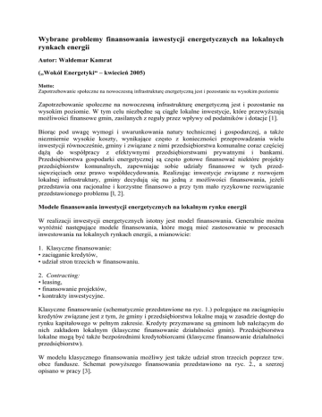 Wybrane problemy finansowania inwestycji energetycznych na lokalnych rynkach energii Autor: Waldemar Kamrat („Wokół Energetyki“ – kwiecień 2005) Motto: Zapotrzebowanie społeczne na nowoczesną infrastrukturę energetyczną jest i pozostanie na wysokim poziomie Zapotrzebowanie społeczne na nowoczesną infrastrukturę energetyczną jest i pozostanie na wysokim poziomie. W tym celu niezbędne są ciągłe lokalne inwestycje, które przewyższają możliwości finansowe gmin, zasilanych z reguły przez wpływy od podatników i dotacje [1]. Biorąc pod uwagę wymogi i uwarunkowania natury technicznej i gospodarczej, a także niezmiernie wysokie koszty, wynikające często z konieczności przeprowadzania wielu inwestycji równocześnie, gminy i związane z nimi przedsiębiorstwa komunalne coraz częściej dążą do współpracy z efektywnymi przedsiębiorstwami prywatnymi i bankami. Przedsiębiorstwa gospodarki energetycznej są często gotowe finansować niektóre projekty przedsiębiorstw komunalnych, zapewniając sobie udziały finansowe w tych przedsięwzięciach oraz prawo współdecydowania. Realizując inwestycje związane z rozwojem lokalnej infrastruktury, gminy decydują się na jedną z możliwości finansowania, jeżeli przedstawia ona racjonalne i korzystne finansowo a przy tym mało ryzykowne rozwiązanie przedstawionego problemu [l, 2]. Modele finansowania inwestycji energetycznych na lokalnym rynku energii W realizacji inwestycji energetycznych istotny jest model finansowania. Generalnie można wyróżnić następujące modele finansowania, które mogą mieć zastosowanie w procesach inwestowania na lokalnych rynkach energii, a mianowicie: 1. Klasyczne finansowanie: • zaciąganie kredytów, • udział stron trzecich w finansowaniu. 2. Contracting: • leasing, • finansowanie projektów, • kontrakty inwestycyjne. Klasyczne finansowanie (schematycznie przedstawione na ryc. 1.) polegające na zaciągnięciu kredytów związane jest z tym, że gminy i przedsiębiorstwa lokalne mają w zasadzie dostęp do rynku kapitałowego w pełnym zakresie. Kredyty przyznawane są gminom lub należącym do nich zakładom lokalnym (klasyczne finansowanie działalności gmin). Przedsiębiorstwa lokalne mogą być także bezpośrednimi kredytobiorcami (klasyczne finansowanie działalności przedsiębiorstw). W modelu klasycznego finansowania możliwy jest także udział stron trzecich poprzez tzw. obce fundusze. Schemat powyższego finansowania przedstawiono na ryc. 2., a szerzej opisano w pracy [3]. W odniesieniu natomiast do formy finansowania tzw. contractingu należy podkreślić, że może on wynikać z faktu, iż efektywne technologie energetyczne oszczędzają energię, lecz przeważnie wejście w ich posiadanie jest zbyt drogie, znacznie skomplikowane i wiąże się z dużym ryzykiem. Jest to częstym powodem rezygnacji z takich inwestycji. Zamiast użytkownika inwestycje związane z projektem, budową i utrzymaniem energetycznych ruchu urządzeń energetycznych mogą przejąć wyspecjalizowane przedsiębiorstwa, posiadające środki finansowe. Takie modele, łączące w sobie finansowanie i utrzymanie w ruchu, nazywane są Energy Contracting. Podstawowe zasady contractingu (leasing, finansowanie projektów, kontrakty inwestycyjne) opisano przykładowo w pracach [1—3] oraz przedstawiono odpowiednio na ryc. 3., 4., 5. W modelu finansowania projektowego (przedstawionego schematycznie na ryc. 5.) powołuje się własny fundusz celowy w formie spółki zajmującej się finansowaniem i wykonaniem projektu przedsięwzięcia [3]. Przedsiębiorstwo projektowe przyjmuje na siebie wybór technologii, planowanie, wykonanie, sfinansowanie i utrzymanie w ruchu. Kolejny sposób finansowania inwestycji energetycznych z grupy contractingu to kontrakty inwestycyjne [3]. Schemat finansowania wg powyższego sposobu pokazano na ryc. 5. W finansowaniu za pomocą kontraktu inwestycyjnego przedsiębiorstwa projektowe (fundusze) stają się właścicielami budowanych lub przejmowanych urządzeń tylko w celach finansowania. W takim przypadku można zamiast przeniesienia własności gruntów zastosować formę dzierżawy wieczystej. Fundusz staje się na tej podstawie właścicielem urządzeń. Generalnie finansowanie inwestycji, związanych z rozwojem energetycznej infrastruktury komunalnej, ma następujące zalety: — pilnie potrzebne inwestycje związane z poprawą gospodarowania energią można wykonać w relatywnie krótkim czasie, — dzięki wysokiej efektywności i dużemu doświadczeniu prywatnych wykonawców, szczególnie w dziedzinie kierowania budową, obniża się nakłady inwestycyjne, — dzięki stosowaniu najlepszego z możliwych know-how są osiągalne krótsze okresy budowy, — lokalna administracja nie musi angażować swoich pracowników, szczególnie w fazie inwestycji, — majątek trwały jednostki terenowej nie jest obciążony z tytułu poręczeń lub innych zabezpieczeń i dzięki temu dostępne środki budżetowe można przeznaczyć na inne cele, — długoterminowo gmina uzyskuje dodatkowe środki finansowe oprócz wpływów z należnych podatków. Również banki obsługujące inwestycje energetyczne odnoszą korzyści, gdyż mimo przyznawania kredytów o znacznej wysokości bez typowych w takich przypadkach zabezpieczeń, ponoszą niewielkie ryzyko, ponieważ gminy lub przedsiębiorstwa lokalne stanowią grupę dłużników o największej wypłacalności i są dla banków najpoważniejszymi partnerami w inwestowaniu. Zakończenie Przedstawione w sposób syntetyczny w niniejszej pracy wybrane problemy finansowania inwestycji na lokalnym rynku energii pokazują, jak ważne jest podjęcie racjonalnej decyzji o inwestowaniu i przygotowaniu procesu inwestycyjnego. Istotne jest przy tym, aby fazy realizacyjne energetyzacji miast, gmin, regionu były poprzedzone badaniami i studiami analitycznymi przy wykorzystaniu zasad zintegrowanego planowania energetycznego. Artyku