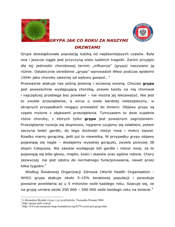 GRYPA JAK CO ROKU ZA NASZYMI DRZWIAMI Grypa dziesiątkowała populację ludzką od najdawniejszych czasów. Była ona i jeszcze ciągle jest przyczyną wielu ludzkich tragedii. Zanim przyjęto dla tej jednostki chorobowej termin „influenza” (grypa) nazywano ją róŜnie. Ostatecznie określenie „grypa” wprowadzili Włosi podczas epidemii 1504r jako choroby zaleŜnej od wpływu gwiazd.. 1 PrzewaŜnie atakuje nas późną jesienią i wczesną wiosną. ChociaŜ grypa jest powszechnie występującą chorobą, prawie kaŜdy na nią chorował i najczęściej przebiega bez powikłań – nie moŜna jej lekcewaŜyć. Nie jest to zwykłe przeziębienie, a wirus o wiele bardziej niebezpieczny, w skrajnych przypadkach mogący prowadzić do śmierci. Objawy grypy są często mylone z objawami przeziębienia. Tymczasem to dwie zupełnie róŜne choroby, z których tylko grypa jest powaŜnym zagroŜeniem. Przeziębienie rozwija się stopniowo, najpierw czujemy się osłabieni, potem zaczyna boleć gardło, do tego dochodzi nieŜyt nosa i mokry kaszel. Rzadko mamy gorączkę, jeśli juŜ to niewielką. W przypadku grypy objawy pojawiają się nagle – dostajemy wysokiej gorączki, zwykle powyŜej 38 stopni Celsjusza. Nie zawsze występuje ból gardła i nieŜyt nosa, za to pojawiają się bóle głowy, mięśni, kości i stawów oraz ogólne robicie. Chory zazwyczaj nie jest zdolny do normalnego funkcjonowania, nawet przez kilka tygodni.2 Według Światowej Organizacji Zdrowia (World Health Organisation WHO) grypa atakuje około 5-15% światowej populacji i powoduje powaŜne powikłania aŜ u 5 milionów osób kaŜdego roku. Szacuje się, Ŝe na grypę umiera około 250 000 – 500 000 osób kaŜdego roku na świecie.3 1 L.Bernadeta Brydak Grypa i jej profilaktyka :Termedia Poznań 2004 http://grypa-info.com.pl 3 http://www.pl.european-lung-foundation.org/8379-czym-jest-grypa.htm 2 Główne objawy grypy: • Wysoka, szybko narastająca temperatura (gorączka) (38˚C/ 100,4˚F lub wyŜsza) • Osłabienie • Ogólne bóle mięśniowe całego ciała, bóle kostno-stawowe • Suchy, kaszel • Ból gardła • Utrata apetytu • Problemy ze spaniem • Wymioty i biegunka (zwłaszcza u dzieci). RóŜnicowanie grypy i przeziębienia na podstawie objawów: Objawy Przeziębienie Grypa Gorączka rzadko charakterystyczna, wysoka gorączka 39-41st.C, trwająca 3-4 dni Ból głowy rzadko intensywny Uogólniony ból mięsni nieznaczny zwykle, często bardzo silny Zmęczenie, osłabienie Nie duŜego stopnia moŜe przeciągnąć się do 2-3 tygodni Skrajne wyczerpanie nigdy wczesne i bardzo nasilone NieŜyt nosa zawsze u 1/3 chorych brak Kichanie zwykle czasami Ból gardła powszechny czasami Ból w klatce piersiowej, kaszel łagodny; intensywny często urywany często, niekiedy o bardzo duŜym nasileniu Niezdolność do pracy często zawsze Grypa to choroba, która prowadzi do groźnych dla zdrowia i Ŝycia powikłań. Coraz więcej informacji wskazuje na udział wirusów grypy w etiologii chorób układu oddechowego tj. zapalenie płuc, zapalenie oskrzeli, zapalenie oskrzelików oraz schorzeń innych układów np.: zapalenie ucha środkowego, zaostrzenie astmy, przewlekła opturacyjna choroba płuc, zaostrzenie mukowiscydozy, zapalenie mięśnia sercowego i osierdzia, drgawki gorączkowe, zapalenie mięśni, niewydolność nerek, powikłania neurologiczne, zaburzenia psychiczne. Powikłania te występują we wszystkich grupach wiekowych, niejednokrotnie mogą zakończyć się zgonem.4 ZakaŜeniom moŜna zapobiegać poprzez : Dbanie o higienę osobistą, zwłaszcza częste i dokładne mycie rąk Odpowiedni ubiór Urozmaiconą dietę bogatą w składniki odŜywcze, witaminy i minerały Aktywność fizyczna Sen i odpoczynek Unikanie kontaktu z chorymi osobami Pozostanie w domu w przypadku złego samopoczucia W przypadku wystąpienia objawów grypopodobnych zgłoszenie się do lekarza pierwszego kontaktu Unikanie dotykania oczu i nosa, aby nie roznosić zarazków Przebywanie na świeŜym powietrzu! Częste wietrzenie pomieszczeń 4 Bernadeta Brydak Grypa i jej profilaktyka :Termedia Poznań 2004 Jedyną skuteczną metodą profilaktyki grypy są szczepienia ochronne. Światowa Organizacja zdrowia profilaktyczne szczepienie zaleca coroczne przeciwko grypie. Zgodnie z rekomendacjami Komitetu Doradczego ds. Szczepień zalecane oraz osobom z WHO szczepienia grup wysokiego te są ryzyka. NaleŜą do nich, ze względu na kryteria kliniczne np.: osoby w wieku 65 lat i więcej, osoby z przewlekłymi chorobami szczególnie układu oddechowego i krąŜenia, pensjonariusze domów dla przewlekle chorych, rencistów, osoby dorosłe i dzieci wymagające stałej opieki lub hospitalizacji. Ze względu na kryteria epidemiologiczne do grup wysokiego ryzyka naleŜą: pracownicy słuŜby zdrowia, szkolnictwa, transportu, handlu, komunikacji, pracownicy duŜych skupisk zawodowych oraz pracownicy naraŜeni na oziębienie jak np. pracownicy budowlani.5 5 Szczepionki i immunoglobuliny .Informator. Red. prof. dr hab. Wiesław Magdzik , Wydawnictwo Lekarskie PZWL Warszawa1999