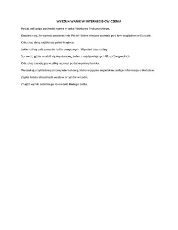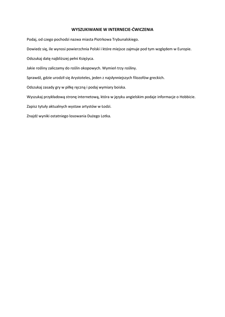 WYSZUKIWANIE W INTERNECIE-ĆWICZENIA Podaj, od czego pochodzi nazwa miasta Piotrkowa Trybunalskiego. Dowiedz się, ile wynosi powierzchnia Polski i które miejsce zajmuje pod tym względem w Europie. Odszukaj datę najbliższej pełni Księżyca. Jakie rośliny zaliczamy do roślin okopowych. Wymień trzy rośliny. Sprawdź, gdzie urodził się Arystoteles, jeden z najsłynniejszych filozofów greckich. Odszukaj zasady gry w piłkę ręczną i podaj wymiary boiska. Wyszukaj przykładową stronę internetową, która w języku angielskim podaje informacje o Hobbicie. Zapisz tytuły aktualnych wystaw artystów w Łodzi. Znajdź wyniki ostatniego losowania Dużego Lotka.
