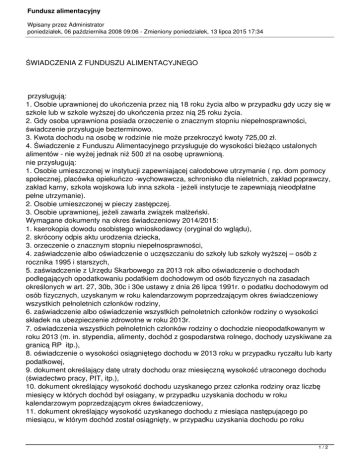 Fundusz alimentacyjny Wpisany przez Administrator poniedziałek, 06 października 2008 09:06 - Zmieniony poniedziałek, 13 lipca 2015 17:34 ŚWIADCZENIA Z FUNDUSZU ALIMENTACYJNEGO przysługują: 1. Osobie uprawnionej do ukończenia przez nią 18 roku życia albo w przypadku gdy uczy się w szkole lub w szkole wyższej do ukończenia przez nią 25 roku życia. 2. Gdy osoba uprawniona posiada orzeczenie o znacznym stopniu niepełnosprawności, świadczenie przysługuje bezterminowo. 3. Kwota dochodu na osobę w rodzinie nie może przekroczyć kwoty 725,00 zł. 4. Świadczenie z Funduszu Alimentacyjnego przysługuje do wysokości bieżąco ustalonych alimentów - nie wyżej jednak niż 500 zł na osobę uprawnioną. nie przysługują: 1. Osobie umieszczonej w instytucji zapewniającej całodobowe utrzymanie ( np. dom pomocy społecznej, placówka opiekuńczo -wychowawcza, schronisko dla nieletnich, zakład poprawczy, zakład karny, szkoła wojskowa lub inna szkoła - jeżeli instytucje te zapewniają nieodpłatne pełne utrzymanie). 2. Osobie umieszczonej w pieczy zastępczej. 3. Osobie uprawnionej, jeżeli zawarła związek małżeński. Wymagane dokumenty na okres świadczeniowy 2014/2015: 1. kserokopia dowodu osobistego wnioskodawcy (oryginał do wglądu), 2. skrócony odpis aktu urodzenia dziecka, 3. orzeczenie o znacznym stopniu niepełnosprawności, 4. zaświadczenie albo oświadczenie o uczęszczaniu do szkoły lub szkoły wyższej – osób z rocznika 1995 i starszych, 5. zaświadczenie z Urzędu Skarbowego za 2013 rok albo oświadczenie o dochodach podlegających opodatkowaniu podatkiem dochodowym od osób fizycznych na zasadach określonych w art. 27, 30b, 30c i 30e ustawy z dnia 26 lipca 1991r. o podatku dochodowym od osób fizycznych, uzyskanym w roku kalendarzowym poprzedzającym okres świadczeniowy wszystkich pełnoletnich członków rodziny, 6. zaświadczenie albo oświadczenie wszystkich pełnoletnich członków rodziny o wysokości składek na ubezpieczenie zdrowotne w roku 2013r. 7. oświadczenia wszystkich pełnoletnich członków rodziny o dochodzie nieopodatkowanym w roku 2013 (m. in. stypendia, alimenty, dochód z gospodarstwa rolnego, dochody uzyskiwane za granicą RP itp.), 8. oświadczenie o wysokości osiągniętego dochodu w 2013 roku w przypadku ryczałtu lub karty podatkowej, 9. dokument określający datę utraty dochodu oraz miesięczną wysokość utraconego dochodu (świadectwo pracy, PIT, itp.), 10. dokument określający wysokość dochodu uzyskanego przez członka rodziny oraz liczbę miesięcy w których dochód był osiągany, w przypadku uzyskania dochodu w roku kalendarzowym poprzedzającym okres świadczeniowy, 11. dokument określający wysokość uzyskanego dochodu z miesiąca następującego po miesiącu, w którym dochód został osiągnięty, w przypadku uzyskania dochodu po roku 1/2 Fundusz alimentacyjny Wpisany przez Administrator poniedziałek, 06 października 2008 09:06 - Zmieniony poniedziałek, 13 lipca 2015 17:34 kalendarzowym poprzedzającym okres świadczeniowy, 12. zaświadczenie właściwego organu gminy lub nakaz płatniczy lub oświadczenie o wielkości gospodarstwa rolnego, wyrażonej w ha przeliczeniowych w 2013 roku, 13. kopia odpisu podlegającego wykonaniu orzeczenia sądu zasądzającego alimenty, odpisu postanowienia sądu o zabezpieczeniu powództwa o alimenty, odpisu protokołu zawierającego treść ugody sądowej lub ugody zawartej przed mediatorem (oryginał do wglądu), 14. przekazy lub przelewy pieniężne dokumentujące faktyczną wysokość otrzymanych alimentów lub zapłaconych alimentów na rzecz osoby z poza rodziny w 2013r. 15. zaświadczenie komornika o wysokości wyegzekwowanych na rzecz wierzyciela alimentów w roku 2013r. 16. zaświadczenie Komornika Sądowego o bezskuteczności egzekucji świadczeń alimentacyjnych (w okresie ostatnich dwóch miesięcy) – oryginał, 17. informację właściwego Sądu lub właściwej instytucji o podjęciu przez osobę uprawnioną czynności związanych z wykonaniem tytułu wykonawczego zagranicą - oryginał, 18. prawomocnego orzeczenie sądu rodzinnego o ustaleniu opiekuna prawnego i inne zaświadczenia lub oświadczenia oraz dowody niezbędne do ustalenia prawa do świadczeń z funduszu alimentacyjnego; 2/2