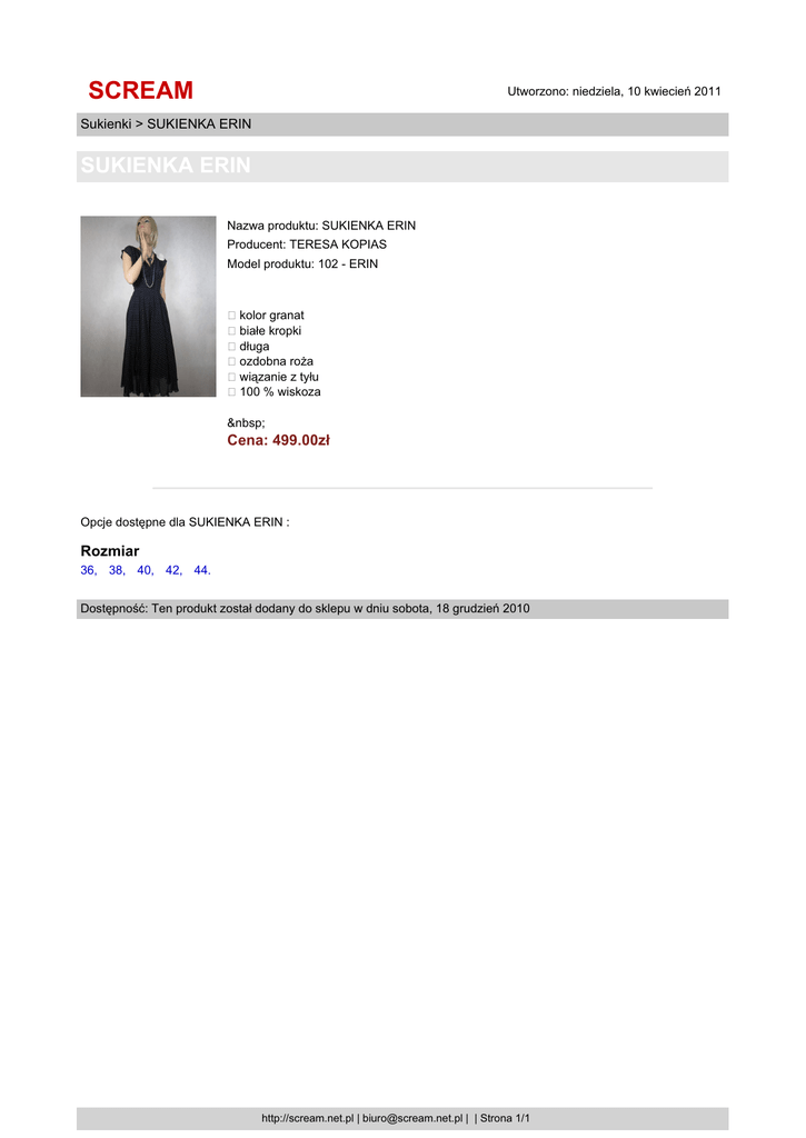 SCREAM Utworzono: niedziela, 10 kwiecień 2011 Sukienki > SUKIENKA ERIN SUKIENKA ERIN Nazwa produktu: SUKIENKA ERIN Producent: TERESA KOPIAS Model produktu: 102 - ERIN kolor granat białe kropki długa ozdobna roża wiązanie z tyłu 100 % wiskoza Cena: 499.00zł Opcje dostępne dla SUKIENKA ERIN : Rozmiar 36, 38, 40, 42, 44. Dostępność: Ten produkt został dodany do sklepu w dniu sobota, 18 grudzień 2010 http://scream.net.pl | [email protected] | | Strona 1/1