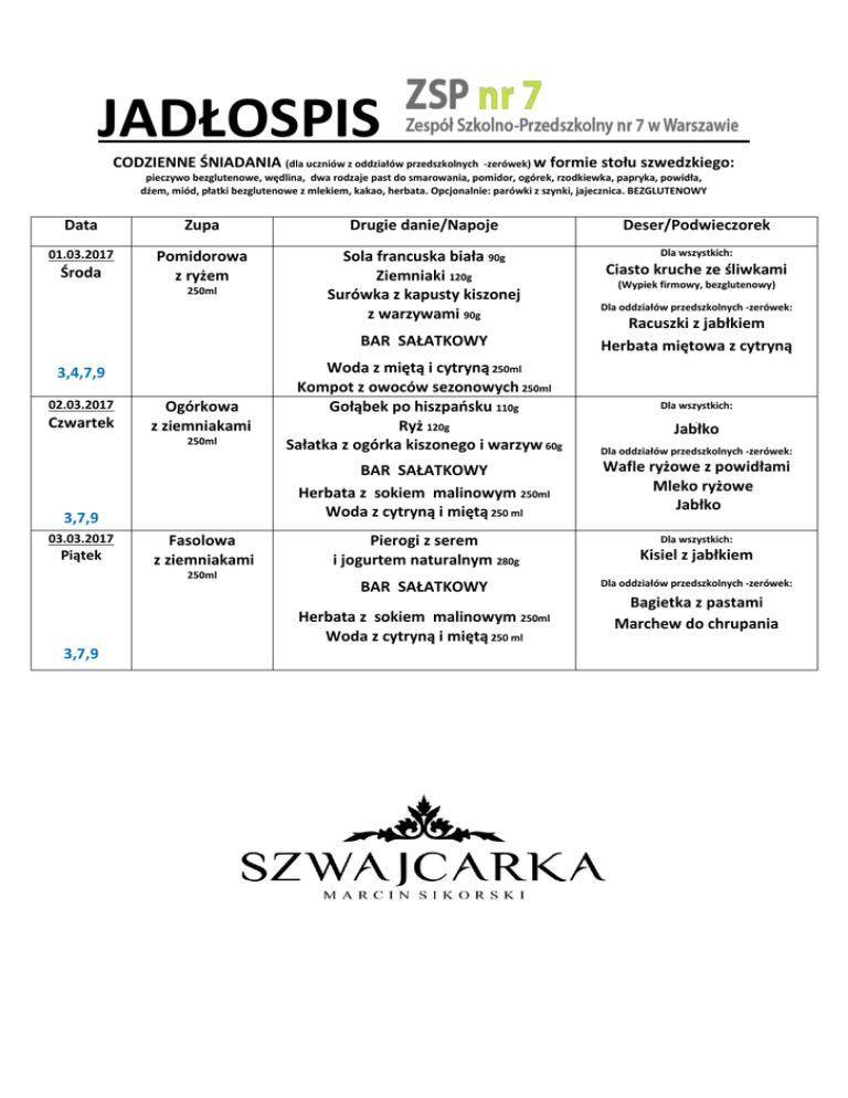 JADŁOSPIS CODZIENNE ŚNIADANIA (dla uczniów z oddziałów przedszkolnych -zerówek) w formie stołu szwedzkiego: pieczywo bezglutenowe, wędlina, dwa rodzaje past do smarowania, pomidor, ogórek, rzodkiewka, papryka, powidła, dżem, miód, płatki bezglutenowe z mlekiem, kakao, herbata. Opcjonalnie: parówki z szynki, jajecznica. BEZGLUTENOWY Data Zupa Drugie danie/Napoje 01.03.2017 Pomidorowa z ryżem Sola francuska biała 90g Ziemniaki 120g Surówka z kapusty kiszonej z warzywami 90g Środa 250ml BAR SAŁATKOWY 3,4,7,9 02.03.2017 Czwartek Ogórkowa z ziemniakami 250ml 3,7,9 03.03.2017 Piątek Fasolowa z ziemniakami 250ml Woda z miętą i cytryną 250ml Kompot z owoców sezonowych 250ml Gołąbek po hiszpańsku 110g Ryż 120g Sałatka z ogórka kiszonego i warzyw 60g Dla wszystkich: Ciasto kruche ze śliwkami (Wypiek firmowy, bezglutenowy) Dla oddziałów przedszkolnych -zerówek: Racuszki z jabłkiem Herbata miętowa z cytryną Dla wszystkich: 1 Jabłko Dla oddziałów przedszkolnych -zerówek: BAR SAŁATKOWY Herbata z sokiem malinowym 250ml Woda z cytryną i miętą 250 ml Wafle ryżowe z powidłami Mleko ryżowe Jabłko Pierogi z serem i jogurtem naturalnym 280g Kisiel z jabłkiem BAR SAŁATKOWY Dla oddziałów przedszkolnych -zerówek: Herbata z sokiem malinowym 250ml Woda z cytryną i miętą 250 ml 3,7,9 Deser/Podwieczorek Dla wszystkich: Bagietka z pastami Marchew do chrupania JADŁOSPIS CODZIENNE ŚNIADANIA (dla uczniów z oddziałów przedszkolnych -zerówek) w formie stołu szwedzkiego: pieczywo bezglutenowe, wędlina, dwa rodzaje past do smarowania, pomidor, ogórek, rzodkiewka, papryka, powidła, dżem, miód, płatki bezglutenowe z mlekiem, kakao, herbata. Opcjonalnie: parówki z szynki, jajecznica. BEZGLUTENOWY Data Zupa 06.03.2017 Barszcz Poniedziałek czerwony z ziemniakami Drugie danie/Napoje Deser/Podwieczorek Pyzy z mięsem i delikatną okrasą 280g Surówka z czerwonej kapusty i jogurtem 60g Mandarynka 250ml Dla wszystkich: Dla oddziałów przedszkolnych -zerówek: Jabłko pieczone z miodem BAR SAŁATKOWY 3,7,9 07.03.2017 Wtorek Krem z warzyw 250ml BAR SAŁATKOWY Woda z miętą i cytryną 250ml Kompot z owoców sezonowych 250ml 3,7,9 08.03.2017 Środa Woda z miętą i cytryną 250ml Lemoniada z pomarańczami 250 m Kotlet schabowy 90g Puree ziemniaczane 120g Bukiet warzyw gotowanych na parze 60g Tradycyjna ogórkowa 250ml Sznycelki w sosie własnym 90g Kasza gryczana 100g Buraczki zasmażane 70g BAR SAŁATKOWY 3,7,9 09.03.2017 Czwartek Kapuśniaczek z ziemniakami 250ml Piątek BAR SAŁATKOWY Woda z miętą i cytryną 250ml Kompot z owoców sezonowych 250ml 3,7,9 10.03.2017 Woda z miętą i cytryną 250ml Kompot z owoców sezonowych 250ml Spaghetti bolognese z serem żółtym 280g Ogórek kiszony 60g Rosół z makaronem 250 ml Filet z soli francuskiej 90g Ziemniaki 120g Surówka z kapusty kiszonej 90g BAR SAŁATKOWY 3,4,7,9 Woda z miętą i cytryną 250ml Kompot z owoców sezonowych 250ml Dla wszystkich: Ciasto marchewkowe (Wypiek firmowy, bezglutenowy) Dla oddziałów przedszkolnych -zerówek: Jogurt naturalny ze świeżymi owocami Bagietka z masłem Dla wszystkich: Jabłko Dla oddziałów przedszkolnych -zerówek: Ciasteczka bezglutenowe Herbatka Dla wszystkich: Kisiel z owocami Dla oddziałów przedszkolnych- zerówek: Bułeczka z serem i chudą wędliną Herbatka z cytryną Dla wszystkich: Ciasto piaskowe (Wypiek firmowy, bezglutenowy) Dla oddziałów przedszkolnych- zerówek: Kisiel z jabłkiem Banan JADŁOSPIS CODZIENNE ŚNIADANIA (dla uczniów z oddziałów przedszkolnych -zerówek) w formie stołu szwedzkiego: pieczywo bezglutenowe, wędlina, dwa rodzaje past do smarowania, pomidor, ogórek, rzodkiewka, papryka, powidła, dżem, miód, płatki bezglutenowe z mlekiem, kakao, herbata. Opcjonalnie: parówki z szynki, jajecznica. BEZGLUTENOWY Data Zupa Drugie danie/Napoje Deser/Podwieczorek 13.03.2017 Krem z selera Poniedziałek 250ml Makaron z delikatnym serkiem i polewą truskawkową 280g Mandarynka BAR SAŁATKOWY Woda z miętą i cytryną 250ml Kompot z owoców sezonowych 250ml 3,7,9 14.03.2017 Wtorek Barszcz biały na wędzonce z ziemniakami 250ml 3,7,9 15.03.2017 Środa Jarzynowa z ziemniakami 250ml Kotlet mielony w chrupiącej panierce 90g Ziemniaki 120g Buraczki na ciepło 70g BAR SAŁATKOWY Woda z miętą i cytryną 250ml Kompot z owoców sezonowych 250ml Gulasz domowy z mięskiem i warzywami 110g Kasza gryczana ekologiczna 90g Marchew gotowana na parze 70g BAR SAŁATKOWY 3,7,9 16.03.2017 Czwartek Grochowa z ziemniakami 250ml Woda z miętą i cytryną 250ml Kompot z owoców sezonowych 250ml Kotlet schabowy 90g Ziemniaki 120g Surówka z kapusty białej z jogurtem i warzywami 70g Dla wszystkich: Dla oddziałów przedszkolnych- zerówek Jogurt naturalny ze świeżymi owocami Bagietka z masłem Herbata z cytryną Dla wszystkich: Ciasto biszkoptowe z owocami (Wypiek firmowy, bezglutenowy) Dla oddziałów przedszkolnych- zerówek: Sałatka tęczowa z owocami i jogurtem Dla wszystkich: Jabłko Dla oddziałów przedszkolnych -zerówek: Placuszki podane z musem malinowym Herbata Dla wszystkich: Budyń pitny Dla oddziałów przedszkolnych -zerówek: Jabłko pieczone z miodem BAR SAŁATKOWY 3,7,9 17.03.2017 Piątek Pomidorowa z makaronem 250ml Woda z miętą i cytryną 250ml Kompot z owoców sezonowych 250ml Sola francuska biała 90 Ziemniaki 120g Surówka z kapusty kiszonej i warzywami 90g BAR SAŁATKOWY 3,4,7,9 Woda z miętą i cytryną 250ml Kompot z owoców sezonowych 250ml Dla wszystkich: Kisiel z owocami Dla oddziałów przedszkolnych -zerówek: Tosty z serem i szynką Herbata JADŁOSPIS CODZIENNE ŚNIADANIA (dla uczniów z oddziałów przedszkolnych -zerówek) w formie stołu szwedzkiego: pieczywo bezglutenowe, wędlina, dwa rodzaje past do smarowania, pomidor, ogórek, rzodkiewka, papryka, powidła, dżem, miód, płatki bezglutenowe z mlekiem, kakao, herbata. Opcjonalnie: parówki z szynki, jajecznica. BEZGLUTENOWY Data Zupa Drugie danie/Napoje Deser/Podwi