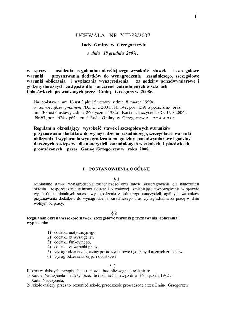 1 UCHWAŁA NR XIII/83/2007 Rady Gminy w Grzegorzewie z dnia 18 grudnia 2007r. w sprawie ustalenia regulaminu określającego wysokość stawek i szczegółowe warunki przyznawania dodatków do wynagrodzenia zasadniczego, szczegółowe warunki obliczania i wypłacania wynagrodzenia za godziny ponadwymiarowe i godziny doraźnych zastępstw dla nauczycieli zatrudnionych w szkołach i placówkach prowadzonych przez Gminę Grzegorzew 2008r. Na podstawie art. 18 ust 2 pkt 15 ustawy z dnia 8 marca 1990r. o samorządzie gminnym /Dz. U. z 2001r. Nr 142, poz. 1591 z późn. zm./ oraz art. 30 ust 6 ustawy z dnia 26 stycznia 1982r. Karta Nauczyciela /Dz. U. z 2006r. Nr 97, poz. 674 z późn. zm./ Rada Gminy w Grzegorzewie u c h w a l a Regulamin określający wysokość stawek i szczegółowych warunków przyznawania dodatków do wynagrodzenia zasadniczego, szczegółowe warunki obliczania i wypłacania wynagrodzenia za godziny ponadwymiarowe i godziny doraźnych zastępstw dla nauczycieli zatrudnionych w szkołach i placówkach prowadzonych przez Gminę Grzegorzew w roku 2008 . I . POSTANOWIENIA OGÓLNE §1 Minimalne stawki wynagrodzenia zasadniczego oraz tabelę zaszeregowania dla nauczycieli określa rozporządzenie Ministra Edukacji Narodowej zmieniające rozporządzenie w sprawie wysokości minimalnych stawek wynagrodzenia zasadniczego nauczycieli, ogólnych warunków przyznawania dodatków do wynagrodzenia zasadniczego oraz wynagradzania za pracę w dniu wolnym od pracy. §2 Regulamin określa wysokość stawek, szczegółowe warunki przyznawania, obliczania i wypłacania: 1) 2) 3) 4) 5) 6) dodatku motywacyjnego, dodatku za wysługę lat, dodatku funkcyjnego, dodatku za warunki pracy, wynagrodzenia za godziny ponadwymiarowe i godziny doraźnych zastępstw, wynagrodzenia za zajęcia dodatkowe § 3 Ilekroć w dalszych przepisach jest mowa bez bliższego określenia o: 1/ Karcie Nauczyciela - należy przez to rozumieć ustawę z dnia 26 stycznia 1982r.Karta Nauczyciela; 2/ szkole -należy przez to rozumieć szkołę, przedszkole prowadzone przez Gminę Grzegorzew; 2 3/ nauczycielu – należy przez to rozumieć również wychowawcę , wychowawcę świetlicy szkolnej, nauczyciela bibliotekarza, pedagoga szkolnego, logopedę i innego pracownika pedagogicznego zatrudnionego w jednostce o której mowa w pkt 2; 4/dyrektorze lub wicedyrektorze - należy przez to rozumieć dyrektora lub wicedyrektora jednostki, o której mowa w pkt 2 II. DODATEK MOTYWACYJNY §4 1. W każdej szkole tworzy się fundusz przeznaczony na dodatki motywacyjne dla nauczycieli w wysokości zgodnej z uchwałą budżetową Gminy Grzegorzew i wynoszący 3 % planowanych środków na wynagrodzenia zasadnicze dla nauczycieli. 2. Dodatek motywacyjny ma charakter uznaniowy i winien być zróżnicowany w zależności od spełnienia kryteriów o których mowa w ust 3 3. Przy ustalaniu prawa do dodatku motywacyjnego dla nauczyciela i jego wysokości uwzględnia się: 1) uzyskanie przez uczniów, z uwzględnieniem ich możliwości i pracy nauczyciela, co najmniej dobrych osiągnięć dydaktyczno-wychowawczych potwierdzonych wynikami klasyfikacji lub promocji, efektami egzaminów i sprawdzianów albo sukcesami w olimpiadach, konkursach, zawodach itp. 2) umiejętność rozwiązywania problemów wychowawczych uczniów we współpracy z rodzicami, 3) pełne rozpoznanie środowiska wychowawczego uczniów, aktywne i efektywne działanie na rzecz uczniów potrzebujących szczególnej opieki, 4) systematyczne i efektywne przygotowywanie się i wypełnianie przydzielonych obowiązków, 5) wzbogacenie własnego warsztatu pracy, 6) dbałość o estetykę pomieszczeń i sprawność powierzonych pomocy dydaktycznych oraz innych urządzeń szkolnych, 7) prawidłowe prowadzenie dokumentacji pedagogicznej, 8) rzetelne i terminowe wywiązywanie się z poleceń służbowych, 9) przestrzeganie dyscypliny pracy, 10) prowadzenie zajęć w zwiększonych liczebnie oddziałach. 11) zaangażowanie w realizację czynności i zadań : a) udział w organizowaniu imprez i uroczystości szkolnych b) opieka nad samorządem uczniowskim lub innymi organizacjami uczniowskimi działającymi na terenie szkoły, c) aktywny udział w realizowaniu innych zadań statutowych szkoły. 4. O wysokości dodatku motywacyjnego dla dyrektorów szkół poza warunkami wymienionymi w ust. 3 odnoszącymi się do stanowiska dyrektora dodatek różnicuje się w zależności od spełnienia niżej wymienionych kryteriów a w szczególności: 1) skuteczne zarządzanie szkołą zapewniające ciągły rozwój i doskonalenie jakości jej pracy; 2) właściwą współpracę z organem prowadzącym i nadzorującym szkołę; 3) współdziałanie z organami szkoły i związkami zawodowymi; osiągnięcia szkoły w pracy dydaktyczno – wychowawczej i opiekuńczej; 4) wspieranie nauczycieli w realizacji ich zadań, samokształceniu i doskonaleniu zawodowym 5) przestrzeganie dyscypliny budżetowej 6) merytoryczne i życzliwe załatwianie spraw osobowych pracowników oraz 3 spraw uczniowskich i ich rodziców; 7) pozyskiwanie środków pozabudżetowych; 8) promocja szkoły na zewnątrz. §5 1. Wysokość dodatku motywacyjnego dla nauczyciela przyznaje dyrektor szkoły w oparciu o opracowane kryteria w wysokości od 1 do 30 % wynagrodzenia zasadniczego nauczyciela w uzgodnieniu z organizacją związkową. 2. Dodatek motywacyjny dla nauczyciela może być przyznawany dwa razy w roku na okres 6 miesięcy. 3. Dodatek motywacyjny dla dyrektorów szkół przyznaje Wójt w uzgodnieniu z organizacją związkową. §6 1. Prawo do dodatku motywacyjnego nauczyciel nabywa po przepracowaniu roku szkolnego w danej szkole. 2. Dodatek motywacyjny nie przysługuje za czas nie realizowania przez nauczyciela godzin dydaktycznych, wychowawczych lub opiekuńczych z powodu przebywania nauczyciela na: a. urlopie dla poratowania zdrowia, b. zwolnieniu lekarskim . 3. Nauczycielom, którym powierzono stanowisko kierownicze dodatek mot