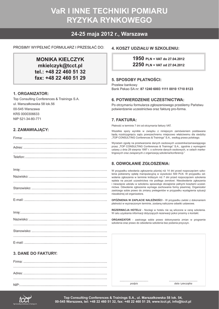 VaR i inne techniki pomiaru ryzyka rynkowego 24-25 maja 2012 r., Warszawa PROSIMY WYPEŁNIĆ FORMULARZ I PRZESŁAĆ DO: MONIKA KIELCZYK [email protected] tel.: +48 22 460 51 32 fax: +48 22 460 51 29 4. KOSZT UDZIAŁU W SZKOLENIU: 1950 PLN + VAT do 27.04.2012 2250 PLN + VAT od 27.04.2012 5. SPOSOBY PŁATNOŚCI: Przelew bankowy Bank Pekao SA nr: 87 1240 6003 1111 0010 1710 8123 1. organizator: Top Consulting Conferences & Trainings S.A. ul. Marszałkowska 58 lok.56 6. POTWIERDZENIE UCZESTNICTWA: Po otrzymaniu formularza zgłoszeniowego prześlemy Państwu potwierdzenie uczestnictwa oraz fakturę pro-forma. 00-545 Warszawa KRS 0000306633 NIP 521-34-80-771 7. FAKTURA: Płatność w terminie 7 dni od otrzymania faktury VAT. 2. Zamawiający: Firma:............................................................................................ ...................................................................................................... Adres:............................................................................................ ...................................................................................................... Telefon:.......................................................................................... Wszelkie spory wynikłe w związku z niniejszym zamówieniem poddawane będą rozstrzygnięciu sądu powszechnemu miejscowo właściwemu dla siedziby „TOP CONSULTING Conferences & Trainings” S.A., według prawa polskiego. Wyrażam zgodę na przetwarzanie danych osobowych uczestnika/zamawiającego przez „TOP CONSULTING Conferences & Trainings” S.A., zgodnie z wymogami ustawy z dnia 29 sierpnia 1997 r. o ochronie danych osobowych, w celach marketingowych oraz związanych z organizacją szkolenia/konferencji.” 8. ODWOŁANIE ZGŁOSZENIA: Imię:............................................................................................... Nazwisko:...................................................................................... ...................................................................................................... Stanowisko:................................................................................... ...................................................................................................... E-mail:........................................................................................... W przypadku odwołania zgłoszenia pózniej niż 14 dni przed rozpoczęciem szkolenia pobieramy opłatę manipulacyjną w wysokości 500 PLN. W przypadku odwołania zgłoszenia w terminie krótszym niż 7 dni przed rozpoczęciem szkolenia wpłata na poczet uczestnictwa nie podlega zwrotowi. Nieodwołanie zgłoszenia i niewzięcie udziału w szkoleniu spowoduje obciążenie pełnymi kosztami uczestnictwa. Odwołanie zgłoszenia wymaga zachowania formy pisemnej. Organizator zastrzega sobie prawo do zmiany prelegentów w przypadku wystąpienia sytuacji niezależnej od organizatora. OPÓŹNIENIA W ZAPŁACIE NALEŻNOŚCI - W przypadku zwłoki z dokonaniem płatności w wyznaczonym terminie, zostaną naliczone odsetki ustawowe. Imię:............................................................................................... REZERWACJA HOTELU - Noclegi w hotelu nie są wliczone w cenę szkolenia. W celu uzyskania informacji dotyczących rezerwacji pokoi prosimy o kontakt. Nazwisko:...................................................................................... ...................................................................................................... ORGANIZATOR - zastrzega sobie prawo dokonywania zmian w programie szkolenia oraz prawo do odwołania szkolenia bez podania przyczyn. Stanowisko:................................................................................... ...................................................................................................... E-mail:........................................................................................... 3. Dane do faktury: Firma:............................................................................................ ...................................................................................................... Adres:............................................................................................ ...................................................................................................... NIP:............................................................................................... ............................... podpis ............................... data i pieczątka Top Consulting Conferences & Trainings S.A., ul. Marszałkowska 58 lok. 54, 00-545 Warszawa, tel: +48 22 460 51 32, fax: +48 22 460 51 29, www.tcct.pl, [email protected]