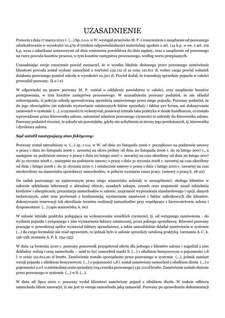 UZASADNIENIE Pozwem z dnia 17 marca 2011 r. (...) Sp. z o.o. w W. wystąpił przeciwko M. P. z roszczeniem o zasądzenie od pozwanego odszkodowania w wysokości 10.479 zł tytułem odpowiedzialności materialnej zgodnie z art. 114 k.p. w zw. z art. 119 k.p. wraz z odsetkami ustawowymi od dnia wniesienia powództwa do dnia zapłaty, oraz o zasądzenie od pozwanego na rzecz powoda kosztów procesu, w tym kosztów zastępstwa procesowego, według norm przepisanych. Uzasadniając swoje roszczenie powód zaznaczył, że w wyniku błędnie złożonego przez pozwanego zamówienia klientowi powoda został wydany samochód o wartości 132.112 zł za cenę 121.611 zł, wobec czego powód wskutek działania pozwanego poniósł szkodę w wysokości 10.501 zł. Powód dodał, że transakcję sprzedaży pojazdu w całości prowadził pozwany. (k.2 i n) W odpowiedzi na pozew pozwany M. P. wniósł o oddalenie powództwa w całości, oraz zasądzenie kosztów postępowania, w tym kosztów zastępstwa procesowego. W uzasadnieniu pozwany podniósł, że nie składał zobowiązania, iż pokryje szkodę spowodowaną sprzedażą zamówionego przez niego pojazdu. Pozwany podniósł, że do jego obowiązków nie należało wystawianie ostatecznych faktur sprzedaży i faktur pro forma, ani dokonywanie zamówień w systemie (...), a czynności te wykonywał, ponieważ istniała taka praktyka w dziale handlowym, co zostało wprowadzone przez Kierownika salonu, natomiast zdaniem pozwanego czynności te należały do Kierownika salonu. Pozwany podniósł również, że szkoda nie powstałaby, gdyby nie uchybienia ze strony jego przełożonych, tj. kierownika i dyrektora salonu. Sąd ustalił następujący stan faktyczny: Pozwany został zatrudniony w (...) sp. z o.o. w W. od dnia 20 listopada 2006 r. początkowo na podstawie umowy o pracę z dnia 20 listopada 2006 r. zawartej na okres próbny od dnia 20 listopada 2006 r. do 19 lutego 2007 r., a następnie na podstawie umowy o pracę z dnia 20 lutego 2007 r. zawartej na czas określony od dnia 20 lutego 2007 do 31 stycznia 2008 r., następnie na podstawie umowy o pracę z dnia 31 stycznia 2008 r. zawartej na czas określony od dnia 1 lutego 2008 r. do 31 stycznia 2010 r. i ostatecznie umowy o pracę z dnia 1 lutego 2010 r. zawartej na czas nieokreślony na stanowisku sprzedawcy samochodów, w pełnym wymiarze czasu pracy. (umowy o pracę k. 18-22) Do zadań pozwanego na zajmowanym przez niego stanowisku należały w szczególności: obsługa klientów w zakresie udzielania informacji o aktualnej ofercie, zasadach zakupu, cenach oraz znajomość zasad udzielania kredytów i ubezpieczeń; prezentacja samochodów w salonie, znajomość wyposażenia standardowego i opcji, danych technicznych, zalet oraz porównań z konkurencją; wystawianie zamówień i faktur zaliczkowych dla klientów, dokonywanie rezerwacji lub określanie terminu realizacji samochodów przy współpracy z kierownictwem salonu i dysponentami (...) (opis stanowiska, k. 60) W salonie istniała praktyka polegająca na wykonywaniu wszelkich czynności, tj. od wstępnego zamówienia - do wydania pojazdu i związanego z nim wystawienia faktury ostatecznej, przez jednego sprzedawcę. Również pozwany pracując w powodowej spółce wystawiał faktury sprzedażowe, a także samodzielnie składał zamówienia w systemie (...) do czego formalnie nie miał uprawnień, co jednak było w salonie sprzedaży ustaloną praktyką. (zeznania A. C. k. 156-158, zeznania A. P. k. 154-155) W dniu 14 kwietnia 2010 r. pozwany pracownik przygotował ofertę dla jednego z klientów salonu i uzgodnił z nim dokładny rodzaj i cenę samochodu – miał to być samochód marki S. (...) z silnikiem benzynowym o pojemności 1,8 l. w cenie 121.611,00 zł brutto. Zamówienie zostało sporządzone przez pozwanego w systemie (...), jednak zamiast wersji pojazdu z silnikiem benzynowym (...) o pojemności 1,8 l. został zamówiony samochód z silnikiem diesla (...) o pojemności 2,0 l. o minimalnej cenie sprzedaży (wg cennika pozwanego) 132.112 zł brutto. Zamówienie zostało złożone przez pozwanego w systemie (...) w S. (...). W dniu 28 lipca 2010 r. pozwany wydał klientowi zamówiony pojazd z silnikiem diesla. W trakcie odbioru samochodu klient zauważył, iż nie jest to wersja samochodu jaką zamawiał. Pozwany po sprawdzeniu dokumentacji zamówieniowej zauważył, że od momentu zamówienia cała sporządzona przez niego dokumentacja (łącznie z fakturami, dokumentami leasingowymi) została przygotowana dla samochodu z silnikiem diesla, tj. 2,0 (...), z tym, że niezmieniona pozostała cena, która była ceną samochodu z silnikiem benzynowym (...), tj. ceną niższą niż najniższa cena dla samochodu z silnikiem diesla, tj. 2,0 (...) wg oferty handlowej. (zeznania powoda, oferta handlowa, zamówienie oraz faktury, k. 26 i 35-41) Po zauważeniu błędu powód skontaktował się z kierownikiem salonu (...), który przebywał poza siedzibą salonu, który wskazał powodowi, że porozmawiają o zaistniałej sytuacji po jego powrocie do miejsca pracy. (zeznania P. A. k. 122-126) Powód starał się w tym czasie przekonać klienta do zamówienia dla niego właściwego samochodu, lecz klient nie wyraził zgody na takie działanie. W wyniku rozmów z klientem otrzymał on dostarczony mu pojazd z silnikiem diesla (...), za cenę widniejącą na dokumentach przygotowywanych przez pozwanego w tym zamówieniu, a przez to również na fakturze, tj. 121.611,00 zł. (bezsporne, faktura k. 41) Powód w dniu 30 lipca 2010 r. złożył wypowiedzenie umowy o pracę z zachowaniem trzymiesięcznego okresu wypowiedzenia, lecz wbrew sugestii dyrektora powód złożył je oficjalnie, a po wpisaniu wypowiedzenia do dziennika korespondencji przekazał je dyrektorowi. (wypowiedzenie k. 59) Po wręczeniu wypowiedzenia pozwany został poproszony o wyjaśnienie na piśmie sytuacji związanej ze sprzedażą samochodu S. (...) po zaniżonej cenie. Pozwan
