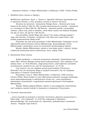 Tajemnice bolesne w Roku Miłosierdzia i Jubileuszu 1050r. Chrztu Polski 1. Modlitwa Pana Jezusa w Ogrójcu Modlitewne spotkanie Syna z Ojcem w Ogrodzie Oliwnym wprowadza nas w tajemnicę Paschy, a więc przejścia Jezusa ze śmierci do życia. Zaczyna się szczerym wyznaniem Bożego Syna: „ Smutna jest moja dusza aż do śmierci” (Mt 26, 38) i prośbą skierowaną do uczniów: „ Zostańcie tu i czuwajcie ze Mną”.(Mt 26, 38) Kończy - słowami prośby i synowskiej ufności: „Ojcze mój, jeśli to możliwe, niech Mnie ominie ten kielich! Wszakże nie jak Ja chcę, ale jak Ty”.( Mt 26,42) Czy potrafimy zaufać Bogu jak Jezus? Czy mamy odwagę przyjąć z Jego rąk chorobę, trudności, cierpienie? Jak silna jest nasza wiara i jak wielkie posłuszeństwo Bożej woli? Pochylmy się nad tymi pytaniami w Rok Miłosierdzia. Szukajmy na nie odpowiedzi przed obrazem Jezusa Miłosiernego. Kontemplujmy Twarz Miłosiernego i otwierajmy serca na strumienie przebaczającej miłości. Maryjo, Matko Miłosierdzia, odnów w nas łaskę wiary i ufności, byśmy codziennie powtarzali słowa zawierzenia: Jezu, ufamy Tobie. 2. Biczowanie Pana Jezusa Każde spotkanie z Jezusem przemienia człowieka. Doświadczył tego także Piłat. Pewnie dlatego wyznał przed oskarżycielami: „Nie znajduję w nim żadnej winy”. (J 19,6) Niestety, uległ presji tłumu i pod wpływem nacisków zewnętrznych „wydał Go im, aby Go ukrzyżowano”. (J 19,16) Czy czasem i my nie ulegamy presji przeciwników Chrystusa i Kościoła? Czy nie biczujemy Boga w naszych braciach? Czy nie zabijamy Jego głosu w naszych sumieniach? Pomyślmy o tym w Roku Miłosierdzia i Jubileuszu 1050.rocznicy Chrztu Polski. Niech będzie to czas odkrywania świętości naszego osobistego życia zapoczątkowanego w sakramencie chrztu św., czas wypełniania zobowiązań chrzcielnych i napełniania naszych glinianych ciał kroplami Miłosierdzia. Maryjo, Matko pięknej Miłości, odnów w nas pragnienie umartwienia ciał i podjęcia czynów miłości w łączności z cierpiącym Chrystusem. 3. Cierniem ukoronowanie „ Jezus wyszedł na zewnątrz w koronie cierniowej i płaszczu purpurowym a Piłat rzekł: „Oto Człowiek”. (J 19,5) Nie rozpoznali w Skazańcu Sprawiedliwego. Nie wystarczyło im opluwanie, policzkowanie i poniżanie Jezusa. Pragnęli Jego śmierci. opr. R.Ziarko-Podlaska Pomyślmy, ile razy my koronowaliśmy Jezusa cierniami naszego życia. Ile razy poniżaliśmy Go w naszych braciach i opluwaliśmy w ich twarzach. Ile razy pragnęliśmy, by umarł, a przynajmniej zniknął z przestrzeni publicznej. Prośmy, by Rok Miłosierdzia otworzył nasze oczy na ogrom zła obecnego w świecie i bezmiar Chrystusowej Łaski. Zacznijmy szukać Bożego przebaczenia, Bożych śladów w naszym życiu. Podążajmy za naszym Cierpiącym Królem do królestwa prawdy, miłości i sprawiedliwości. Maryjo, Matko Bolesna, pomóż nam zrozumieć tajemnicę Króla wszechświata, który stał się Człowiekiem, by przyjąć na siebie brzemię naszych grzechów. Naucz nas współcierpieć z Tobą i poranionymi braćmi. 4. Droga krzyżowa Pana Jezusa „Kto chce iść za mną, niech się zaprze samego siebie, niech weźmie swój krzyż i niech Mnie naśladuje”. (Mt 16,24) Podejmijmy to trudne zaproszenie w Roku Jubileuszu 1050-lecia Chrztu Polski i uczyńmy je programem Roku Miłosierdzia. Pójdźmy za Jezusem z krzyżami naszej niewiary i obojętności wobec spraw Kościoła, z krzyżami zwątpienia i zniechęcenia .Uznajmy je za swoje i połączmy z krzyżem Syna Bożego w nadziei, że je przyjmie i przemieni. Maryjo stojąca pod krzyżem, prowadź nas drogami Pana i wciąż przypominaj, że sakrament pokuty i pojednania to najdoskonalsze źródło Bożego Miłosierdzia i narzędzie duchowej przemiany narodu. 5. Śmierć Pana Jezusa „Zawołał donośnym głosem: „Ojcze, w Twoje ręce powierzam ducha mojego. Po tych słowach wyzionął ducha”. (Łk 23,46) Umarł Człowiek, ale zatriumfował nieśmiertelny Bóg. Przywrócił utracony porządek świata i wlał w serca nadzieję. Czy dziś, w poranionym świecie, potrafimy patrzeć na to misterium paschalne z nadzieją? Czy wciąż ufamy Zmartwychwstałemu? Czy wierzymy w osobistą oraz duchową przemianę państw i narodów? Jeśli wierzymy, to polećmy Zbawicielowi trudne sprawy naszych rodzin, naszej Ojczyzny i świata. Prośmy Go z ufnością : Jezu, miej miłosierdzie dla nas i całego świata. Przygotuj świat na Twoje zmartwychwstanie. Maryjo, wspomożycielko wiernych, ucz nas pokornej służby i ufnego kroczenia za Zmartwychwstałym po ścieżkach naszej codzienności. opr. R.Ziarko-Podlaska