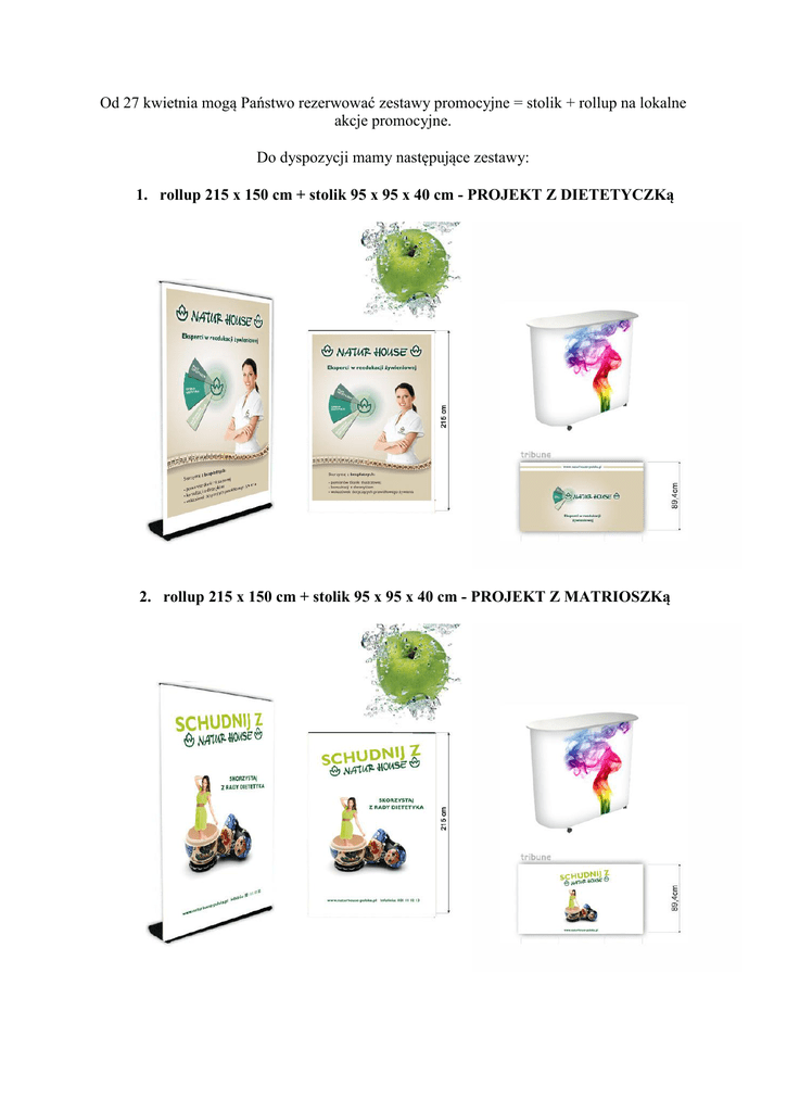 Od 27 kwietnia mogą Państwo rezerwować zestawy promocyjne = stolik + rollup na lokalne akcje promocyjne. Do dyspozycji mamy następujące zestawy: 1. rollup 215 x 150 cm + stolik 95 x 95 x 40 cm - PROJEKT Z DIETETYCZKą 2. rollup 215 x 150 cm + stolik 95 x 95 x 40 cm - PROJEKT Z MATRIOSZKą W sumie do dyspozycji oddajemy 8 zestawów (po 4 z każdego projektu). Zestawy będziemy mogli wysłać najwcześniej 5 maja. Poniżej zamieszczamy regulamin dotyczący wypożyczenia zestawów promocyjnych. Każde Centrum Dietetyczne Naturhouse wypożyczające zestaw jest zobowiązane zapoznać się z poniższym regulaminem. Regulamin wypożyczania zestawów promocyjnych (stolik + rollup) 1. Każde Centrum Dietetyczne Naturhouse ma prawo wypożyczyć z centrali Naturhouse z Łodzi zestaw promocyjny = rollup + stolik do wykorzystania podczas lokalnych akcji promocyjnych swojego punktu. 2. Wypożyczenie zestawu jest możliwe po jego uprzednim zarezerwowaniu (drogą mailową bądź telefoniczną poprzez magazyn Naturhouse). 3. Każdy sklep może wypożyczyć tylko 1 zestaw w tym samym czasie. 4. Wypożyczenie zestawu jest nieodpłatne. Płatny jest natomiast transport z centrali Naturhouse z Łodzi bądź z innego miejsca, w którym zestaw się znajduje bezpośrednio do centrum lub innego punktu wyznaczonego przez sklep wypożyczający zestaw i z powrotem. 5. Transport organizowany jest przez Centrum Dietetyczne Naturhouse wypożyczające zestaw promocyjny tzn. franczyzobiorca sam organizuje kuriera na swój koszt i przysyła go do centrali Naturhouse w Łodzi uprzedzając jednocześnie o tym pracowników magazynu Naturhouse. 6. Po zakończeniu lokalnej akcji promocyjnej centrum Dietetyczne Naturhouse powinno niezwłocznie odesłać stolik + rollup do centrali Naturhouse lub do innego centrum Naturhouse wskazanego przez centralę. 7. Franczyzobiorca lub osoba go reprezentująca może również odebrać i zwrócić zestaw osobiście lub zestaw może zostać dołączony do zamówienia na palecie, o czym franczyzobiorca musi poinformować pracowników magazynu Naturhouse. 8. W przypadku zniszczenia zestawu podczas użytkowania go przez sklep, franczyzobiorca zobowiązuje się naprawić szkodę i zwrócić zestaw do centrali Naturhouse w takim samym stanie technicznym i wizualnym w jakim go otrzymał.