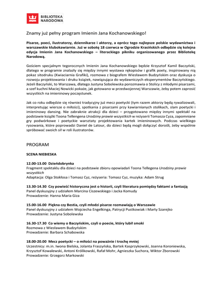 Znamy już pełny program Imienin Jana Kochanowskiego! Pisarze, poeci, ilustratorzy, dziennikarze i aktorzy, a oprócz tego najlepsze polskie wydawnictwa i warszawskie klubokawiarnie. Już w sobotę 18 czerwca w Ogrodzie Krasińskich odbędzie się kolejna edycja Imienin Jana Kochanowskiego – literackiego pikniku organizowanego przez Bibliotekę Narodową. Gościem specjalnym tegorocznych Imienin Jana Kochanowskiego będzie Krzysztof Kamil Baczyński, dlatego w programie znalazły się między innymi wystawa rękopisów i grafik poety, inspirowany nią pokaz sitodruku (Kwiaciarnia Grafiki), rozmowa z biografem Wiesławem Budzyńskim oraz dyskusja o rozwoju projektowania i druku książek, nawiązująca do wydawniczych eksperymentów Baczyńskiego. Jeżeli Baczyński, to Warszawa, dlatego Justyna Sobolewska porozmawia o Stolicy z młodymi pisarzami, a szef kuchni Maciej Nowicki pokaże, jak gotowano w przedwojennej Warszawie, żeby potem zaprosić wszystkich na imieninowy poczęstunek. Jak co roku odbędzie się również tradycyjny już mecz poetycki (tym razem aktorzy będą rywalizowali, interpretując wiersze o miłości), spotkania z pisarzami przy kawiarnianych stolikach, slam poetycki i imieninowy dansing. Nie zabraknie atrakcji dla dzieci – przygotowano między innymi spektakl na podstawie książki Toona Tellengena Urodziny prawie wszystkich w reżyserii Tomasza Cyza, zapomniane gry podwórkowe i poetyckie warsztaty projektowania kartek imieninowych. Podczas wielkiego rysowania, które poprowadzi Daniel de Latour, do dzieci będą mogli dołączyć dorośli, żeby wspólnie spróbować swoich sił w roli ilustratorów. PROGRAM SCENA NIEBIESKA 12.00-13.00 Dzieńdobrynka Fragment spektaklu dla dzieci na podstawie zbioru opowiadań Toona Tellegena Urodziny prawie wszystkich Adaptacja: Olga Stokłosa i Tomasz Cyz, reżyseria: Tomasz Cyz, muzyka: Adam Strug 13.30-14.30 Czy powieść historyczna jest o historii, czyli literatura pomiędzy faktami a fantazją Panel dyskusyjny z udziałem Marcina Ciszewskiego i Jacka Komudy Prowadzenie: Hanna Maria Giza 15.00-16.00 Piękna czy Bestia, czyli młodzi pisarze rozmawiają o Warszawie Panel dyskusyjny z udziałem Wojciecha Engelkinga, Patrycji Pustkowiak i Marty Szarejko Prowadzenie: Justyna Sobolewska 16.30-17.30 Co wiemy o Baczyńskim, czyli o poecie, który lubił smoki Rozmowa z Wiesławem Budzyńskim Prowadzenie: Barbara Schabowska 18.00-20.00 Mecz poetycki – o miłości na poważnie i trochę mniej Uczestnicy: m.in. Iwona Bielska, Jolanta Fraszyńska, Bartek Kasprzykowski, Joanna Koroniewska, Krzysztof Kowalewski, Antoni Królikowski, Rafał Mohr, Agnieszka Suchora, Wiktor Zborowski Prowadzenie: Grzegorz Markowski 20.00-21.00 Pieśń świętojańska o Sobótce Muzyka: Karolina „Resina” Rec, recytacja: Iwona Bielska 21.00 Dansing z BADBITCHES Grają: Małgorzata Halber i Anna Chojnacka SCENA ŻÓŁTA 11.30-13.00 Jak smakowała przedwojenna Warszawa, czyli wielki poczęstunek imieninowy Wykład, pokaz kulinarny i degustacja Prowadzenie: Maciej Nowicki 13.30-14.30 Czy wiersze o miłości to szczyt romantyzmu, czyli „Nowe wiersze sławnych poetów” w akcji Rozmowa z Grzegorzem Uzdańskim Prowadzenie: Grzegorz Markowski 15.00-16.00 Czy książkę wystarczy napisać, czyli o rozwoju projektowania i druku Panel dyskusyjny z udziałem Przemysława Dębowskiego, Andrzeja Palacza i Piotra Rypsona Prowadzenie: Magdalena Heliasz 16.30-18.00 Slam poetycki SCENA ZIELONA 11.00-20.00 Czytelnia z książkami Nagrody Literackiej m.st. Warszawy Klub z Kawą nad Książką 14.00-15.00 Spotkanie z Martą Guzowską 15.00-16.00 Spotkanie z Cezarym Harasimowiczem 17.00-19.00 „Poczytalni” na żywo Radiowy Klub Książkowy TOK FM m.in. wokół książki Pawła Piotra Reszki Diabeł i tabliczka czekolady SCENA DZIECIĘCA 12.00-14.00 Wielkie wspólne rysowanie – ilustratorstwo bez ograniczeń wiekowych Prowadzenie: Daniel de Latour 14.00-16.00 Fabryka kartek z życzeniami – imieninowy warsztat poetycko-ilustratorski 16.00-18.00 Sitodruk na żywo – Kwiaciarnia Grafiki ozdabia koszulki (warto zabrać ze sobą koszulkę w jasnym kolorze!) PAŁAC 11.00-21.00 Wystawa rękopisów i grafik Krzysztofa Kamila Baczyńskiego 19.00-20.00 Wieczorynka Spektakl dla dzieci na podstawie zbioru opowiadań Toona Tellegena Urodziny prawie wszystkich Adaptacja: Olga Stokłosa i Tomasz Cyz, reżyseria: Tomasz Cyz, muzyka: Adam Strug PONADTO W PROGRAMIE od 11.00 Kiermasz książek i indywidualne spotkania z autorami 12.00-19.00 Zapomniane gry podwórkowe – zabawa bez zabawek, ale z przyjaciółmi 13.00-16.30 Książka dla każdego, Kindle dla najlepszych – literacka gra terenowa z ACADEMICĄ Warszawa Czyta 12.00-19.00 Plebiscyt na książkę kolejnej edycji akcji Warszawa Czyta, literackie mapowanie Warszawy i rysowanki dla dzieci 16.00-17.00 Spotkanie z Magdaleną Kicińską Kordegarda – Galeria NCK 13.00-14.30 Bukklub – rozmowa wokół książki Janusza Rudnickiego Śmierć czeskiego psa 15.00-18.00 Wymienialnia Książek Więcej informacji: www.bn.org.pl/imieninyjana Projekt współfinansuje miasto stołeczne Warszawa. Patroni medialni: TVP Kultura, Dwójka - Program 2 Polskiego Radia, Trójka - Program 3 Polskiego Radia, Gazeta Wyborcza, Wyborcza.pl Warszawa, Co Jest Grane24, Aktivist, Książki. Magazyn do czytania, Lubimyczytać.pl, Xięgarnia.pl, Zwykłe Życie, NOTES.NA.6.TYGODNI Imieniny Jana Kochanowskiego sobota 18 czerwca, od 11.00 do ostatniego gościa Ogród Krasińskich, Warszawa --Kontakt dla mediów: Grzegorz Mazurowski 604 266 290, 22 608 28 49 [email protected]