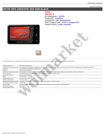 Informacje o produkcie Utworzono 03-03-2017 ODTW MP4 CREATIVE ZEN 8GB BLACK Cena : 482,85 zł ar ke t Nr katalogowy : 31916 Producent : Creative Dostępność : Na zamówienie Stan magazynowy : brak w magazynie Średnia ocena : brak recenzji Twoja karta kredytowa do multimediów.Twój ZEN -pełen rozrywki. ZEN to przenośny odtwarzacz multimedialny przypominający kartę kredytową. Blokada przycisków: Brak danych producenta m Dodatkowe funkcje odtwarzacza: Czas odtwarzania po pełnym naładowaniu: 25 godzin muzyki lub 5 godzin wideo, Czytnik kart SD (SD i SDHC) umożliwiający zwiększenie pojemności Dyktafon: tak, wbudowany mikrofon wysokiej jakości Equalizer: Brak danych producenta Format plików multimedialnych: Obsługa plików dźwiękowych AAC (.M4A) oraz MP3, WMA, WAVE i Audible, Obsługa plików wideo: WMV i DivX/XviD (320x240) Czas odtwarzania po pełnym naładowaniu: 25 godzin muzyki lub 5 godzin wideo Nagrywanie z radia: Brak danych producenta Radio: FM (87.5MHz – 107.5MHz) Sposób odtwarzania: wybrany utwór, wybrany folder Wymiary odtwarzacza: ol Max. czas pracy: 55 x 83 x 12mm Wyposażenie odtwarzacza MP3: słuchawki, przewód USB, Płyta CD-ROM z oprogramowaniem, Instrukcja obsługi Wyświetlanie tytułów / tekstu: tak ID3 TAG Zasilanie MP3: za pośrednictwem łącza USB po podłączeniu do odpowiedniego zasilacza lub portu USB komputerze Rodzaj zobowiązania: Gwarancja 12 m w Długość zobowiązania: Wygenerowano w programie www.oscGold.com