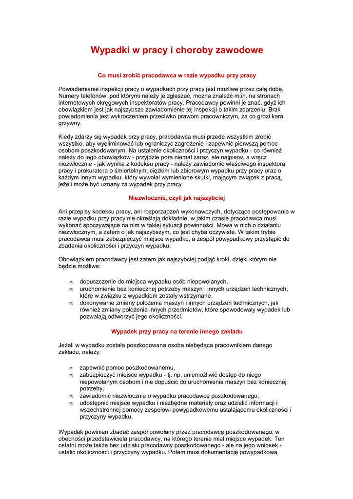 Wypadki w pracy i choroby zawodowe Co musi zrobić pracodawca w razie wypadku przy pracy Powiadamianie inspekcji pracy o wypadkach przy pracy jest możliwe przez całą dobę. Numery telefonów, pod którymi należy je zgłaszać, można znaleźć m.in. na stronach internetowych okręgowych inspektoratów pracy. Pracodawcy powinni je znać, gdyż ich obowiązkiem jest jak najszybsze zawiadomienie tej inspekcji o takim zdarzeniu. Brak powiadomienia jest wykroczeniem przeciwko prawom pracowniczym, za co grozi kara grzywny. Kiedy zdarzy się wypadek przy pracy, pracodawca musi przede wszystkim zrobić wszystko, aby wyeliminować lub ograniczyć zagrożenie i zapewnić pierwszą pomoc osobom poszkodowanym. Na ustalenie okoliczności i przyczyn wypadku - co również należy do jego obowiązków - przyjdzie pora niemal zaraz, ale najpierw, a wręcz niezwłocznie - jak wynika z kodeksu pracy - należy zawiadomić właściwego inspektora pracy i prokuratora o śmiertelnym, ciężkim lub zbiorowym wypadku przy pracy oraz o każdym innym wypadku, który wywołał wymienione skutki, mającym związek z pracą, jeżeli może być uznany za wypadek przy pracy. Niezwłocznie, czyli jak najszybciej Ani przepisy kodeksu pracy, ani rozporządzeń wykonawczych, dotyczące postępowania w razie wypadku przy pracy nie określają dokładnie, w jakim czasie pracodawca musi wykonać spoczywające na nim w takiej sytuacji powinności. Mowa w nich o działaniu niezwłocznym, a zatem o jak najszybszym, co jest chyba oczywiste. W takim trybie pracodawca musi zabezpieczyć miejsce wypadku, a zespół powypadkowy przystąpić do zbadania okoliczności i przyczyn wypadku. Obowiązkiem pracodawcy jest zatem jak najszybciej podjąć kroki, dzięki którym nie będzie możliwe: • • • dopuszczenie do miejsca wypadku osób niepowołanych, uruchomienie bez koniecznej potrzeby maszyn i innych urządzeń technicznych, które w związku z wypadkiem zostały wstrzymane, dokonywanie zmiany położenia maszyn i innych urządzeń technicznych, jak również zmiany położenia innych przedmiotów, które spowodowały wypadek lub pozwalają odtworzyć jego okoliczności. Wypadek przy pracy na terenie innego zakładu Jeżeli w wypadku została poszkodowana osoba niebędąca pracownikiem danego zakładu, należy: • • • • zapewnić pomoc poszkodowanemu, zabezpieczyć miejsce wypadku - tj. np. uniemożliwić dostęp do niego niepowołanym osobom i nie dopuścić do uruchomienia maszyn bez koniecznej potrzeby, zawiadomić niezwłocznie o wypadku pracodawcę poszkodowanego, udostępnić miejsce wypadku i niezbędne materiały oraz udzielić informacji i wszechstronnej pomocy zespołowi powypadkowemu ustalającemu okoliczności i przyczyny wypadku. Wypadek powinien zbadać zespół powołany przez pracodawcę poszkodowanego, w obecności przedstawiciela pracodawcy, na którego terenie miał miejsce wypadek. Ten ostatni może także bez udziału pracodawcy poszkodowanego - ale na jego wniosek ustalić okoliczności i przyczyny wypadku. Potem musi dokumentację powypadkową przekazać pracodawcy poszkodowanego. Uruchomienie maszyn i innych urządzeń technicznych albo dokonanie zmian w miejscu wypadku jest możliwe tylko za zgodą pracodawcy, który musi to uzgodnić z działającym w zakładzie pracy społecznym inspektorem pracy i po dokonaniu oględzin miejsca wypadku oraz po sporządzeniu, jeśli zachodzi taka potrzeba, szkicu lub fotografii miejsca wypadku. Jeżeli doszło jednak do wypadku śmiertelnego, ciężkiego lub zbiorowego, wówczas ponowne uruchomienie urządzeń czy wprowadzenie zmian w miejscu takiego zdarzenia wymaga uzgodnienia z inspektorem pracy i prokuratorem, a jeśli doszło do takich wypadków w zakładzie górniczym - również po konsultacji z organem państwowego nadzoru górniczego. Dokonywanie zmian w miejscu wypadku bez uzyskania zgody jest dopuszczalne tylko pod warunkiem, że tego wymaga konieczność ratowania osób lub mienia albo zapobieżenia grożącemu niebezpieczeństwu. Kto w zespole powypadkowym Wiele zależy od tego, jak groźny był wypadek. W przypadku wypadków śmiertelnych, ciężkich i zbiorowych, ich okoliczności i przyczyny musi ustalić zespół powypadkowy, w którego skład wchodzi pracownik kierujący komórką służby bezpieczeństwa i higieny pracy oraz zakładowy społeczny inspektor pracy. Inne wypadki powinien zbadać pracownik służby bezpieczeństwa i higieny pracy wraz z oddziałowym (wydziałowym) społecznym inspektorem pracy. Tam, gdzie nie ma społecznej inspekcji, w skład zespołu, zamiast społecznego inspektora, wchodzi przedstawiciel pracowników posiadający aktualne zaświadczenie o ukończeniu szkolenia w zakresie bhp. Natomiast w zakładzie, w którym nie trzeba tworzyć służby bhp (czyli w firmie zatrudniającej do 100 pracowników), zamiast pracownika tej służby do zespołu powypadkowego powinien wejść albo pracodawca, albo pracownik zatrudniony przy innej pracy, któremu pracodawca powierzył wykonywanie zadań służby bhp, bądź specjalista spoza zakładu pracy. WARTO WIEDZIEĆ Stwierdzenie, że wypadek nie jest wypadkiem przy pracy albo że zachodzą okoliczności, które mogą mieć wpływ na prawo pracownika do świadczeń przysługujących w związku z wypadkiem, musi być szczegółowo uzasadnione i poparte wskazaniem w protokole powypadkowym niezbędnych tego dowodów. Oględziny, przesłuchania Zespół powypadkowy musi przystąpić do ustalenia okoliczności i przyczyn wypadku niezwłocznie po otrzymaniu wiadomości o nim. Przede wszystkim musi on: • • • • • • dokonać oględzin miejsca wypadku, stanu technicznego maszyn i innych urządzeń technicznych, stanu urządzeń ochronnych oraz zbadać warunki wykonywania pracy i inne okoliczności, które mogły mieć wpływ na powstanie wypadku, sporządzić szkic lub wykonać fotografię miejsca wypadku, o ile to konieczne, przesłuchać poszkodowanego, jeśli stan jego 