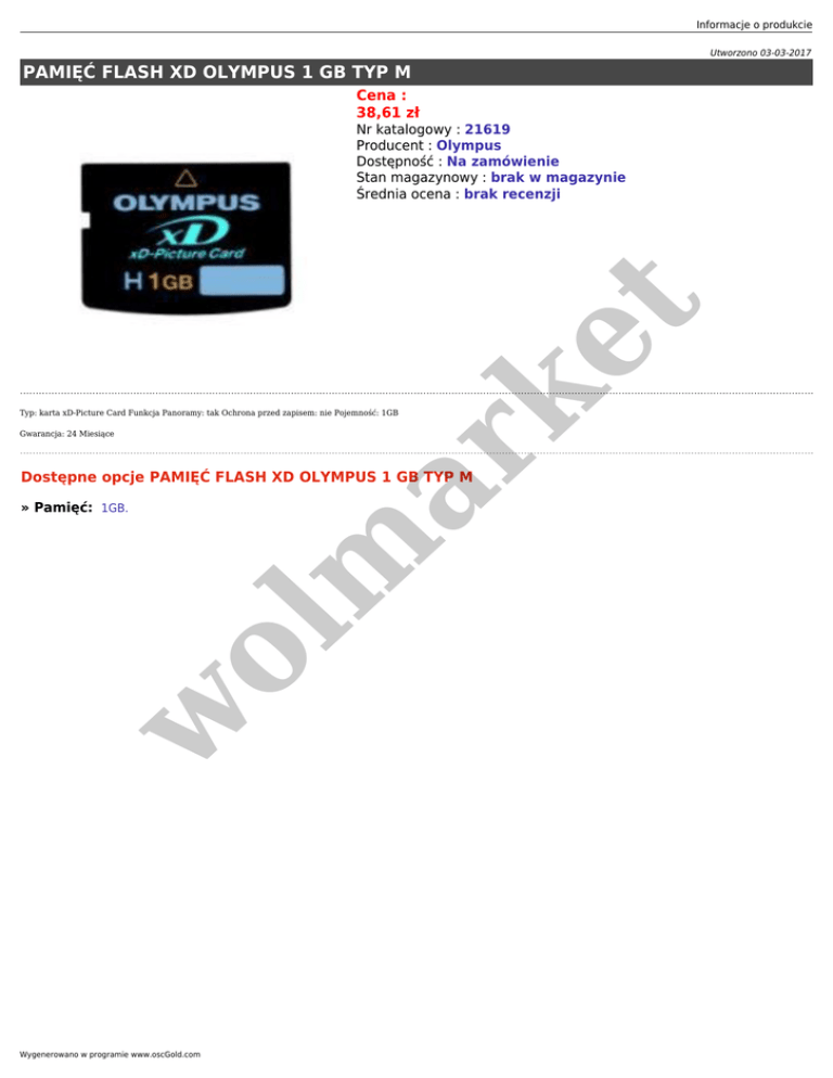 Informacje o produkcie Utworzono 03-03-2017 PAMIĘĆ FLASH XD OLYMPUS 1 GB TYP M Cena : 38,61 zł ar ke t Nr katalogowy : 21619 Producent : Olympus Dostępność : Na zamówienie Stan magazynowy : brak w magazynie Średnia ocena : brak recenzji Typ: karta xD-Picture Card Funkcja Panoramy: tak Ochrona przed zapisem: nie Pojemność: 1GB Gwarancja: 24 Miesiące Dostępne opcje PAMIĘĆ FLASH XD OLYMPUS 1 GB TYP M w ol m » Pamięć: 1GB. Wygenerowano w programie www.oscGold.com