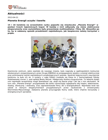 Aktualności 2013-04-21 Planeta Energii uczyła i bawiła 15 i 16 kwietnia na wrzesińskim rynku pojawiło się miasteczko „Planeta Energii” w postaci trzech tajemniczych kopuł. W każdej z nich odbywały się różne elektryczne eksperymenty oraz wyświetlane były prezentacje multimedialne i filmy 3D. Wszystko po to, by w zabawny sposób przedstawić najmłodszym, jak bezpieczne należy korzystać z prądu. Kosmiczne centrum, jakie zawitało do naszego miasta, było nagrodą w ogólnopolskim konkursie edukacyjnym zorganizowanym przez Grupę ENERGA za propagowanie wiedzy o energii elektrycznej oraz promowanie wśród najmłodszych proekologicznych postaw. Spośród tegorocznych zwycięzców konkursu (a było ich ok. 4 tysięcy z całej Polski) znalazła się klasa Ie z Samorządowej Szkoły Podstawowej numer 1, pod opieką Beaty Mocek i Małgorzaty Kostery-Augustyniak. To właśnie dzięki nim najmłodsi wrześnianie mogli dowiedzieć się, skąd się bierze prąd i jak się z nim obchodzić. W tym celu „Planeta Energii” przygotowała dla dzieci samochody napędzane siłą mięśni, elektrownie: wodną, słoneczną i wiatrową, oraz zaprezentowała filmy 3D o Energoludkach. Najmłodsi brali też udział w różnych eksperymentach przygotowanych przez naukowców z Uniwersytetu Warmińsko-Mazurskiego. Zabawna planeta przyciągnęła tłumy osób, które chętnie korzystały z energetycznych sprzętów.
