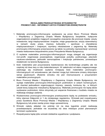 Załącznik Nr 1 do zarządzenia Nr 256/2013 Prezydenta Miasta Bydgoszczy z dnia 10.04.2013 r. REGULAMIN PRZEKAZYWANIA WYDAWNICTW PROMOCYJNO - INFORMACYJNYCH PODMIOTOM ZEWNĘTRZNYM 1. Materiały promocyjno-informacyjne wydawane są przez Biuro Promocji Miasta i Współpracy z Zagranicą Urzędu Miasta Bydgoszczy bezpłatnie, wyłącznie organizatorom projektów mających szczególne znaczenie dla promocji miasta: wizyty inwestorów, targi międzynarodowe i krajowe, misje gospodarcze, wizyty dziennikarzy w ramach study press, imprezy kulturalne i sportowe o charakterze międzynarodowym i krajowym, wymiany młodzieżowe z zagranicą itp. Materiały promocyjno-informacyjne przeznaczone są także na potrzeby reprezentacji i promocji miasta realizowane bezpośrednio przez Prezydenta Miasta Bydgoszczy. 2. O wydanie materiałów promocyjno-informacyjnych mogą ubiegać się organizacje non-profit, organizacje pozarządowe, organizacje pożytku publicznego, placówki naukowo-oświatowe, jednostki samorządowe i instytucje państwowe, prowadzące działalność na terenie Bydgoszczy. 3. Ilość materiałów jest przyznawana każdorazowo dla konkretnego projektu ale nie częściej niż dwa razy w roku kalendarzowym. W zależności od stanu magazynowego zastrzega się możliwość wydania mniejszej ilość materiałów promocyjnoinformacyjnych niż wnioskowana, jak również mogą być dokonane zmiany dotyczące wersji językowych. Złożenie wniosku nie jest równoznaczne z przyznaniem materiałów promocyjnych. 4. Biuro Promocji Miasta i Współpracy z Zagranicą Urzędu Miasta Bydgoszczy nie wydaje materiałów promocyjno-informacyjnych podmiotom w celach komercyjnych, jak również jednostkom organizującym imprezy, zawody, konkursy itp., w których udział biorą wyłącznie mieszkańcy Bydgoszczy. Materiały promocyjne nie będą także wydawane podmiotom, które otrzymały już wsparcie finansowe z budżetu miasta na realizację swojego zadania. 5. Wydawnictwa promocyjno-informacyjne przekazywane będą na podstawie wniosku, który stanowi Załącznik nr 1 do niniejszego regulaminu. Wniosek jest rozpatrywany przez Dyrektora Biura Promocji Miasta i Współpracy z Zagranicą Urzędu Miasta Bydgoszczy lub przez osobę przez niego upoważnioną. 6. Wnioski należy składać nie później niż na dwa tygodnie przed realizacją przedsięwzięcia, jednakże nie wcześniej niż dwa miesiące przed planowanym terminem wydarzenia. 7. Rozpatrywane będą tylko wnioski dokładnie wypełnione i podpisane. 8. Formularz wniosku jest do pobrania na oficjalnej stronie Miasta Bydgoszczy http://www.bydgoszcz.pl/promocja/materialy_promocyjne/ lub w sekretariacie Biura Promocji Miasta i Współpracy z Zagranicą Urzędu Miasta Bydgoszczy. 9. Wnioski można składać osobiście w sekretariacie Biura Promocji Miasta i Współpracy z Zagranicą, wysłać faksem lub przesłać na skrzynkę e-mailową: [email protected]. 10. Wnioski będą rozpatrywane w terminie 3 dni od daty otrzymania. 11. Po pozytywnym rozpatrzeniu wniosku, nastąpi wydanie materiałów promocyjnych. 12. O decyzji przyznania lub też nie przyznania materiałów wnioskujący będą powiadamiani telefonicznie lub za pomocą poczty elektronicznej. Wszelkie informacje będzie można także uzyskać w sekretariacie Biura Promocji Miasta i Współpracy z Zagranicą Urzędu Miasta Bydgoszczy pod numerem tel. 52 58-58-446. 13. Materiały promocyjne wydawane będą w Biurze Promocji Miasta i Współpracy z Zagranicą Urzędu Miasta Bydgoszczy – Ratusz, ul. Jezuicka 1 codziennie w godzinach: Poniedziałek, środa i czwartek 10:00 – 16:00 Wtorek 10:00-18:00 Piątek 10:00-14:00. 14. Każdy wnioskujący zobowiązany jest do złożenia sprawozdania, które stanowi Załącznik nr 2 do niniejszego regulaminu, w formie pisemnej z przeprowadzonego działania promocyjnego z wykorzystaniem przykazanych wydawnictw promocyjnoinformacyjnych do 14 dni po zakończeniu przedsięwzięcia. Nie wywiązanie się z niniejszego zobowiązania będzie w przyszłości miało wpływ na rozpatrywanie kolejnych wniosków złożonych przez wnioskujących.