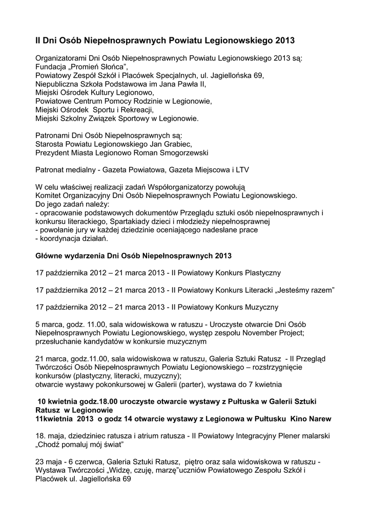 II Dni Osób Niepełnosprawnych Powiatu Legionowskiego 2013 Organizatorami Dni Osób Niepełnosprawnych Powiatu Legionowskiego 2013 są: Fundacja „Promień Słońca”, Powiatowy Zespół Szkół i Placówek Specjalnych, ul. Jagiellońska 69, Niepubliczna Szkoła Podstawowa im Jana Pawła II, Miejski Ośrodek Kultury Legionowo, Powiatowe Centrum Pomocy Rodzinie w Legionowie, Miejski Ośrodek Sportu i Rekreacji, Miejski Szkolny Związek Sportowy w Legionowie. Patronami Dni Osób Niepełnosprawnych są: Starosta Powiatu Legionowskiego Jan Grabiec, Prezydent Miasta Legionowo Roman Smogorzewski Patronat medialny - Gazeta Powiatowa, Gazeta Miejscowa i LTV W celu właściwej realizacji zadań Współorganizatorzy powołują Komitet Organizacyjny Dni Osób Niepełnosprawnych Powiatu Legionowskiego. Do jego zadań należy: - opracowanie podstawowych dokumentów Przeglądu sztuki osób niepełnosprawnych i konkursu literackiego, Spartakiady dzieci i młodzieży niepełnosprawnej - powołanie jury w każdej dziedzinie oceniającego nadesłane prace - koordynacja działań. Główne wydarzenia Dni Osób Niepełnosprawnych 2013 17 października 2012 – 21 marca 2013 - II Powiatowy Konkurs Plastyczny 17 października 2012 – 21 marca 2013 - II Powiatowy Konkurs Literacki „Jesteśmy razem” 17 października 2012 – 21 marca 2013 - II Powiatowy Konkurs Muzyczny 5 marca, godz. 11.00, sala widowiskowa w ratuszu - Uroczyste otwarcie Dni Osób Niepełnosprawnych Powiatu Legionowskiego, występ zespołu November Project; przesłuchanie kandydatów w konkursie muzycznym 21 marca, godz.11.00, sala widowiskowa w ratuszu, Galeria Sztuki Ratusz - II Przegląd Twórczości Osób Niepełnosprawnych Powiatu Legionowskiego – rozstrzygnięcie konkursów (plastyczny, literacki, muzyczny); otwarcie wystawy pokonkursowej w Galerii (parter), wystawa do 7 kwietnia 10 kwietnia godz.18.00 uroczyste otwarcie wystawy z Pułtuska w Galerii Sztuki Ratusz w Legionowie 11kwietnia 2013 o godz 14 otwarcie wystawy z Legionowa w Pułtusku Kino Narew 18. maja, dziedziniec ratusza i atrium ratusza - II Powiatowy Integracyjny Plener malarski „Chodź pomaluj mój świat” 23 maja - 6 czerwca, Galeria Sztuki Ratusz, piętro oraz sala widowiskowa w ratuszu Wystawa Twórczości „Widzę, czuję, marzę”uczniów Powiatowego Zespołu Szkół i Placówek ul. Jagiellońska 69 24 maja - Legionowska Paraolimpiada dzieci i młodzieży – realizuje MOSiR oraz wystawa poplenerowa w MOSIR. Kalendarz Dni Osób Niepełnosprawnych Powiatu Legionowskiego 2013 Data zadanie adres odpowiedzialny 17.10.2012 Ogłoszenie konkursów literackiego, plastycznego i muzycznego, publikacja regulaminów MOK 05-120 Legionowo ul. Norwida 10 Przegląd Sztuki-MOK konkurs muzycznyNiepubliczna Szkoła Podstawowa im. JPIIFundacja „Promień Słońca- konkurs literacki 17. 10 2012 - 20.02.2013 Przyjmowanie prac konkursowych, Przyjmowanie zgłoszeń na konkursy MOK Szkoła im. Jana Pawła II ul. PIŁSUDSKIEGO 47 05-120 Legionowo telefon: 22-774-26-62 fundacja „Promień Słońca Legionowo Ul Jagiellońska 69 MOK Niepubliczna Szkoła Podstawowa im. JPII fundacja „Promień Słońca” 5.03. 2013 Uroczyste otwarcie DON Ratusz, sala widowiskowa MOK, 2013, eliminacje do konkursu godz.11 Niepubliczna Szkoła wokalno- muzycznego Podstawowa im. JPII 21.03 2013 godz.11.00 Uroczyste otwarcie Przeglądu Ratusz, sala widowiskowa MOK Fundacja „Promień Słońca”- kiermasz wielkanocny Niepubliczna Szkoła Podstawowa im. JPII 8.04.2013 –wymiana ekspozycji 10.04-18.04.2013 wystawy Wystawa z Pułtuska w Legionowie, Wystawa z Legionowa w Pułtusku Galeria Sztuki Ratusz 10 .04.2013 wernisaż wystawy z Pułtuska godz.18 Uroczyste otwarcie wystawy miasto Legionowo i powiatu Legionowskiego DON 2013 w Pułtusku 11.04.2013 godz.14.00 kino Narew 18.05.2013 II Integracyjny plener Dziedziniec główny malarski „Chodź pomaluj mój Ratusza świat” rozpoczęcie godz.11 MOK w Legionowie PCPR Pułtusk MOK (organizacja) PCPR (materiały) 23.05.2013 – - 6.06.2013 Otwarcie – godz. 11.00 Wystawa Prac Uczniów Powiatowego Zespołu Szkół i Placówek Specjalnych ul Jagiellońska 69 Legionowo „”Widzę,czuje,marzę”” Galeria Sztuki Ratusz/piętro// i sala widowiskowa w ratuszu Powiatowy Zespół Szkół i Placówek Specjalnych Fundacja „Promień Słońca” 24.05.2013 Uroczyste rozpoczęcie Paraolimpiady godz.10.0 Legionowska Paraolimpiada dzieci i młodzieży Wystawa poplenerowa z II Pleneru Integracyjnego Arena Legionowo MOSIR MOSIR,Powiatowy Zespól Szkół i Placówek Specjalnych w Legionowie, Miejski Szkolny Związek Sportowy w Legionowie.