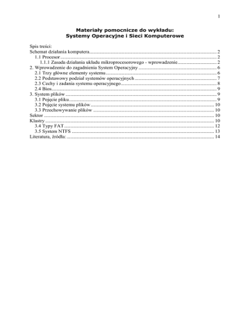 1 Materiały pomocnicze do wykładu: Systemy Operacyjne i Sieci Komputerowe Spis treści: Schemat działania komputera..................................................................................................... 2 1.1 Procesor ............................................................................................................................ 2 1.1.1 Zasada działania układu mikroprocesorowego - wprowadzenie............................... 2 2. Wprowadzenie do zagadnienia System Operacyjny .............................................................. 6 2.1 Trzy główne elementy systemu........................................................................................ 6 2.2 Podstawowy podział systemów operacyjnych ................................................................. 7 2.3 Cechy i zadania systemu operacyjnego............................................................................ 8 2.4 Bios................................................................................................................................... 9 3. System plików ........................................................................................................................ 9 3.1 Pojęcie pliku ..................................................................................................................... 9 3.2 Pojęcie systemu plików.................................................................................................. 10 3.3 Przechowywanie plików ................................................................................................ 10 Sektor ....................................................................................................................................... 10 Klastry ...................................................................................................................................... 10 3.4 Typy FAT ....................................................................................................................... 12 3.5 System NTFS ................................................................................................................. 13 Literatura, źródła: ..................................................................................................................... 14 2 Schemat działania komputera Komputer jest to uniwersalny system cyfrowy zdolny do wykonywania pewnego zbioru rozkazów (róŜnorodnych operacji elementarnych), w którym uŜytkownik moŜe określić sekwencję wykonywanych rozkazów koniecznych do realizacji postanowionego zadania. Głównymi częściami składowymi komputera są: • procesor, • pamięć operacyjna, w której jest zapisany program określający sekwencję wykonywanych operacji • dane do przetworzenia • oraz układy wejścia wyjścia, do których są przyłączone urządzenia zewnętrzne umoŜliwiające kontakt komputera z otoczeniem i uŜytkownikiem. Istotną cechą komputera, odróŜniającą go od innych systemów cyfrowych, jest moŜliwość zupełnej zmiany realizowanych przez niego funkcji jedynie przez zmianę programu w jego pamięci. Gdy myślimy o komputerze, zwykle wyobraŜamy sobie duŜą szarą skrzynkę, wypełnioną elementami elektronicznymi. Na skrzynce znajduje się najczęściej monitor, a gdzieś obok drukarka i paczka papieru. Zanim pojawiły się pierwsze komputery, człowiek wymyślał wiele róŜnych mechanicznych urządzeń, które miały mu pomagać w liczeniu. Pierwsze komputery zbudowano z lamp elektronowych, jakie niektórzy pamiętają jeszcze ze starych odbiorników telewizyjnych. Lampy te miały jednak bardzo waŜną wadę: wymagały do pracy wysokiego napięcia, a tym samym powodowały duŜe zuŜycie energii elektrycznej. Poza tym nawet najmniejsze z nich rozmiarami znacznie przewyŜszały nowoczesne układy elektroniczne. Natomiast pierwsze komputery osobiste (PC - personal computer) zostały opracowane przez IBM. PoniewaŜ na rynku pojawiło się coraz więcej produktów, zaczęto pisać programy dla tego typu komputerów. Producenci sprzętu odpowiedzieli na to kolejną falą unowocześnionych komputerów typu IBM PC. Proces ten rozwijał się na zasadzie lawiny: komputery, nowe komponenty i oprogramowanie są obecnie tworzone przez setki najróŜniejszych producentów. Tym sposobem PC stał się najbardziej rozpowszechnionym typem komputera na świecie. 1.1 Procesor PROCESOR stanowi główny element komputera, poniewaŜ jest odpowiedzialny za przetwarzanie informacji. Składa się on z układów sterujących, arytmometru (ALU – jednostki arytmetyczno-logicznej) oraz rejestrów. Układy sterujące odpowiadają za: dostarczenie arytmometrowi danych do obliczeń z pamięci operacyjnej, przekazywanie wyników obliczeń z powrotem do pamięci oraz właściwą kolejność przetwarzania. W arytmometrze odbywają się wszystkie obliczenia realizowane przez komputer. W rejestrach procesora przechowuje się adresy wybranych miejsc pamięci operacyjnej oraz dane i wyniki obliczeń. W wyróŜnionym rejestrze nazywanym licznikiem rozkazów jest umieszczany adres miejsca w pamięci wewnętrznej zawierającego bieŜący rozkaz dla procesora. Praca procesora odbywa się w tzw. cyklach rozkazowych. 1.1.1 Zasada działania układu mikroprocesorowego - wprowadzenie Procesor składa się z kilku elementów, do najwaŜniejszych naleŜą: 3 - jednostka arytmetyczno-logiczna, w skrócie arytmometr (z ang. ALU: Arithmetic Logic Unit) - wykonuje proste działania matematyczne typu dodawanie lub odejmowanie liczb całkowitych, oraz porównuje wartości prostych typów danych; - układ sterowania zapewnia współdziałanie wszystkich bloków komputera, jego zadaniem jest wykonywanie kolejnych instrukcji programu i sterowanie przepływem danych. - rejestry - są szybkimi pamięciami procesora i słuŜą do przechowywania danych potrzebnych procesorowi na czas wykonywania działań arytmetycznych lub logicznych przez ALU. Proceso