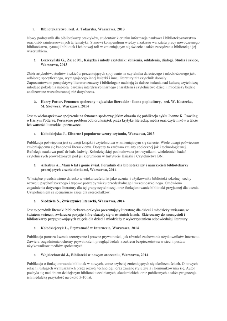 1. Bibliotekarstwo, red. A. Tokarska, Warszawa, 2013 Nowy podręcznik dla bibliotekarzy praktyków, studentów kierunku informacja naukowa i bibliotekoznawstwo oraz osób zainteresowanych tą tematyką. Stanowi kompendium wiedzy z zakresu warsztatu pracy nowoczesnego bibliotekarza, sytuacji bibliotek i ich nowej roli w zmieniającym się świecie a także zarządzania biblioteką i jej wizerunkiem. 2. Leszczyński G., Zając M., Książka i młody czytelnik: zbliżenia, oddalenia, dialogi. Studia i szkice, Warszawa, 2013 Zbiór artykułów, studiów i szkiców prezentujących spojrzenie na czytelnika dziecięcego i młodzieżowego jako odbiorcę specyficznego, wymagającego innej książki i innej literatury niż czytelnik dorosły. Zaprezentowano perspektywę literaturoznawcy i bibliologa z nadzieją że dalsze badania nad kulturą czytelniczą młodego pokolenia nabiorą bardziej interdyscyplinarnego charakteru i czytelnictwo dzieci i młodzieży będzie analizowane wszechstronnej niż dotychczas. 3. Harry Potter. Fenomen społeczny - zjawisko literackie - ikona popkultury, red. W. Kostecka, M. Skowera, Warszawa, 2014 Jest to wieloaspektowe spojrzenie na fenomen społeczny jakim okazała się publikacja cyklu Joanne K. Rowling o Harrym Potterze. Poruszono problem odbioru książek przez krytykę literacką, media oraz czytelników a także ich wartości literackie i poznawcze. 4. Kołodziejska J., Elitarne i popularne wzory czytania, Warszawa, 2013 Publikacja poświęcona jest sytuacji książki i czytelnictwa w zmieniającym się świecie. Wiele uwagi poświęcono zmieniającemu się kanonowi literackiemu. Dotyczy to zarówno zmiany społecznej jak i technologicznej. Refleksja naukowa prof. dr hab. Jadwigi Kołodziejskiej podbudowana jest wynikami wieloletnich badań czytelniczych prowadzonych pod jej kierunkiem w Instytucie Książki i Czytelnictwa BN. 5. Arkabus A., Mam 6 lat i gonię świat. Poradnik dla bibliotekarzy i nauczycieli bibliotekarzy pracujących z sześciolatkami, Warszawa, 2014 W książce przedstawiono dziecko w wieku sześciu lat jako ucznia i użytkownika biblioteki szkolnej, cechy rozwoju psychofizycznego i typowe potrzeby wieku przedszkolnego i wczesnoszkolnego. Omówiono zagadnienia dotyczące literatury dla tej grupy czytelniczej, oraz funkcjonowanie biblioteki przyjaznej dla ucznia. Uzupełnieniem są scenariusze zajęć dla sześciolatków. 6. Niedziela S., Zwierzyniec literacki, Warszawa, 2014 Jest to poradnik literacki bibliotekarza-praktyka prezentujący literaturę dla dzieci i młodzieży związaną ze światem zwierząt, zwłaszcza pozycje które ukazały się w ostatnich latach. Skierowany do nauczycieli i bibliotekarzy przygotowujących zajęcia dla dzieci i młodzieży z wykorzystaniem odpowiedniej literatury. 7. Kołodziejczyk Ł., Prywatność w Internecie, Warszawa, 2014 Publikacja porusza kwestie teoretyczne i prawne prywatności, jak również zachowania użytkowników Internetu. Zawiera zagadnienia ochrony prywatności i przegląd badań z zakresu bezpieczeństwa w sieci i postaw użytkowników mediów społecznych. 8. Wojciechowski J., Biblioteki w nowym otoczeniu, Warszawa, 2014 Publikacja o funkcjonowaniu bibliotek w nowych, coraz szybciej zmieniających się okolicznościach. O nowych rolach i usługach wymuszanych przez rozwój technologii oraz zmianę stylu życia i komunikowania się. Autor pochyla się nad dniem dzisiejszym bibliotek uczelnianych, akademickich oraz publicznych a także prognozuje ich niedaleką przyszłość na około 5-10 lat.