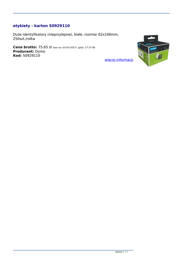 etykiety - karton S0929110 Duże identyfikatory (nieprzylepne), białe, rozmiar 62x106mm, 250szt./rolka Cena brutto: 75.65 zł Producent: Dymo Kod: S0929110 stan na: 03-03-2017r. godz. 17:27:40 więcej informacji strona 1 / 1 Powered by TCPDF (www.tcpdf.org)
