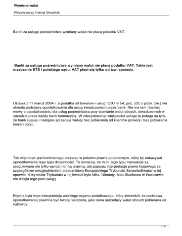 Wymiana walut Wpisany przez Andrzej Okrasiński Banki za usługę pośrednictwa wymiany walut nie płacą podatku VAT. Banki za usługę pośrednictwa wymiany walut nie płacą podatku VAT. Takie jest orzeczenie ETS i polskiego sądu. VAT płaci się tylko od tzw. spreadu. Ustawa z 11 marca 2004 r. o podatku od towarów i usług (DzU nr 54, poz. 535 z późn. zm.) nie określa podstawy opodatkowania dla usług świadczonych przez bank. Nie ma tam również mowy o opodatkowaniu dla usług pośrednictwa przy wymianie walut obcych, świadczonych w zasadzie przez każdy bank komercyjny. W zdecydowanej większości usługa ta polega na tym, że bank kupuje i następie sprzedaje waluty bez pobierania od klientów prowizji i bez pobierania innych opłat. Tak więc brak jest konkretnego przepisu w polskim prawie podatkowym, który by nakazywał opodatkowanie tego typu działalności. To oznacza, że m.in. tego typu transakcje są uregulowane nie tylko wprost normą prawną, ale poprzez interpretację prawa krajowego ze szczególnym uwzględnieniem orzecznictwa Europejskiego Trybunału Sprawiedliwości w tej sprawie. A wyroków Trybunału w tej kwestii było kilka. Niestety, Izba Skarbowa w Warszawie nie wzięła tego pod uwagę. Błędna była więc interpretacja polskiego organu podatkowego, który stwierdził, że podstawą opodatkowania powinna być kwota naliczona, jako cena sprzedaży walut obcych pobierana od nabywcy. 1/5 Wymiana walut Wpisany przez Andrzej Okrasiński Zgodnie z prawem, podstawą opodatkowania przy usługach pośrednictwa wymiany walut może być ogólny dodatni wynik banku, tzw. spread. Jest to różnica, jaka powstaje pomiędzy kursem kupna a sprzedaży zrealizowana w konkretnym czasie, np. miesiąca. Tak m.in. stwierdził warszawski Wojewódzki Sąd Administracyjny w orzeczeniu z 24 czerwca 2008 r. (sygn. III SA/Wa 480 - 481/08) posiłkując się stosownym orzecznictwem ETS. Bankowe pośrednictwo Sprawa rozpatrywana przez WSA w Warszawie dotyczyła banku komercyjnego, który świadczył m.in. usługi w zakresie wymiany walut dla osób fizycznych i prawnych. Tego typu czynność finansowa polega na pośrednictwie pomiędzy sprzedającym i kupującym oraz na przechowywaniu walut, bez pobierania prowizji albo innych jakichkolwiek opłat. Z logicznego punktu widzenia nie było co opodatkować według aktualnej Ustawy o podatku VAT. Jedyne wynagrodzenie banku w tego typu transakcjach finansowych to spread. W myśl polskiej Ustawy o podatku VAT, tego typu transakcje są zwolnione z podatku oprócz wspomnianego spreadu. W świetle przepisów podatkowych, księgowi banku trudzili się, jak w zeznaniu VAT-7 ująć tego 2/5 Wymiana walut Wpisany przez Andrzej Okrasiński typu operacje finansowe. By rozwikłać nieścisłości, bank złożył do dyrektora Izby Skarbowej w Warszawie prośbę o indywidualną interpretację przepisów prawa podatkowego w imieniu ministra finansów. We wniosku przedstawiciele banku określili swoje stanowisko, że: podstawą opodatkowania jest w tych przypadkach ogólny dodatni wynik transakcji wymiany walut, czyli spread. Bankowcy swoją argumentację poparli stosownym orzecznictwem ETS. W odpowiedzi na wniosek dyrektor IS wydając indywidualną interpretację uznał stanowisko banku za niezgodne z prawem podatkowym, za nieprawidłowe. Według dyrektora IS, podstawą opodatkowania jest całkowita cena sprzedaży waluty pobierana od kupującego. Odpowiedź można było tak zinterpretować, że transakcja nabycia walut przez sam bank nie ma w zasadzie żadnego znaczenia dla ustalenia podstawy do opodatkowania. Według Ustawy o podatku VAT, podstawą opodatkowania jest sam obrót, zdefiniowany jako suma należna z tytułu sprzedaży, ale pomniejszona oczywiście o kwotę podatku należnego. A następnie kwota należna z tytułu sprzedaży to całość świadczenia należnego od kupującego waluty. W uzasadnieniu interpretacji dyrektor IS jakby nie zauważył, że w tej sprawie istnieje orzecznictwo ETS, które wyraźnie opowiada się za stanowiskiem banku. Orzeczenie ETS było przesłane wraz z wnioskiem o interpretację. Skarga do WSA 3/5 Wymiana walut Wpisany przez Andrzej Okrasiński Bank nie uznał interpretacji dyrektora IS. Wystąpił ze stosowną skargą do warszawskiego WSA. Spółka zarzuciła fiskusowi naruszenie prawa podatkowego, w szczególności art. 29 Ustawy o podatku VAT oraz nieuwzględnienie w interpretacji w ogóle orzecznictwa ETS. Wniosła więc o uchylenie błędnej interpretacji w całości. Argumentacja ponowna została bardziej rozbudowana. W nowej argumentacji podkreślono m.in., że nie można utożsamiać przypadków, gdy bank prowadzi statutową działalność samodzielnie z sytuacją, gdy działa jak np. pośrednik walutowy. Obie sytuacje są odmienne i podlegają różnym formom opodatkowania. Wytknięto IS, że dokonała interpretacji pośrednictwa obrotu walutowego jako zwykłą dostawę towaru w rozumieniu ustawy VAT. Przedstawiciele banku podkreślili, że w usługach pośrednictwa wymiany walut przedmiotem usługi jest samo pośrednictwo, a nie waluta. Zdaniem strony skarżącej otrzymywane od kupujących kwoty nie są wynagrodzeniem dla banku. Wynagrodzenie dla banku to dodatni wynik operacji finansowych, jaki powstaje z różnicy pomiędzy ceną sprzedaży, a wartością kupna walut. Stanowisko takie zostało wsparte orzeczeniem ETS. Wynika z tego, że kwoty przekazywane przez kontrahenta podczas transakcji wymiany walut nie mogą być traktowane jako wynagrodzenie banku. Przytoczono także dwa orzeczenia ETS w bardzo podobnych sprawach (C-38/93 oraz C-172/06). Stanowią one, że w sytuacji operacji wymiany walut i gdy bank nie pobiera podczas świadczenia tej usługi opłat, podstawą opodatkowania jest tylko i wyłącznie ogólny dodatni wynik transakcji banku w konkretnym okresie. Spółka podkreśliła, że stan faktyczny jest taki sam, jak sprawy rozpatrywane wcześniej przez ETS. Dlatego interpretacja IS jest