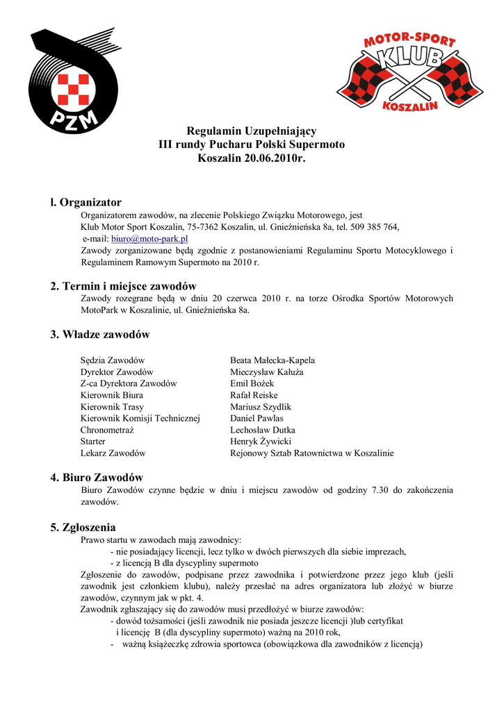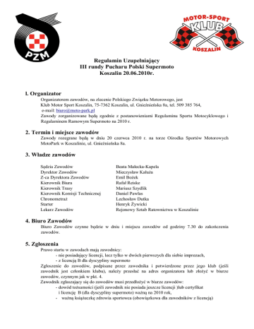 Regulamin Uzupełniający III rundy Pucharu Polski Supermoto Koszalin 20.06.2010r. l. Organizator Organizatorem zawodów, na zlecenie Polskiego Związku Motorowego, jest Klub Motor Sport Koszalin, 75-7362 Koszalin, ul. Gnieźnieńska 8a, tel. 509 385 764, e-mail: [email protected] Zawody zorganizowane będą zgodnie z postanowieniami Regulaminu Sportu Motocyklowego i Regulaminem Ramowym Supermoto na 2010 r. 2. Termin i miejsce zawodów Zawody rozegrane będą w dniu 20 czerwca 2010 r. na torze Ośrodka Sportów Motorowych MotoPark w Koszalinie, ul. Gnieźnieńska 8a. 3. Władze zawodów Sędzia Zawodów Dyrektor Zawodów Z-ca Dyrektora Zawodów Kierownik Biura Kierownik Trasy Kierownik Komisji Technicznej Chronometraż Starter Lekarz Zawodów Beata Małecka-Kapela Mieczysław Kałuża Emil Bożek Rafał Reiske Mariusz Szydlik Daniel Pawlas Lechosław Dutka Henryk Żywicki Rejonowy Sztab Ratownictwa w Koszalinie 4. Biuro Zawodów Biuro Zawodów czynne będzie w dniu i miejscu zawodów od godziny 7.30 do zakończenia zawodów. 5. Zgłoszenia Prawo startu w zawodach mają zawodnicy: - nie posiadający licencji, lecz tylko w dwóch pierwszych dla siebie imprezach, - z licencją B dla dyscypliny supermoto Zgłoszenie do zawodów, podpisane przez zawodnika i potwierdzone przez jego klub (jeśli zawodnik jest członkiem klubu), należy przesłać na adres organizatora lub złożyć w biurze zawodów, czynnym jak w pkt. 4. Zawodnik zgłaszający się do zawodów musi przedłożyć w biurze zawodów: - dowód tożsamości (jeśli zawodnik nie posiada jeszcze licencji )lub certyfikat i licencję B (dla dyscypliny supermoto) ważną na 2010 rok, - ważną książeczkę zdrowia sportowca (obowiązkowa dla zawodników z licencją) lub zdolność do udziału w zawodach potwierdzoną przez lekarza medycyny sportowej, - wypełnioną i podpisaną kartę zgłoszenia, - dowód wpłaty wpisowego. Osoby niepełnoletnie, nie posiadające licencji, dostarczyć muszą pisemną zgodę rodziców lub opiekunów prawnych na udział w zawodach. Dopuszcza się udział zawodników zagranicznych w zawodach. Od zawodników nie jest wymagane posiadanie pozwolenia na prowadzenie pojazdów mechanicznych. Wpisowe do zawodów wynosi: - dla każdej klasy 170 zł - za start w drugiej klasie 90 zł Dla zawodników polskich z licencją, nie będących członkami PZM, wpisowe będzie podwyższone o 50%. 6. Odbiór techniczny Odbiór techniczny obejmuje sprawdzenie zgodności pojazdu i wyposażenia zawodnika z wymogami RSM. Na badanie techniczne zawodnik zobowiązany jest stawić się z atestowanym kaskiem. Pojazdy i kaski, które przejdą pozytywnie badanie techniczne, powinny być oznakowane. Zawodnicy muszą posiadać odpowiednie wyposażenie indywidualne, tj. kask motocyklowy, rękawice, buty z wysoką cholewką oraz kombinezon zgodny z RSM. Każdy pojazd musi posiadać trzy numery startowe - jeden na przedzie i dwa po obu bokach, w tylnej części pojazdu. Numery startowe nadaje organizator (wg kolejności zgłoszeń) i zapewnia możliwość ich nabycia. Numer raz nadany obowiązuje zawodnika do końca sezonu. Kolory tła i cyfr oraz numery startowe - wg Regulaminu Ramowego na 2010 r. 7. Treningi Dla każdej klasy przeprowadzone będą dwa 15-minutowe treningi z pomiarem czasu. Warunkiem dopuszczenia do zawodów jest przejechanie w obu treningach łącznie minimum 5 okrążeń trasy. Zawodnik startujący w dwóch klasach musi przejechać dodatkowo w drugiej klasie minimum 3 okrążenia toru. 8. Zawody Zawody rozegrane będą w następujących klasach: - klasa 250cc - motocykle o pojemności do 250cc – 2T oraz do 450cc 4T, wiek zawodników od 15 lat, - klasa Otwarta - motocykle bez ograniczeń, wiek zawodników od 16 lat Granica wieku zawodnika rozpoczyna się z początkiem roku jego urodzenia. Zawodnicy, którzy w roku 2009 zajęli I miejsce w klasach Pucharu Polski, nie mogą startować w rozgrywkach Pucharu Polski w sezonie 2010r. Wszystkie wyścigi rozgrywane będą na dystansie 12 minut + 2 okrążenia. Zawodnicy ustawieni będą na polach startowych wg czasów uzyskanych w treningach. W każdej klasie odbędą się dwa biegi. Możliwy jest start tylko w jednym biegu, z prawem do klasyfikacji. Procedura startowa i przebieg wyścigu – wg pkt. XI Regulaminu Ramowego. Klasyfikacja zawodników – wg. pkt. XIII Regulaminu Ramowego. Zwycięzcą zawodów w danej klasie zostaje zawodnik, który uzyska największą ilość punktów, w obu biegach łącznie. Przy równej ilości punktów decyduje wynik drugiego biegu. Dekoracja trzech pierwszych zawodników każdej klasy odbędzie się na zakończenie zawodów. W trakcie zawodów Organizator przewiduje przejazdy pokazowe na motocyklach w specyfikacji supermoto, o pojemności 80 cc 2T i 150 cc 4T. 9. Protesty Sposób składania protestów powinien być zgodny z RSM i Regulaminem Ramowym na 2010 rok. Kaucja wymagana przy składaniu protestów wynosi 1000 zł gdy konieczne jest rozbieranie silnika i 500 zł w pozostałych przypadkach. 10. Ubezpieczenie zawodów Zawody będą ubezpieczone od odpowiedzialności cywilnej OC, a osoby biorące udział w ich organizacji od następstw nieszczęśliwych wypadków NNW. Organizator nie przyjmuje na siebie odpowiedzialności za ewentualne szkody i straty, tak w stosunku do zawodników jak i za spowodowane przez nich pośrednio lub bezpośrednio szkody i straty w stosunku do osób trzecich i ich mienia. 11. Uwagi końcowe - Każdy uczestnik zobowiązany jest podporządkować się bezwzględnie wszystkim poleceniom organizatora pod rygorem wykluczenia z zawodów. Odpowiada on również za zachowanie członków swojej ekipy. - Każdy zawodnik zobowiązany jest do używania w parku maszyn mat środowiskowych, w miejscu serwisowania motocykla. Za nieprzestrzeganie tego nakazu, organizator może nałożyć na zawodnika karę finansową w wysokości do 200 zł. - Obowiązuje bezwzględny zakaz jazdy w Parku Maszyn z prędkością powyżej 5 km/h. 