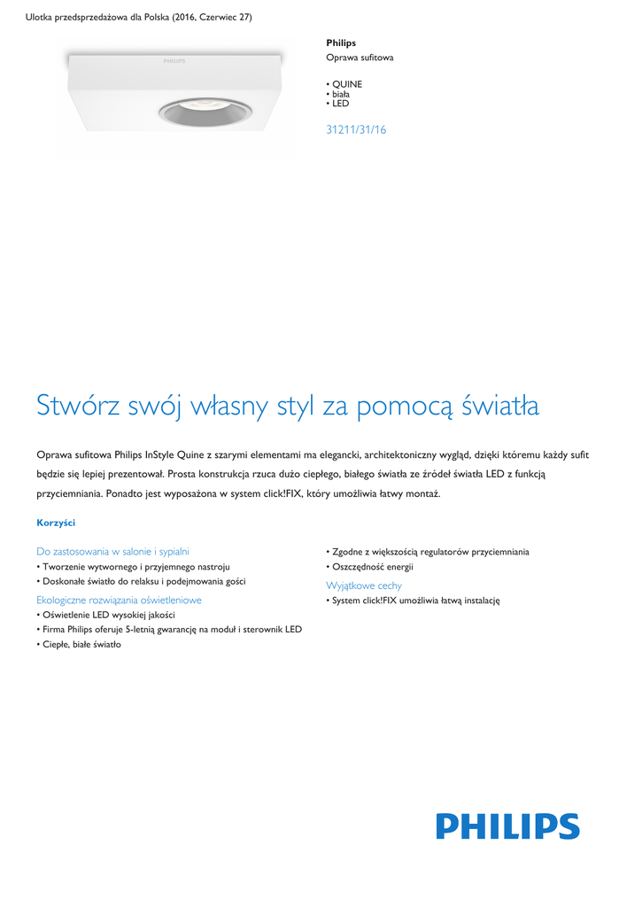 Ulotka przedsprzedażowa dla Polska (2016, Czerwiec 27) Philips Oprawa sufitowa • QUINE • biała • LED 31211/31/16 Stwórz swój własny styl za pomocą światła Oprawa sufitowa Philips InStyle Quine z szarymi elementami ma elegancki, architektoniczny wygląd, dzięki któremu każdy sufit będzie się lepiej prezentował. Prosta konstrukcja rzuca dużo ciepłego, białego światła ze źródeł światła LED z funkcją przyciemniania. Ponadto jest wyposażona w system click!FIX, który umożliwia łatwy montaż. Korzyści Do zastosowania w salonie i sypialni • Tworzenie wytwornego i przyjemnego nastroju • Doskonałe światło do relaksu i podejmowania gości Ekologiczne rozwiązania oświetleniowe • Oświetlenie LED wysokiej jakości • Firma Philips oferuje 5-letnią gwarancję na moduł i sterownik LED • Ciepłe, białe światło • Zgodne z większością regulatorów przyciemniania • Oszczędność energii Wyjątkowe cechy • System click!FIX umożliwia łatwą instalację Cechy Oświetlenie LED wysokiej jakości Oszczędność energii Technologia LED zastosowana w tej lampie firmy Philips to wyjątkowe rozwiązanie opracowane przez firmę Philips. Natychmiast się włącza, pozwala na uzyskanie optymalnej wydajności oświetlenia oraz podkreśla i ożywia kolory w Twoim domu. Ta energooszczędna lampa firmy Philips zużywa mniej energii niż tradycyjne źródła światła, co pozwala zmniejszyć rachunki za prąd i przyczynia się do ochrony środowiska. 5 lat gwarancji na system LED Oprócz standardowej 2-letniej gwarancji na tę lampę firma Philips oferuje 5letnią gwarancję na system LED, czyli moduł i sterownik LED zastosowany w lampie. Ciepłe, białe światło Światło może mieć różne temperatury barwowe oznaczane za pomocą jednostek zwanych kelwinami (K). Lampy o niskiej wartości kelwinów zapewniają ciepłe, bardziej przytulne światło, natomiast lampy o wysokiej wartości kelwinów dają chłodne, bardziej pobudzające światło. Ta lampa firmy Philips rzuca ciepłe, białe światło, które zapewnia przytulną atmosferę. Zgodne z większością regulatorów przyciemniania Tworzenie wytwornego nastroju Ta lampa została stworzona w oparciu o nowoczesne poczucie smaku, trendy i style życia. Doskonale wtapia się w wystrój wnętrza i pozwala stworzyć wymarzony, niepowtarzalny nastrój. Doskonałe światło do relaksu i podejmowania gości Salon jest sercem każdego domu — to miejsce przeznaczone do rodzinnych spotkań, odpoczynku i podejmowania gości. Oświetlenie w salonie i w sypialni powinno dawać dużą swobodę i możliwość dostosowania do potrzeb użytkowników, dzięki czemu będzie mogło sprostać ich wymaganiom w ciągu całego dnia. Przemyślane rozmieszczenie różnych typów oświetlenia i umiejętna zabawa światłem mogą nie tylko pomóc w stworzeniu wrażenia ciepła i otwartości, ale też sprawić, że pomieszczenie wyda się bardziej przestronne. Ta lampa LED firmy Philips jest wyposażona w najnowszą technologię LED, która współpracuje z większością regulatorów przyciemniania. Możesz użyć posiadanego regulatora lub dowolnego regulatora innego typu! System łatwego mocowania click!FIX Lampa LED wykorzystuje system click!FIX, czyli nowy, rewolucyjny system mocowania opatentowany przez firmę Philips. Korzystając z systemu click!FIX, można łatwo zamontować lampę w 4 prostych krokach. To proste i szybkie! Dane wkrótce ulegną zmianie 2016, Czerwiec 27 Specyfikacje Prosimy pamiętać, że jest to ulotka przedsprzedażowa. Treść ulotki jest zgodna z naszą najlepszą wiedzą w momencie publikacji i w odniesieniu do danego kraju (podane powyżej). Treść ulotki może ulec zmianie bez powiadomienia. Firma Philips nie ponosi odpowiedzialności za treść ulotki. Stylistyka i wykończenie Materiał Kolor Oprawa z możliwością przyciemniania LED Maksymalny okres eksploatacji Współczynnik IP metal biały Dodatkowe funkcje/akcesoria w zestawie Zgodne z większością regulatorów przyciemniania Wbudowane diody LED System mocowania click!FIX 5 lat gwarancji na moduł LED TAK TAK Klasa ochronności Źródło światła odpowiadające tradycyjnej żarówce o mocy TAK TAK Gwarancja 2,8 cm 16 cm 11 cm 0,345 kg Technologia źródła światła Liczba źródeł światła Moc źródła światła w zestawie Barwa światła Łączna moc strumienia świetlnego oprawy w lumenach IP20 ochrona przed przedmiotami powyżej 12,5 mm brak ochrony przed wodą I — uziemienie 35 W Przedział 220–240 V 50–60 Hz LED Bezpieczne, bardzo niskie napięcie 1 4,5 W ciepła biel 500 lm Dane wkrótce ulegną zmianie 2016, Czerwiec 27 Version: 3.0.1 EAN: 8718696127186 5 lat Wymiary i waga opakowania Dane techniczne Zasilanie sieciowe Tak 30 000 godz. Serwis Wymiary i waga produktu Wysokość Długość Szerokość Waga netto Tak Wysokość Długość Szerokość Waga 16,6 cm 12,3 cm 3,8 cm 0,415 kg Różne Opracowano z myślą o Styl Typ Salon i sypialnia Nowoczesna Oprawa sufitowa © 2016 Koninklijke Philips Electronics N.V. Wszelkie prawa zastrzeżone Dane mogą ulec zmianie bez uprzedniego powiadomienia. Znak towarowy jest własnością Koninklijke Philips Electronics N.V. lub odpowiednich podmiotów . www.philips.com