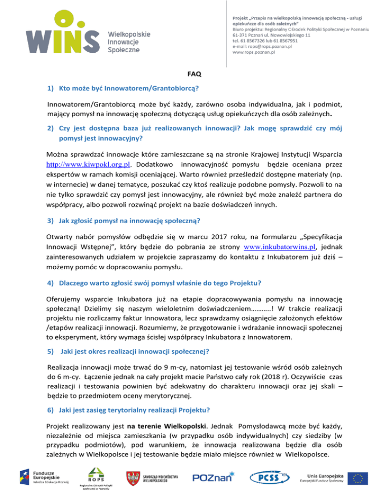 FAQ 1) Kto może być Innowatorem/Grantobiorcą? Innowatorem/Grantobiorcą może być każdy, zarówno osoba indywidualna, jak i podmiot, mający pomysł na innowację społeczną dotyczącą usług opiekuńczych dla osób zależnych. 2) Czy jest dostępna baza już realizowanych innowacji? Jak mogę sprawdzić czy mój pomysł jest innowacyjny? Można sprawdzać innowacje które zamieszczane są na stronie Krajowej Instytucji Wsparcia http://www.kiwpokl.org.pl. Dodatkowo innowacyjność pomysłu będzie oceniana przez ekspertów w ramach komisji oceniającej. Warto również prześledzić dostępne materiały (np. w internecie) w danej tematyce, poszukać czy ktoś realizuje podobne pomysły. Pozwoli to na nie tylko sprawdzić czy pomysł jest innowacyjny, ale również być może znaleźć partnera do współpracy, albo pozwoli rozwinąć projekt na bazie doświadczeń innych. 3) Jak zgłosić pomysł na innowację społeczną? Otwarty nabór pomysłów odbędzie się w marcu 2017 roku, na formularzu „Specyfikacja Innowacji Wstępnej”, który będzie do pobrania ze strony www.inkubatorwins.pl, jednak zainteresowanych udziałem w projekcie zapraszamy do kontaktu z Inkubatorem już dziś – możemy pomóc w dopracowaniu pomysłu. 4) Dlaczego warto zgłosić swój pomysł właśnie do tego Projektu? Oferujemy wsparcie Inkubatora już na etapie dopracowywania pomysłu na innowację społeczną! Dzielimy się naszym wieloletnim doświadczeniem………..! W trakcie realizacji projektu nie rozliczamy faktur Innowatora, lecz sprawdzamy osiągnięcie założonych efektów /etapów realizacji innowacji. Rozumiemy, że przygotowanie i wdrażanie innowacji społecznej to eksperyment, który wymaga ścisłej współpracy Inkubatora z Innowatorem. 5) Jaki jest okres realizacji innowacji społecznej? Realizacja innowacji może trwać do 9 m-cy, natomiast jej testowanie wśród osób zależnych do 6 m-cy. Łączenie jednak na cały projekt macie Państwo cały rok (2018 r). Oczywiście czas realizacji i testowania powinien być adekwatny do charakteru innowacji oraz jej skali – będzie to przedmiotem oceny merytorycznej. 6) Jaki jest zasięg terytorialny realizacji Projektu? Projekt realizowany jest na terenie Wielkopolski. Jednak Pomysłodawcą może być każdy, niezależnie od miejsca zamieszkania (w przypadku osób indywidualnych) czy siedziby (w przypadku podmiotów), pod warunkiem, że innowacja realizowana będzie dla osób zależnych w Wielkopolsce i jej testowanie będzie miało miejsce również w Wielkopolsce. 7) Na jakie wydatki może być przeznaczony grant? Granty mogą zostać przeznaczone jedynie na działania związane z realizacją innowacji społecznej i muszą mieć uzasadnienie merytoryczne wykazane w specyfikacji innowacji społecznej przygotowanej przez Pomysłodawcę/ Innowatora. Granty nie mają służyć doposażeniu jednostek, organizacji, czy instytucji, ale opracowaniu innowacji i jej przetestowaniu. W konsekwencji koszty przewidziane w budżetach innowacji powinny odzwierciedlać przede wszystkim koszt pracy nad innowacyjnym rozwiązaniem. Ponadto, zadaniem inkubatora jest też wsparcie organizacyjne grantobiorcy, eliminując tym samym część możliwych zakupów (np. w grancie nie powinno się finansować rzutników, sprzętu komputerowego służącego wypracowaniu innowacji itp.) Grant należy wydatkować zgodnie z przepisami prawa, w sposób racjonalny, w sposób celowy i efektywny w okresie realizacji projektu. Koszty administracyjne związane z wdrażaniem innowacji nie będą kwalifikowane. Dla przykładu jeśli innowacja będzie dotyczyć opracowania nowatorskich procedur działania, wydatki mogą dotyczyć wynagrodzenia dla ekspertów opracowujących/konsultujących procedurę, ale nie mogą dotyczyć kosztów księgowych realizacji zadania. 8) Czy osoby zależne, dla których planuję innowację społeczną muszą mieć orzeczenie o niepełnosprawności? Zgodnie z definicją z Procedur wsparcia osoba zależna to „Osoba zależna” – osoba, która ze względu na podeszły wiek, stan zdrowia lub niepełnosprawność wymaga opieki lub wsparcia związku z niemożnością samodzielnego wykonywania co najmniej jednej z podstawowych czynności dnia codziennego. Dlatego też zakładamy, że osobą zależną może być także osoba bez orzeczenia o niepełnosprawności. 9) Czy jako Grantobiorca muszę zapewnić trwałość innowacji po zakończeniu realizacji projektu? Trwałość projektu rozumiana jako utrzymanie projektu w określonym czasie po jego zakończeniu nie obowiązuje grantobiorców. Jednak projektując innowację społeczną należy przemyśleć i zaproponować sposób jej wdrożenia na stałe, w szerszej skali oraz utrzymania w ofercie ogólnodostępnych usług społecznych. Te kryteria (skalowalność, możliwość rozbudowywania, trwałość inkubowanej innowacji) stanowią kryteria oceny merytorycznej pomysłu (patrz. „Procedury wsparcia i wyboru Grantobiorców” – Zasady dokonywania oceny pomysłów w etapie I i II) . 10) Jestem przedsiębiorcą i chcę złożyć pomysł na innowację społeczną. Czy gdy uzyskam grant na realizację mojego pomysłu będę musiał zapłacić od jego wartości podatek? Nie. Na mocy art. 17, ust. 1, pkt 53 Ustawy o podatku dochodowym od osób prawnych środki finansowe otrzymane przez uczestnika projektu jako pomoc udzielona w ramach programu finansowanego z udziałem środków europejskich, o których mowa w ustawie z dnia 27 sierpnia 2009 r. o finansach publicznych (Dz. U. z 2016 r. poz. 1870 i 1948) są wolne od podatku dochodowego. 11) Gdy Innowatorem jest osoba fizyczna - czy z tytułu wpłynięcia na jej konto grantu np. 100 tys. zł jest zobligowana do zgłoszenia tego faktu w Urzędzie Skarbowym, czy podlega opodatkowaniu i czy i jak musi "rozliczyć" grant w ramach ordynacji podatkowej? Nie. Na mocy art. 21, ust. 1, pkt 137 Ustawy o podatku dochodowym od osób fizycznych środki finansowe otrzym