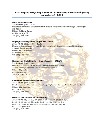Plan imprez Miejskiej Biblioteki Publicznej w Rudzie Śląskiej na kwiecień 2016 Kolorowa biblioteka 2016-04-01, godz. 15.30 Prezentacja nowości książkowych dla dzieci z okazji Międzynarodowego Dnia Książki dla Dzieci. Filia nr 4, Nowy Bytom ul. Niedurnego 69 Tel. (32) 248 51 61 Międzynarodowy Dzień Książki dla Dzieci 2016-04-01, godz. 11.00 – 18.00 Konkursy i pogadanki, czytanie bajek i opowiadań dla dzieci ze szkół i przedszkoli z okazji święta książki. Filia nr 15, Kochłowice ul. Brzozowa 4 Tel. (32) 242 78 18 Dyskusyjny Klub Książki – Klub Literacki – BARWY 2016-04-01, godz. 18.00 Dyskusja o książce Iana Rankina „Stojąc w cudzym grobie”, Turniej Jednego Wiersza oraz Warsztaty Literackie. Filia nr 16, Ruda ul. Wolności 20 Tel. (32) 248 13 18 Kazimierz Szymeczko opowiada 2016-04-01, godz. 10.00 Spotkanie autorskie z pisarzem z okazji Międzynarodowego Dnia Książki dla Dzieci. Filia nr 18, Halemba ul. 1 Maja 32 Tel. (32) 242 67 92 Gimnastyka zdrowotna (ProEthica) 2016-04-01, 08, 15, 22, 29, godz. 8.00 – 11.00, grupa A, B, C 2016-04-04, 11, 18, 25, godz. 9.00 – 11.45, grupa A, B, C MBP CIS - Centrum Inicjatyw Społecznych "Stara Bykowina" ul. 11 Listopada 15a. Tel. (32) 707 43 03 Zbiórki harcerskie (ZHP) 2016-04-01, 08, 15, 22, 29, godz. 16.00 – 19.00, Zuchy 2016-04-02, 09, 16, 23, 30, godz. 9.00 – 11.00, Harcerze MBP CIS - Centrum Inicjatyw Społecznych "Stara Bykowina" ul. 11 Listopada 15a. Tel. (32) 707 43 03 Zajęcia literacko-plastyczne dla dzieci 2016-04-02, 16, 30, godz. 9.30 – 11.00 Biblioteka Centralna, (Oddział dla Dzieci), Wirek ul. Dąbrowskiego 18 Tel. (32) 242 05 86 wew. 49 Hiphopaki tańczą 2016-04-02, 09, 16, 23, 30 (soboty), godz. 9.00 – 12.00 2016-04-06, 13, 20, 27 (środy), godz. 17.00 – 18.00 Zajęcia rytmiczne i tańca hip hop dla dzieci. Animator zajęć – Justyna Rak (794 274 333). Filia nr 18, Halemba ul. 1 Maja 32 Tel. (32) 242 67 92 Tenis stołowy (ZHP) 2016-04-02, 09, 16, 23, 30, godz. 11.00 – 13.00 MBP CIS - Centrum Inicjatyw Społecznych "Stara Bykowina" ul. 11 Listopada 15a. Tel. (32) 707 43 03 Liga Play Station (ZHP) 2016-04-02, 09, 16, 23, 30, godz. 10.00 – 13.00 MBP CIS - Centrum Inicjatyw Społecznych "Stara Bykowina" ul. 11 Listopada 15a. Tel. (32) 707 43 03 Świętujemy Międzynarodowy Dzień Książki dla Dzieci 2016-04-04, godz. 9.00 – 11.00 Impreza multimedialna we współpracy z Mediateką. Biblioteka Centralna, (Oddział dla Dzieci), Wirek ul. Dąbrowskiego 18 Tel. (32) 242 05 86 wew. 49 Międzynarodowy Dzień Książki dla Dzieci 2016-04-04, 05, 06, godz. 9.00 Spotkania tematyczne dla uczniów Szkoły Podstawowej. Filia nr 1, Ruda ul. Fiołków 10b Tel. (32) 248 18 79 Czytanie na śniadanie 2016-04-04, 11, 18, 19, 25, godz. 9.00 Głośne czytanie bajek w przedszkolu. Filia nr 8, Halemba – Kłodnica ul. Kaczmarka 38 Tel. (32) 243 23 41 Fitness i zumba 2016-04-04, 11, , 18, , 25, w godz. 17.00 – 18.00, grupa I, w godz. 18.00-19.00 – grupa II 2016-04-07, 14, 21, 28, w godz. 18.00 – 19.00, grupa I, w godz. 19.00 – 20.00, grupa II MBP CIS - Centrum Inicjatyw Społecznych „Stary Orzegów” ul. Kard. A. Hlonda 29 Tel. (32) 248 36 37 Złoty środek, czyli spotkania z jogą 2016-04-04, 11, 18, 25, godz. 17.00 – 18.30 Zajęcia prowadzone przez Grażynę Kotlorz (karnet - 60 zł, pojedyncze wejście – 25 zł) Filia nr 18, Halemba ul. 1 Maja 32 Tel. (32) 242 67 92 Spotkanie członków Polskiego Związku Emerytów, Rencistów i Inwalidów w Rudzie Śląskiej 2016-04-04, 11, 18, 25, godz. 12.30 – 14.30 Filia nr 18, Halemba ul. 1 Maja 32 Tel. (32) 242 67 92 Kółko Skata (ZHP) 2016-04-04, 11, 18, 25, godz. 16.00 – 19.00 MBP CIS - Centrum Inicjatyw Społecznych "Stara Bykowina" ul. 11 Listopada 15a. Tel. (32) 707 43 03 Rękodzieło (ProEthica) 2016-04-04, 11, 18, 25, godz. 17.00 – 19.00 MBP CIS - Centrum Inicjatyw Społecznych "Stara Bykowina" ul. 11 Listopada 15a. Tel. (32) 707 43 03 Tylko dzięki smutkowi mogę się odnaleźć 2016-04-05, godz. 17.00 Spotkanie autorskie z poetą Janem Baronem. Filia nr 15, Kochłowice ul. Brzozowa 4 Tel. (32) 242 78 18 Klub Plastyczny Rudzik 2016-04-05, godz. 11.00 Ilustracja do ulubionej baśni. Filia nr 16, Ruda ul. Wolności 20 Tel. (32) 248 13 18 Spotkania członków Śląskiego Stowarzyszenia Diabetyków 2016-04-05, 12, 19, 26, godz. 11.00 – 14.00 Filia nr 18, Halemba ul. 1 Maja 32 Tel. (32) 242 67 92 Taniec towarzyski dance funky 2016-04-05, 12, 19, 26, godz. 17.00 – 18.00 Zajęcia ruchowo-taneczne dla dzieci (Fabryka Tańca /10 zł-1h/ 535 888 745). Filia nr 18, Halemba ul. 1 Maja 32 Tel. (32) 242 67 92 Zajęcia taneczne dla dorosłych 2016-04-05, 12, 19, 26, godz. 18.00 – 19.00 2016-04-05, 12, 19, 26, godz. 19.00 – 20.00 Bachata, Zouk i inne / Fabryka Tańca. Filia nr 18, Halemba ul. 1 Maja 32 Tel. (32) 242 67 92 Język angielski (Pro Ethica) 2016-04-05, 12, 19, 26, godz. 10.00 – 12.00 MBP CIS - Centrum Inicjatyw Społecznych "Stara Bykowina" ul. 11 Listopada 15a. Tel. (32) 707 43 03 Grupa artystyczna „Inspiracje” (ProEthica) 2016-04-05, 12, 19, 26, godz. 11.30 – 13.30 Malarstwo – warsztaty. MBP CIS - Centrum Inicjatyw Społecznych "Stara Bykowina" ul. 11 Listopada 15a. Tel. (32) 707 43 03 Zajęcia śpiewu (ProEthica) 2016-04-05, 12, 19, 26, godz. 14.00 – 15.00 MBP CIS - Centrum Inicjatyw Społecznych "Stara Bykowina" ul. 11 Listopada 15a. Tel. (32) 707 43 03 Rękodzieło artystyczne (ProEthica) 2016-04-05, 12, 19, 26, godz. 16.00 – 19.00 MBP CIS - Centrum Inicjatyw Społecznych "Stara Bykowina" ul. 11 Listopada 15a. Tel. (32) 707 43 03 Poznajemy polskie góry: Góry Świętokrzyskie 2016-04-06, godz. 9.00 Głośne czytanie dzieciom w Przedszkolu nr 17. Filia nr 4, Nowy Bytom ul. Niedurnego 69 Tel. (32) 248 51 61 Głośne czytanie bajek w Przedszkolu nr 14 2016-04-06, godz. 10.00 Filia nr 4, Nowy Bytom ul. Niedurnego 69 Tel. (32) 248 51 61 Moja nowa biblioteka 2016-04-06, godz. 16.00 Konkurs plastyczny dla dzieci.