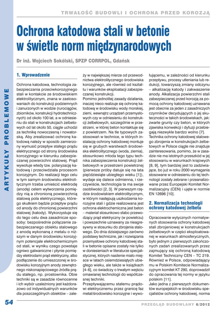 T rwa łość budo wli i o ch ro n a prz e d ko ro zj ą Ochrona katodowa stali w betonie w świetle norm międzynarodowych Dr inż. Wojciech Sokólski, SPZP CORRPOL, Gdańsk A R T YKUŁY P R OBLE M OWE 1. Wprowadzenie 54 Ochrona katodowa, technologia zabezpieczania przeciwkorozyjnego stali w kontakcie ze środowiskiem elektrolitycznym, znana w zastosowaniach do konstrukcji podziemnych i zanurzonych w wodzie (rurociągów, zbiorników, konstrukcji hydrotechnicznych) od około 100 lat, a w odniesieniu do stali w konstrukcjach żelbetowych od lat około 50, ciągle uchodzi za technikę nowoczesną i nowatorską. Aby zrealizować ochronę katodową należy w sposób zamierzony wymusić przepływ stałego prądu elektrycznego od strony środowiska korozyjnego w kierunku zabezpieczanej powierzchni stalowej. Prąd wywołuje wtedy tzw. polaryzację katodową i przeciwdziała procesom korozyjnym. Do realizacji tego celu w tym samym środowisku elektrolitycznym trzeba umieścić elektrodę (anodę) celem wytworzenia pomiędzy nią a chronioną powierzchnią stalową pola elektrycznego, którego skutkiem będzie przepływ prądu od anody do chronionej powierzchni stalowej (katody). Wykorzystuje się do tego celu dwa zasadnicze sposoby: bezpośrednie połączenie zabezpieczanego obiektu stalowego z anodą wykonaną z metalu o niższym w danym środowisku korozyjnym potencjale elektrochemicznym od stali, w wyniku czego powstaje ogniwo galwaniczne i płynie pomiędzy elektrodami prąd elektryczny, albo podłączenie do umieszczonej w środowisku korozyjnym anody zewnętrznego niskonapięciowego źródła prądu stałego, np. prostownika. Obie techniki są w zasadzie równocenne i ich wybór uzależniony jest każdorazowo od indywidualnych warunków dla poszczególnych obiektów – zale- ży w największej mierze od przewodnictwa elektrolitycznego środowiska korozyjnego, ale również od kształtu i warunków eksploatacji zabezpieczanej konstrukcji. Pomimo jednolitej zasady działania, inaczej nieco realizuje się ochronę katodową w środowisku wody morskiej, ziemi, wewnątrz urządzeń przemysłowych czy w odniesieniu do konstrukcji żelbetowych, szczególnie w przestrzeni, w której beton kontaktuje się z powietrzem. Na tle typowych zastosowań w technice, w których instalację ochrony katodowej montuje się w grubych warstwach środowiska elektrolitycznego (woda, ziemia), stosunkowo młoda tego typu technika zabezpieczenia konstrukcji żelbetowych w przestrzeni powietrznej (pierwsze próby datuje się na lata pięćdziesiąte ubiegłego wieku [1]), wydaje się dalece odmienna, i rzeczywiście, technologia ta ma swoje osobliwości [2, 3]. W pierwszym rzędzie środowiskiem elektrolitycznym, w którym następują uszkodzenia korozyjne stali i gdzie realizowana jest ochrona elektrochemiczna jest beton – materiał stosunkowo słabo przewodzący prąd elektryczny (w powietrzu) i powszechnie uznawany za nieagresywny w stosunku do zbrojenia stalowego. Do dnia dzisiejszego zarówno podstawy techniczne, jak i rozwiązania przemysłowe ochrony katodowej stali w betonie opisane zostały nie tylko w doniesieniach w literaturze specjalistycznej, których nasilenie miało miejsce w latach osiemdziesiątych ubiegłego wieku, ale także w książkach [4–6], co świadczy o trwałym wejściu omawianej technologii do współczesnej techniki. Przepływającemu stałemu prądowi elektrycznemu przez granicę faz metal/środowisko korozyjne i wywo- łującemu, w zależności od kierunku przepływu, procesy utleniania lub redukcji, towarzyszą zmiany odczynu – alkalizację katody i zakwaszenie anody. Alkalizacja powierzchni stali zabezpieczanej przed korozją za pomocą ochrony katodowej uznawana jest obecnie za jeden z zasadniczych czynników decydujących o jej skuteczności w takich środowiskach, jak: zwarte grunty czy beton, w których zjawiska konwekcji i dyfuzji przebiegają niezwykle bardzo wolno [7]. Technika ochrony katodowej stalowego zbrojenia w konstrukcjach żelbetowych w Polsce ciągle nie znajduje zainteresowania, pomimo, że w zasadzie nie ma istotnych przeszkód w jej stosowaniu w warunkach krajowych [8, 9], tym bardziej jest to zadziwiające, bo już w roku 2000 wymagania stosowane w odniesieniu do tej technologii zostały zebrane i przeanalizowane przez Europejski Komitet Normalizacyjny (CEN) i ujęte w normie EN 12696 [10]. 2. Normalizacja technologii ochrony katodowej żelbetu Opracowanie wytycznych normatywnych stosowania ochrony katodowej stali zbrojeniowej w konstrukcjach żelbetowych w części eksploatowanej w warunkach atmosferycznych, było jednym z pierwszych zakończonych zadań zrealizowanych przez zajmujący się ochroną katodową Komitet Techniczny CEN – TC 219. Również w Polsce, odpowiadający mu w Polskim Komitecie Normalizacyjnym komitet KT 290, doprowadził do opracowania tej normy w języku polskim [11]. Jako jedna z pierwszych dokumentów europejskich w środowisku specjalistów ochrony katodowej, norma PRz eg l Ąd bu d owl any 6/2012 T rwa łoś ć b ud ow li i ochrona prz e d ko ro z ją Sektory kompetencji personelu ochrony katodowej wg EN 15257 Konstrukcje podziemne i zanurzone Konstrukcje metalowe morskie Konstrukcje żelbetowe Powierzchnie wewnętrzne konstrukcji Rys. 1. Podział kompetencji personelu w technologii ochrony katodowej wg normy EN 15257 petencji personelu ochrony katodowej, w której ochrona katodowa stali w betonie jest jednym z sektorów zastosowań tej technologii [12] – rys. 1. Od tego czasu wszystkie nowelizowane i nowe normy dotyczące technologii ochrony katodowej wydawane przez CEN zaopatrzone są w preambułę dotyczącą wymagań w odniesieniu do osób – analogicznie do zacytowanego wyżej pkt. 4.2 normy EN 12696. Prace nad nowelizacją normy europejskiej EN 12696, które zgodnie z założeniami powinny odbywać się około 5 lat, zbiegły się z rozpoczętymi w tym samym okresie działaniami na rzecz opracowania – na rzecz ochro